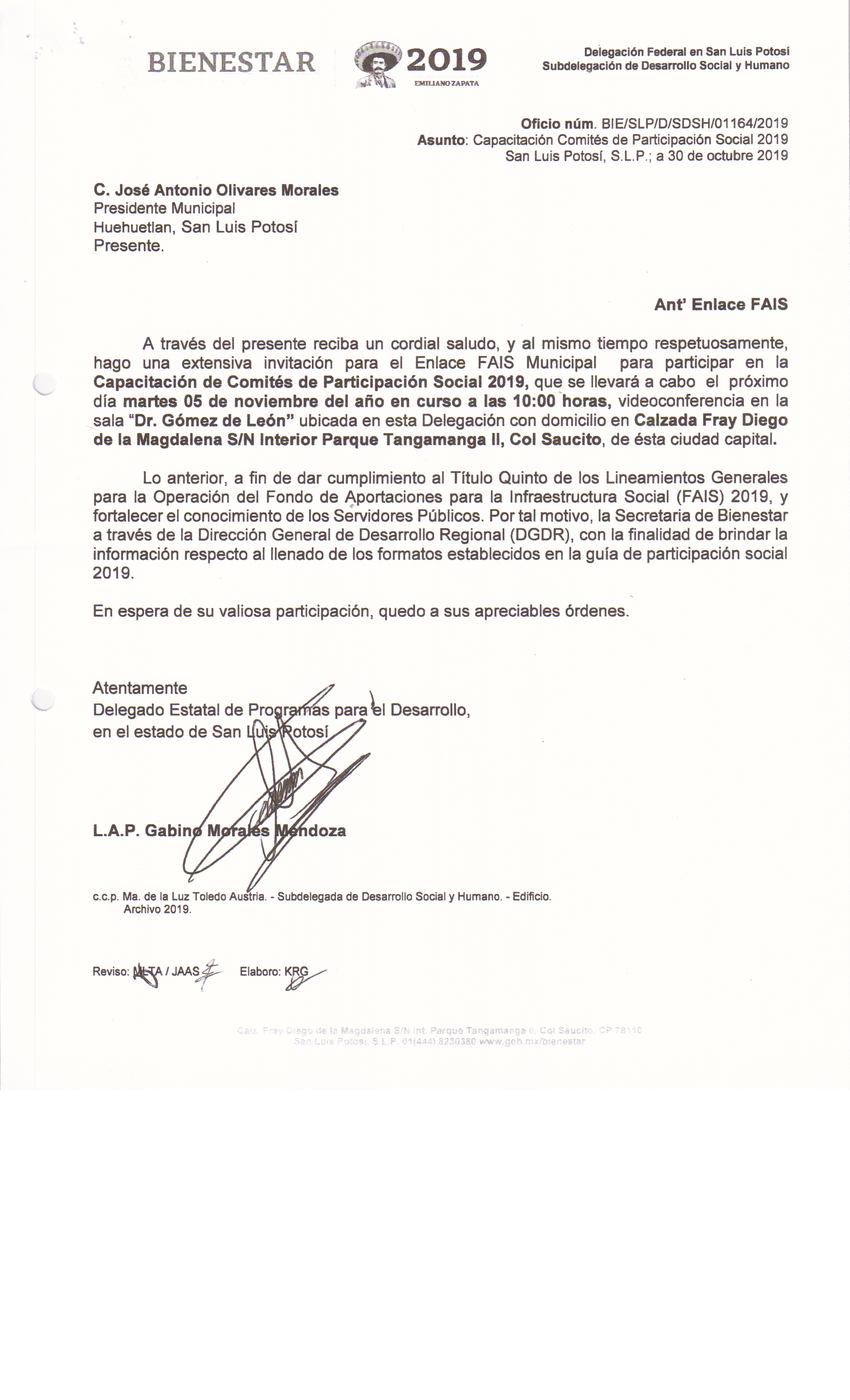 2019 01/11/2019 30/11/2019 Funcionario AUXILIAR GENERAL DE LA COORDINACION AUXILIAR GENERAL DE LA COORDINACION AUXILIAR GENERAL DE LA COORDINACION COORDINACION DE DESARROLLO SOCIAL JUAN DIEGO HERNANDEZ HERNANDEZ Viáticos CAPACITACION DE COMITES DE PARTICIPACION SOCIAL 2019 Nacional 0 $2,500.00 MEXICO SAN LUIS POTOSI HUEHUETLAN MEXICO SAN LUIS POTOSI HUEHUETLAN INSTALACIONES DE LA SALA "DR. GOMEZ DE LEON DELEGACION DE BIENESTAR EN SAN LUIS POTOSI 05/11/2019 06/11/2019 1CDS $2,500.00 $0.00 05/11/2019 http://www.cegaipslp.org.mx/HV2019Tres.nsf/nombre_de_la_vista/E30CF891EB55ED69862584CC0057795D/$File/comision.png 1CDS http://www.cegaipslp.org.mx/HV2019Tres.nsf/nombre_de_la_vista/682A5D801D8DC3E8862584CC0057A5A0/$File/NORMA+PARA+ARMONIZAR+LA+PRESENTACION+DE+LA+INFORMACION+ADICIONAL.pdf Tesoreria Municipal 10/12/2019 10/12/2019 NO SE GENERO NOTA