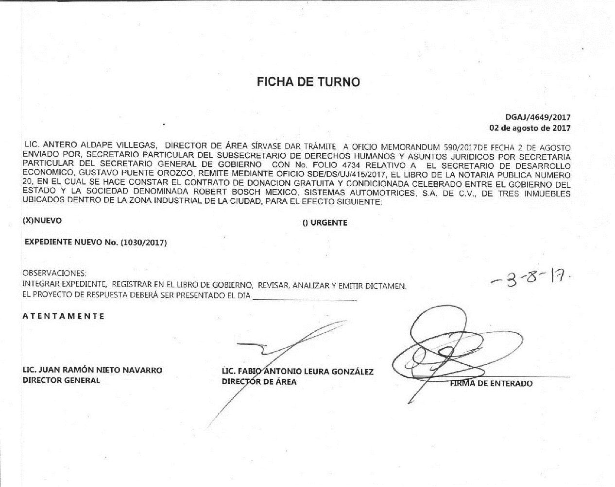 2017 31/08/2017 EL SECRETARIO DE DESARROLLO ECONOMICO, GUSTAVO PUENTE OROZCO, REMITE MEDIANTE OFICIO SDE/DS/UJ/415/2017, EL LIBRO DE LA NOTARIA PUBLICA NUMERO 20, EN EL CUAL SE HACE CONSTAR EL CONTRATO DE DONACION GRATUITA Y CONDICIONADA CELEBRADO ENTRE EL GOBIERNO DEL ESTADO Y LA SOCIEDAD DENOMINADA ROBERT BOSCH MEXICO, SISTEMAS AUTOMOTRICES, S.A. DE C.V., DE TRES INMUEBLES UBICADOS DENTRO DE LA ZONA INDUSTRIAL DE LA CIUDAD SIN FECHA DE ESPECIFICACIÓN SEDECO ROBERTH BOSCH DE MEXICO SEDECO ROBERTH BOSCH DE MEXICO GOB. EDO.S.L.P. PREDIOS ZONA INDUSTRIAL SIN CONOCER VIGENTE SIN CONCLUIR NO SE GENERÓ http://www.cegaipslp.org.mx/webcegaip.nsf/nombre_de_la_vista/097BAD5F17D81C7E8625818E005F59B8/$File/DOCUMENTO+8.jpg NO SE GENERÓ 31/08/2017 DIRECCIÓN GENERAL DE ASUNTOS JURÍDICOS 2017 01/09/2017