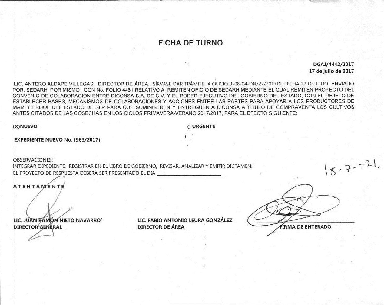 2017 31/08/2017 REMITEN OFICIO DE SEDARH MEDIANTE EL CUAL REMITEN PROYECTO DEL CONVENIO DE COLABORACION ENTRE DICONSA S.A. DE C.V. Y EL PODER EJECUTIVO DEL GOBIERNO DEL ESTADO, CON EL OBJETO DE ESTABLECER BASES, MECANISMOS DE COLABORACIONES Y ACCIONES ENTRE LAS PARTES PARA APOYAR A LOS PRODUCTORES DE MAIZ Y FRIJOL DEL ESTADO DE SLP PARA QUE SUMINISTREN Y ENTREGUEN A DICONSA A TITULO DE COMPRAVENTA LOS CULTIVOS ANTES CITADOS DE LAS COSECHAS EN LOS CICLOS PRIMAVERA-VERANO 2017/2017 SIN FECHA DE ESPECIFICACIÓN SEDARH DICONSA SEDARH DICONSA GOB. EDO.S.L.P. APOYAR ALOS PRODUCTORES DE MAIZ Y FRIJOL DEL ESTADO SIN CONOCER VIGENTE SIN CONCLUIR NO SE GENERÓ http://www.cegaipslp.org.mx/webcegaip.nsf/nombre_de_la_vista/14D381915E16C9488625818E005E991D/$File/DOCUMENTO+4.jpg NO SE GENERÓ 31/08/2017 DIRECCIÓN GENERAL DE ASUNTOS JURÍDICOS 2017 01/09/2017