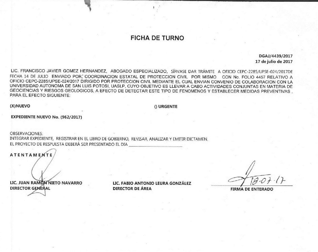 2017 31/08/2017 OFICIO CEPC-2285/UPSE-024/2017 DIRIGIDO POR PROTECCION CIVIL MEDIANTE EL CUAL ENVIAN CONVENIO DE COLABORACION CON LA UNIVERSIDAD AUTONOMA DE SAN LUIS POTOSI, UASLP, CUYO OBJETIVO ES LLEVAR A CABO ACTIVIDADES CONJUNTAS EN MATERIA DE GEOCIENCIAS Y RIESGOS GEOLOGICOS, A EFECTO DE DETECTAR ESTE TIPO DE FENOMENOS Y ESTABLECER MEDIDAS PREVENTIVAS. SIN FECHA DE ESPECIFICACIÓN PROTECCIÓN CIVIL UNIVERSIDAD AUTONOMA DE SAN LUIS POTOSI PROTECCIÓN CIVIL UNIVERSIDAD AUTONOMA DE SAN LUIS POTOSI GOB. EDO.S.L.P. LLEVAR A CABO ACTIVIDADES CONJUNTAS EN MATERIA DE GOECIENCIAS Y RIESGOS GEOLOGICOS FENOMENOS Y ESTABLECER MEDIDAS PREVENTIVAS SIN CONOCER VIGENTE SIN CONCLUIR NO SE GENERÓ http://www.cegaipslp.org.mx/webcegaip.nsf/nombre_de_la_vista/70267655E69883568625818E005E46C5/$File/DOCUMENTO+1.jpg NO SE GENERÓ 31/08/2017 DIRECCIÓN GENERAL DE ASUNTOS JURÍDICOS 2017 01/09/2017