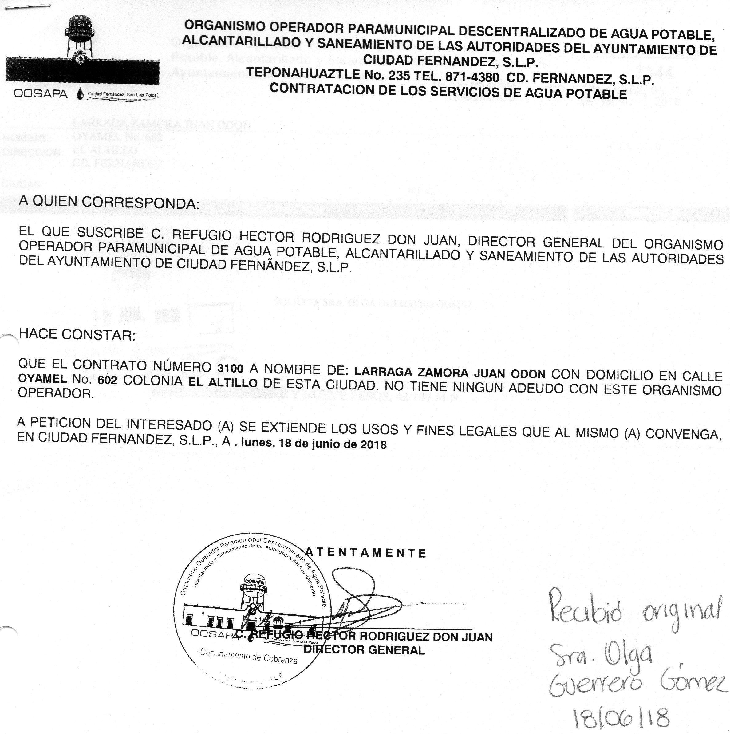 2018 1 de junio del 2018 30 de junio del 2018 CARTA DE NO ADEUDO TODO TIPO DE USUARIO MAYOS DE EDAD PARA FINES DEL INTERESADO EN ALGUN TRAMITE DE SU CONVENIENCIA CARTA DE NO ADEUDO http://www.cegaipslp.org.mx/webcegaip2018N2.nsf/nombre_de_la_vista/CF11BEB1BC928AF1862582CC006103AD/$File/CARTA+DE+NO+ADEUDO.jpg IDENTIFICACION http://www.cegaipslp.org.mx/webcegaip2018N2.nsf/nombre_de_la_vista/CF11BEB1BC928AF1862582CC006103AD/$File/CARTA+DE+NO+ADEUDO.jpg INMEDIATA INDEFINIDA 3 GRATUITO CUOTAS Y TARIFAS 2018 4 LEY DE AGUAS PARA EL ESTADO DE S.L.P DERECHO DE REPLICA,PRORROGA.QUEJA 5 OOSAPA_COBRANZA_@HOTMAIL.COM http://www.cegaipslp.org.mx/webcegaip2018N2.nsf/nombre_de_la_vista/651B17C31BF87FE3862582CC005FBD3F/$File/XLIIA.docx http://www.cegaipslp.org.mx/webcegaip2018N2.nsf/nombre_de_la_vista/651B17C31BF87FE3862582CC005FBD3F/$File/XLIIA.docx ATENCION A USUARIOS AREA DE COBRANZA 16/08/2018 16/07/2018 NGI