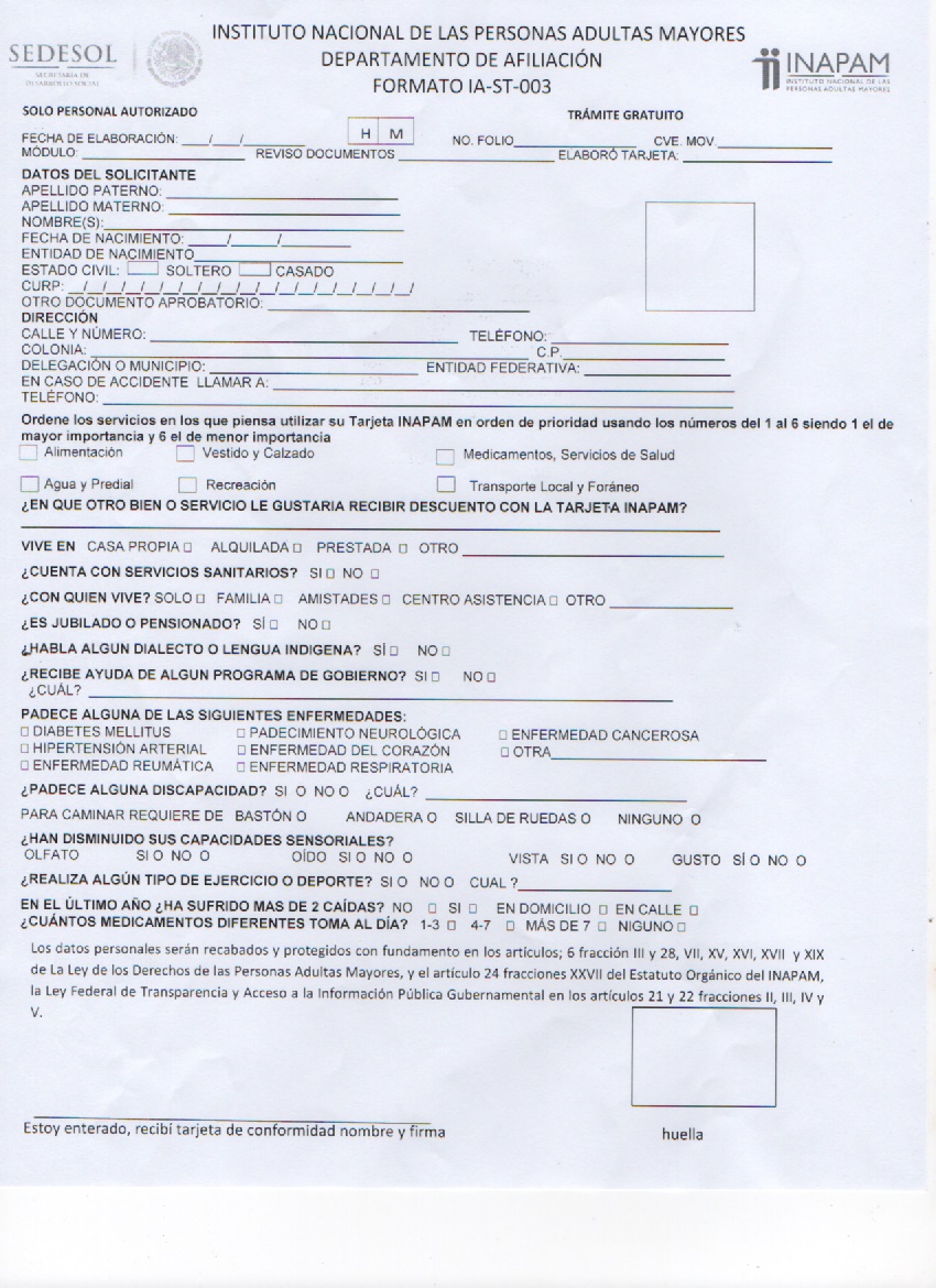 2019 01/03/2019 31/03/2019 INAPAM Directo ADULTOS MAYORES DE 60 AÑOS Y MAS Órgano descentralizado de la Administración Pública Federal, con personalidad jurídica y patrimonios propios y autonomía técnica y de gestión para el cumplimiento de sus atribuciones, sus objetivos y fines son apoyar y verificar que se cumpla la Ley de los Derechos de las Personas Adultas Mayores. PRESENCIAL 60 AÑOS CUMPLIDOS COPIA DE LA CURP COPIA DE SU CREDENCIAL DE LECTOR DOS FOTOGRAFIAS TAMAÑO INFANTIL http://www.cegaipslp.org.mx/HV2019.nsf/69BFE879BA7B675B86258399006855D2/$file/INAPAM%20FORMATO.jpg 1 MES 2 GRATUITO GRATUITO GRATUITO MANUAL DE ORGANIZACIÓN DERECHOS DEL ADULTO MAYOR CAPITULLO II ARTICULS 48-49 2 http://www.municipiorayonslp.gob.mx/2018-2021/ http://www.cegaipslp.org.mx/HV2019.nsf/29CC2396DC48DD608625837E00595785/$file/MANUAL%20DE%20ORGANIZACION%20RAYON,S.L.P.docx INAPAM 09/04/2019 09/04/2019 NADA QUE MANIFESTAR