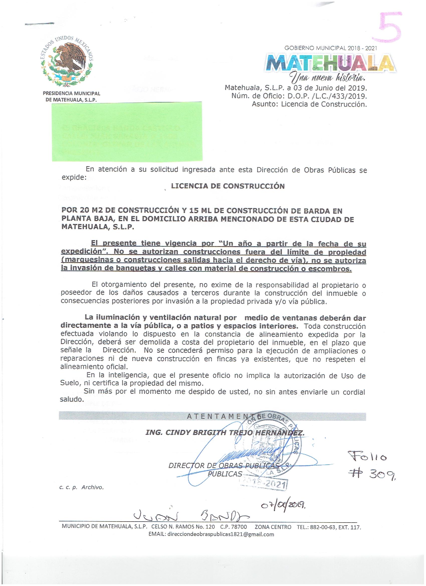 2019 01/06/2019 30/06/2019 D.O.P./L.C./439/2019 OBTENER PERMISO DE CONSTRUCCIÓN EDUARDO VAZQUEZ GRIMALDO N/A CALLE DURANGO 108 0 COLONIA REPUBLICA 20 MATEHUALA 20 MATEHUALA 24 San Luis Potosí 78740 "http://www.cegaipslp.org.mx/HV2019Dos.nsf/nombre_de_la_vista/24467889E79565C68625842B00612B28/$File/01+EDUARDO+VAZQUEZ+GRIMALDO.jpg " 05/06/2019 05/06/2020 HABITACIONAL "http://www.cegaipslp.org.mx/HV2019Dos.nsf/nombre_de_la_vista/894CC32F2F7511D98625842C005B303C/$File/01+EDUARDO+VAZQUEZ+GRIMALDO.jpg " DIRECCIÓN DE OBRAS PÚBLICAS 04/08/2019 04/07/2019 N/A