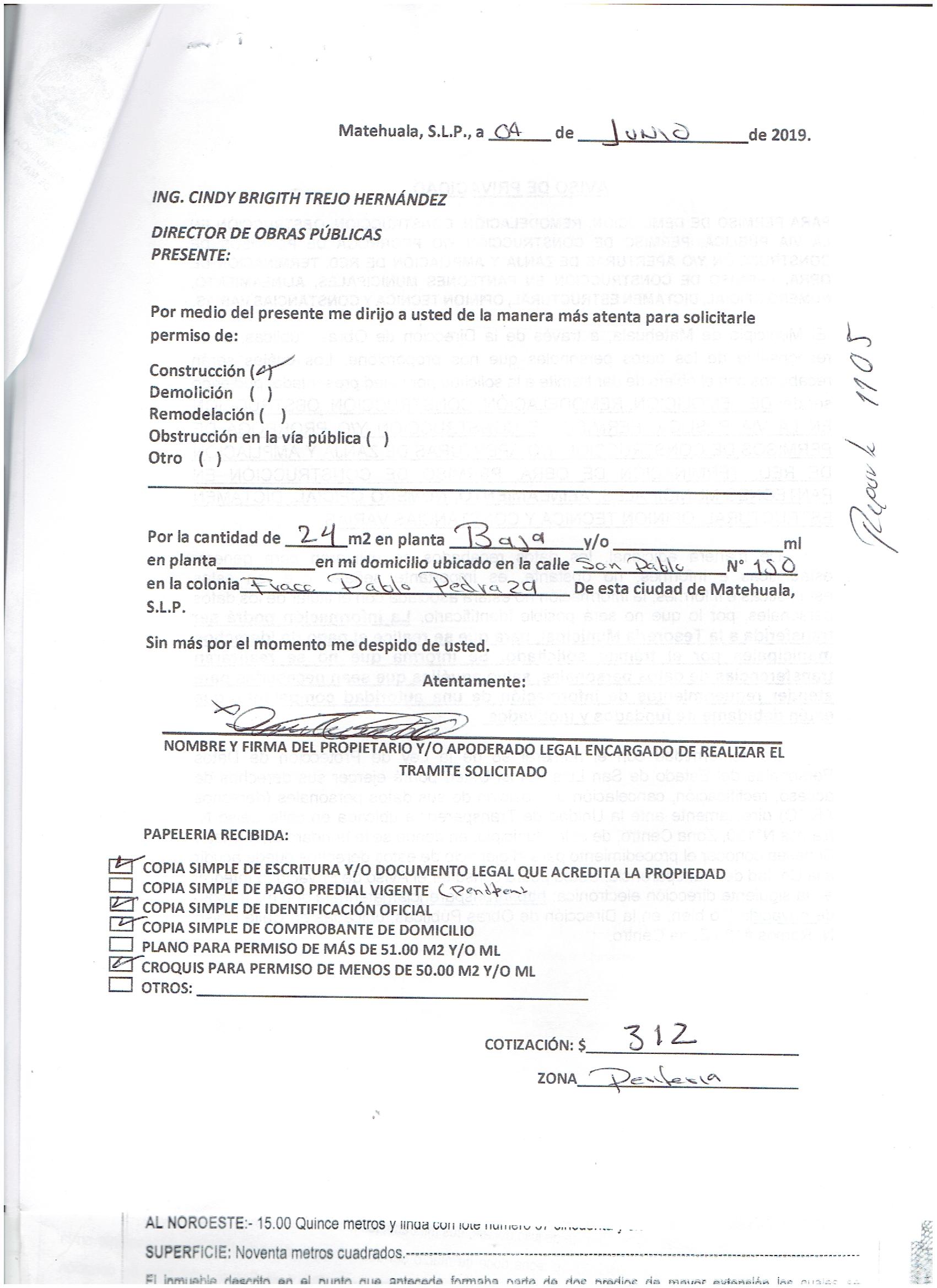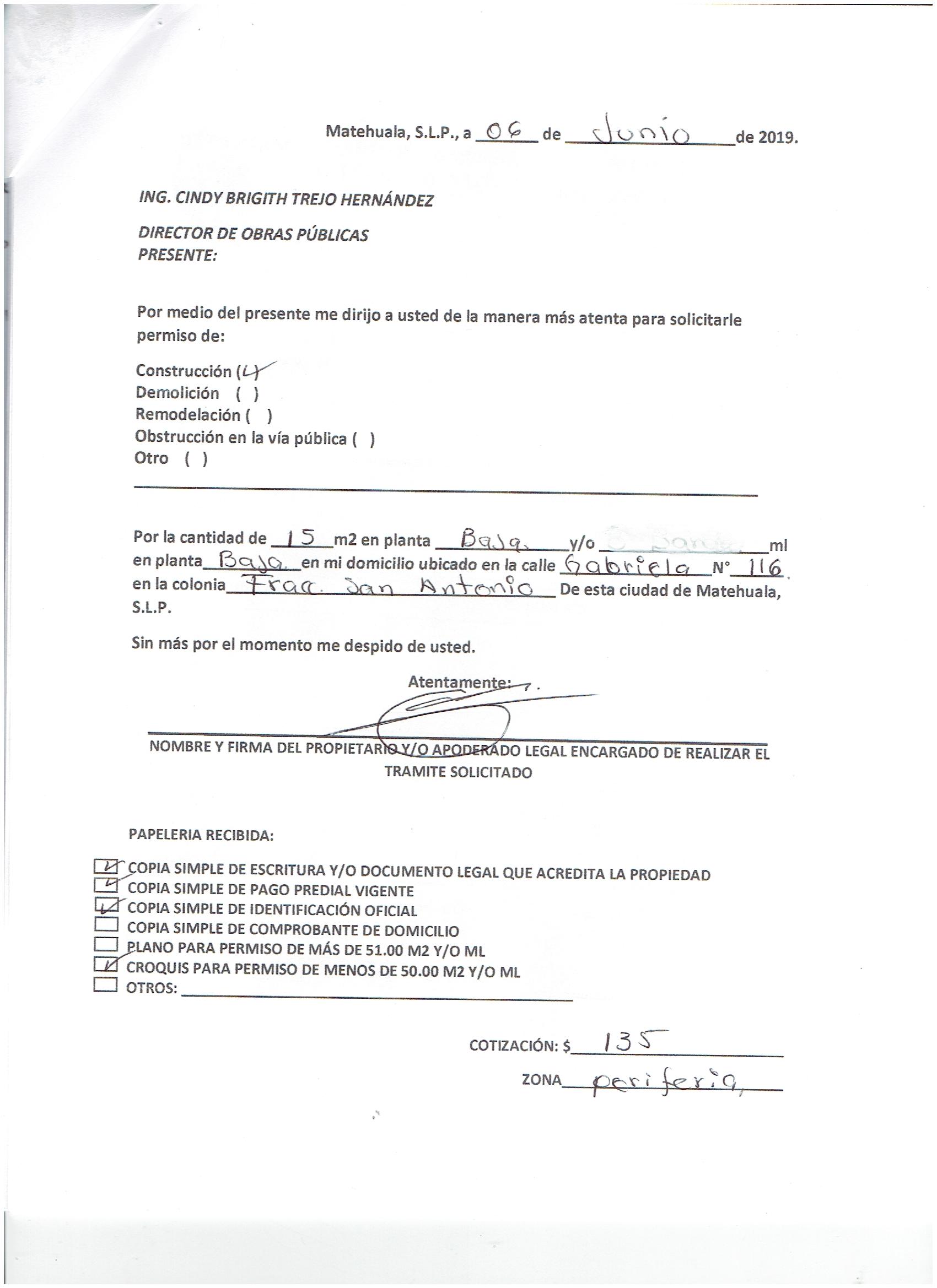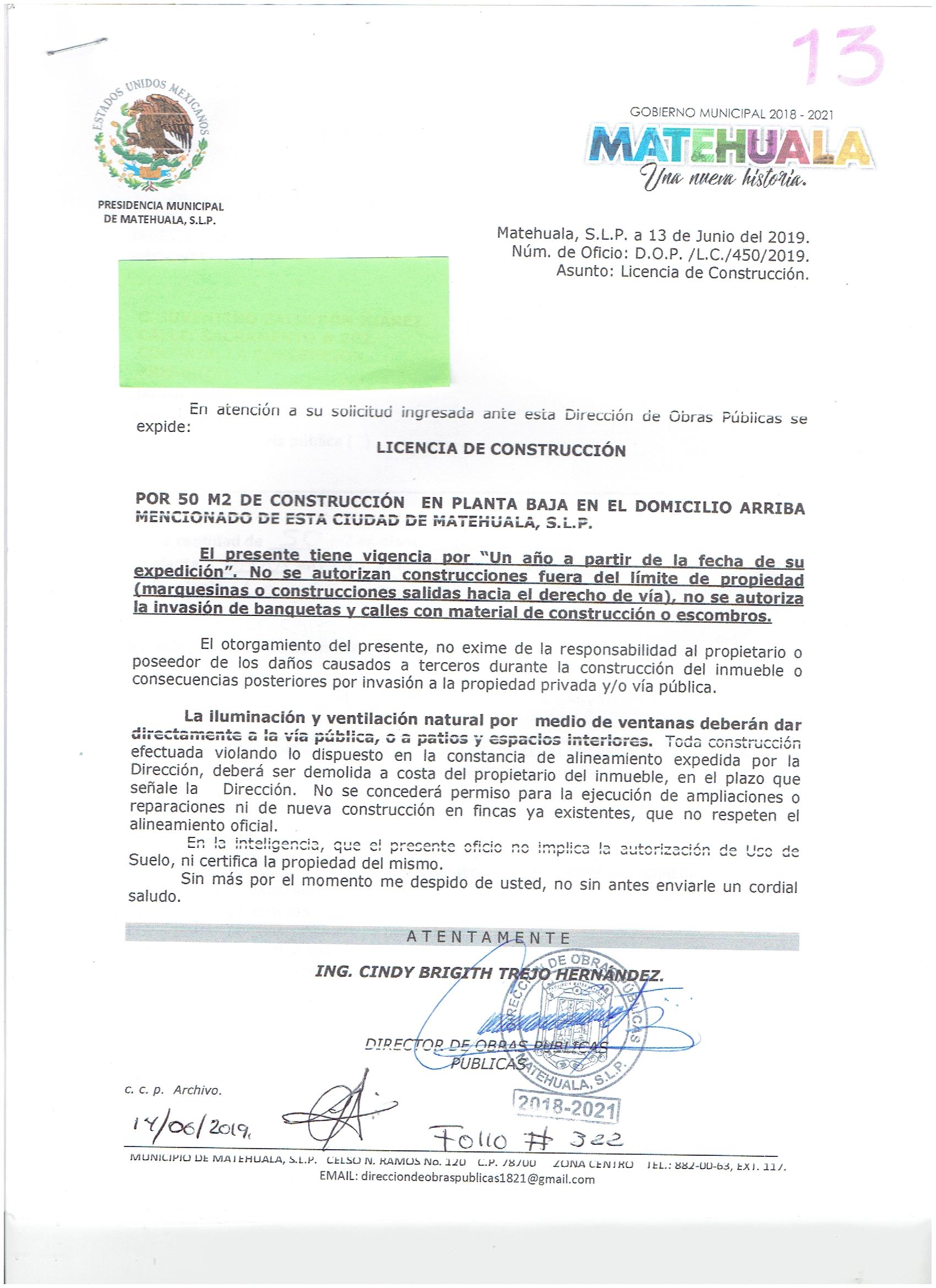 2019 01/06/2019 30/06/2019 D.O.P./L.C./446/2019 OBTENER PERMISO DE CONSTRUCCIÓN BENITO CAZARES ARMIJO N/A CALLE ALAMOS 310 0 COLONIA OLIVAR DE LAS ANIMAS 20 MATEHUALA 20 MATEHUALA 24 San Luis Potosí 78790 http://www.cegaipslp.org.mx/HV2019Dos.nsf/nombre_de_la_vista/E74571ABC186E4308625842B0062E4A2/$File/12+BENITO+CAZAREZ+ARMIJO.jpg 07/06/2019 07/06/2020 HABITACIONAL "http://www.cegaipslp.org.mx/HV2019Dos.nsf/nombre_de_la_vista/4D97C84DCE6C4FDB8625842C005C2E12/$File/12+BENITO+CAZAREZ+ARMIJO.jpg " DIRECCIÓN DE OBRAS PÚBLICAS 04/08/2019 04/07/2019 DESC. INSEN
