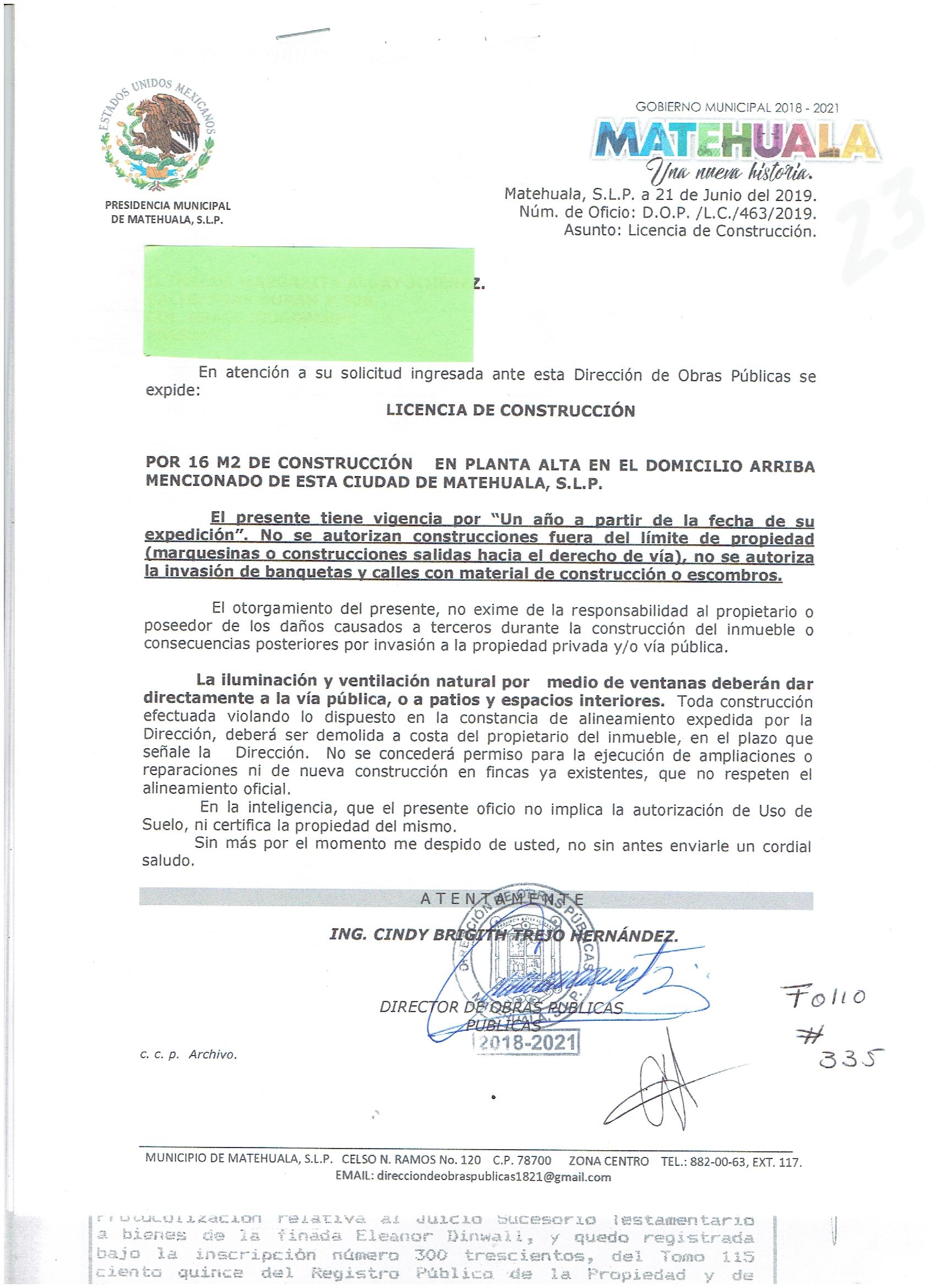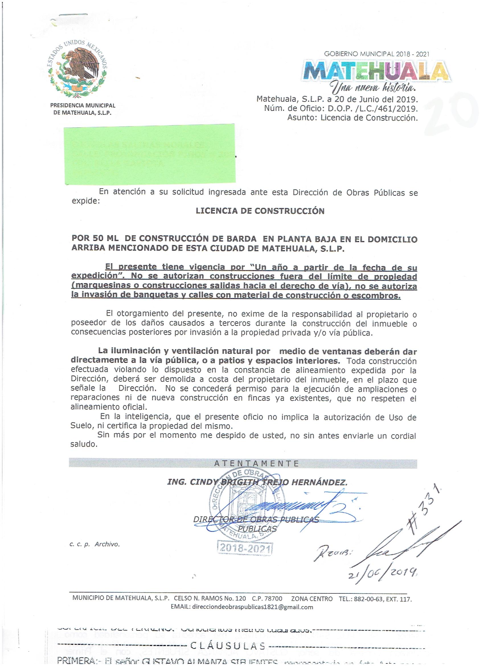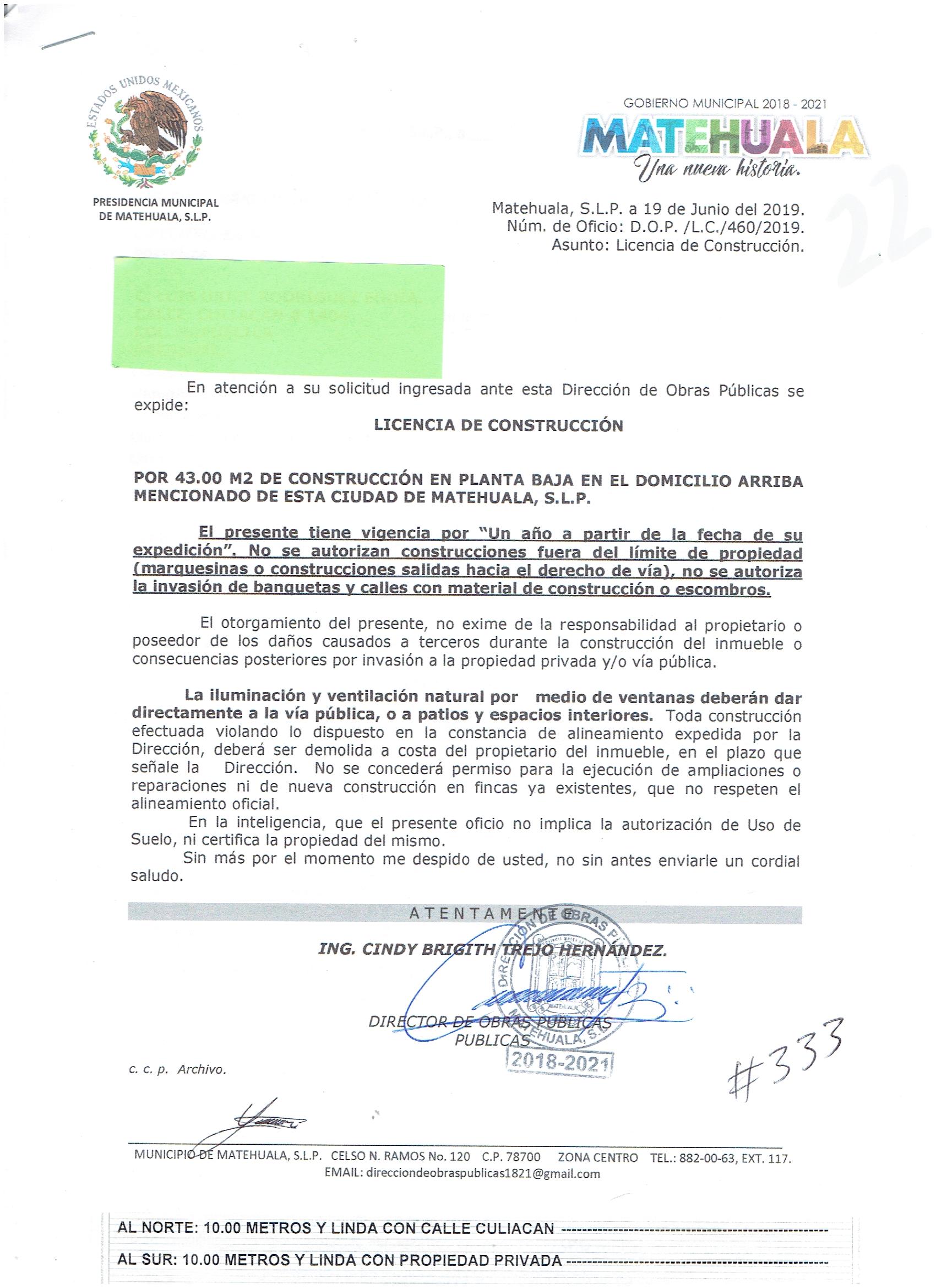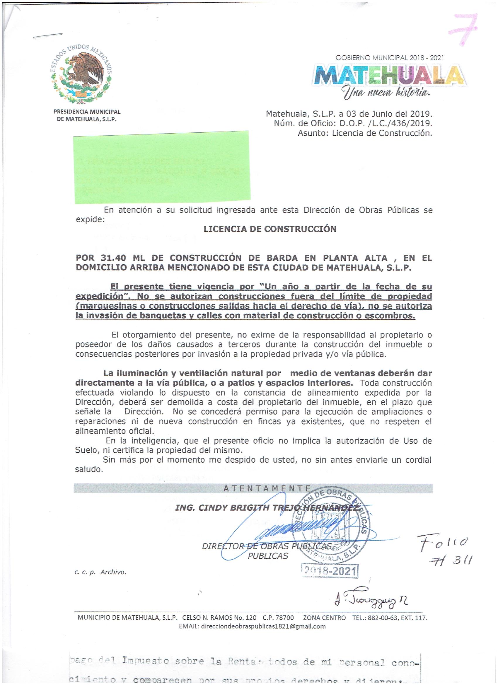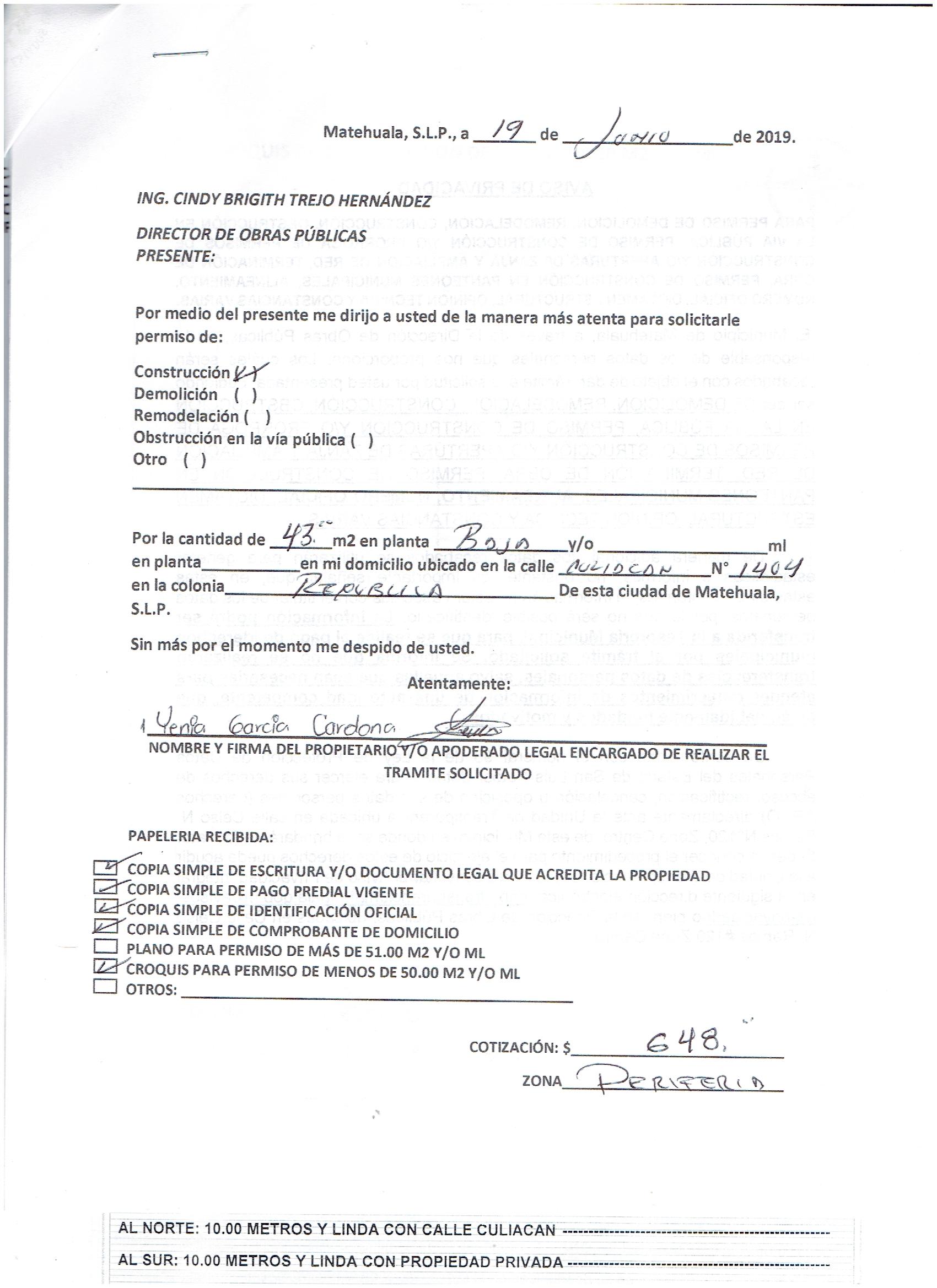 2019 01/06/2019 30/06/2019 D.O.P./L.C./463/2019 OBTENER PERMISO DE CONSTRUCCIÓN IMELDA MARGARITA ALDAY JIMENEZ N/A CALLE FRAY DURAN 508 0 COLONIA GUADALUPE 20 MATEHUALA 20 MATEHUALA 24 San Luis Potosí 78786 "http://www.cegaipslp.org.mx/HV2019Dos.nsf/nombre_de_la_vista/3555577A9A02A6818625842C00512F7A/$File/23+IMELDA+MARGARITA+ALDAY+JIMENEZ.jpg " 21/06/2019 21/06/2020 HABITACIONAL http://www.cegaipslp.org.mx/HV2019Dos.nsf/nombre_de_la_vista/1C85B729784B0EEE8625842C005EA970/$File/23+IMELDA+MARGARITA+ALDAY+JIMENEZ.jpg DIRECCIÓN DE OBRAS PÚBLICAS 04/08/2019 04/07/2019 N/A