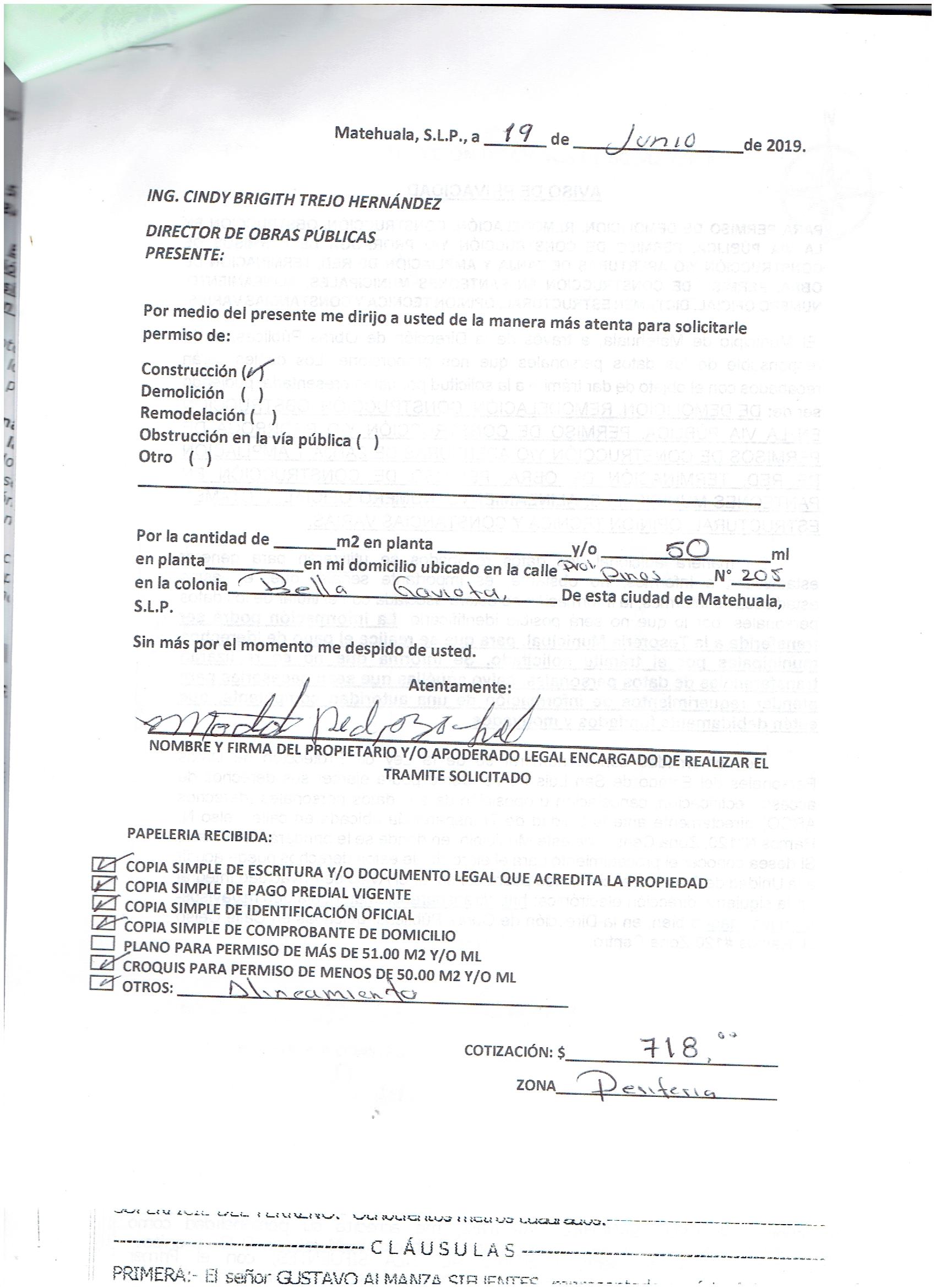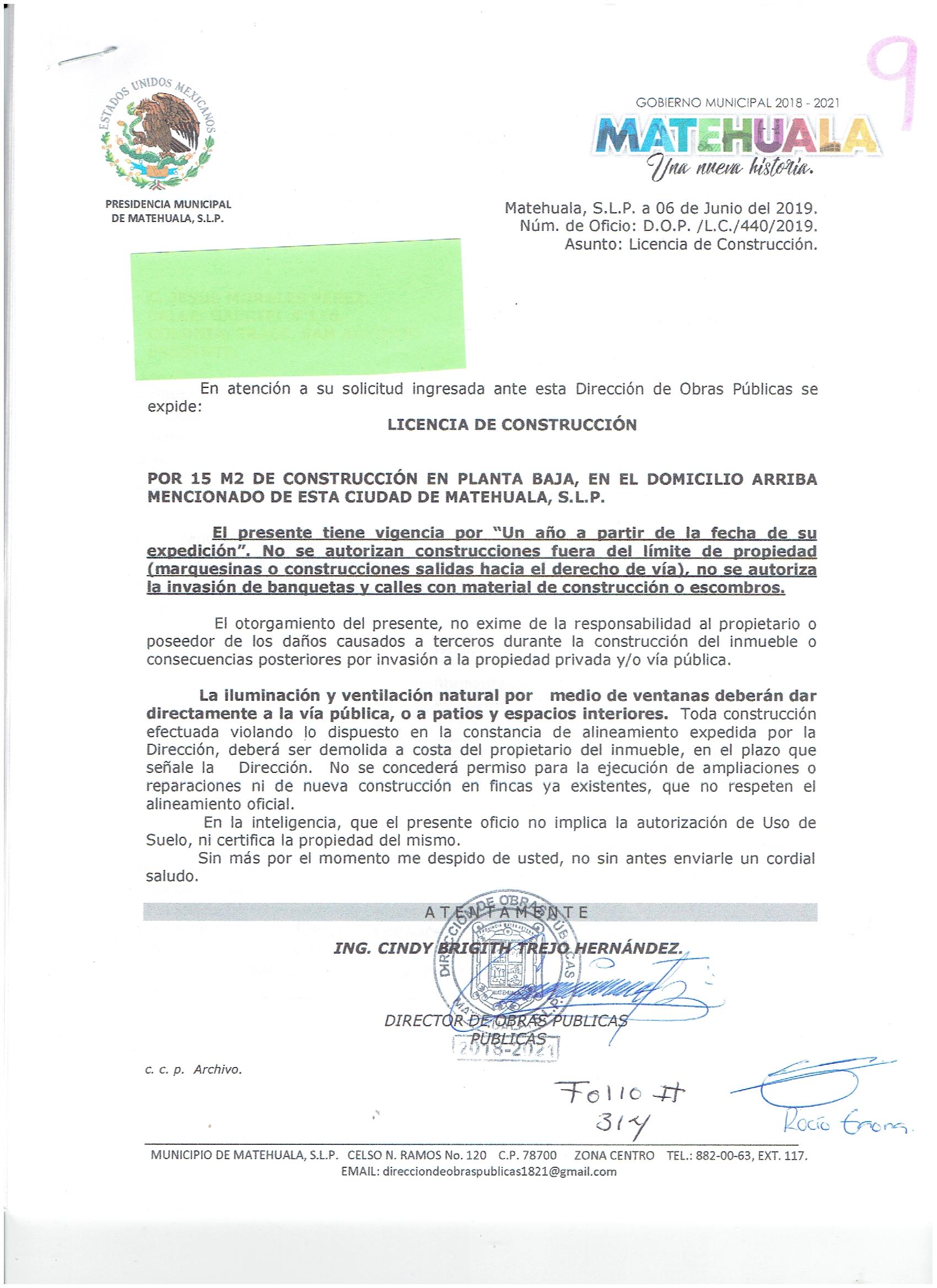 2019 01/06/2019 30/06/2019 D.O.P./L.C./440/2019 OBTENER PERMISO DE CONSTRUCCIÓN JESUS MARIO MORALES PEREZ N/A CALLE GABRIEL 116 0 FRACCIONAMIENTO SAN ANTONIO 20 MATEHUALA 20 MATEHUALA 24 San Luis Potosí 78784 http://www.cegaipslp.org.mx/HV2019Dos.nsf/nombre_de_la_vista/2B8391D3837924488625842B00624507/$File/09+JESUS+MORALES+PEREZ.jpg 06/06/2019 06/06/2020 HABITACIONAL "http://www.cegaipslp.org.mx/HV2019Dos.nsf/nombre_de_la_vista/FE74F0899D62ABBF8625842C005BEB58/$File/09+JESUS+MORALES+PEREZ.jpg " DIRECCIÓN DE OBRAS PÚBLICAS 04/08/2019 04/07/2019 N/A
