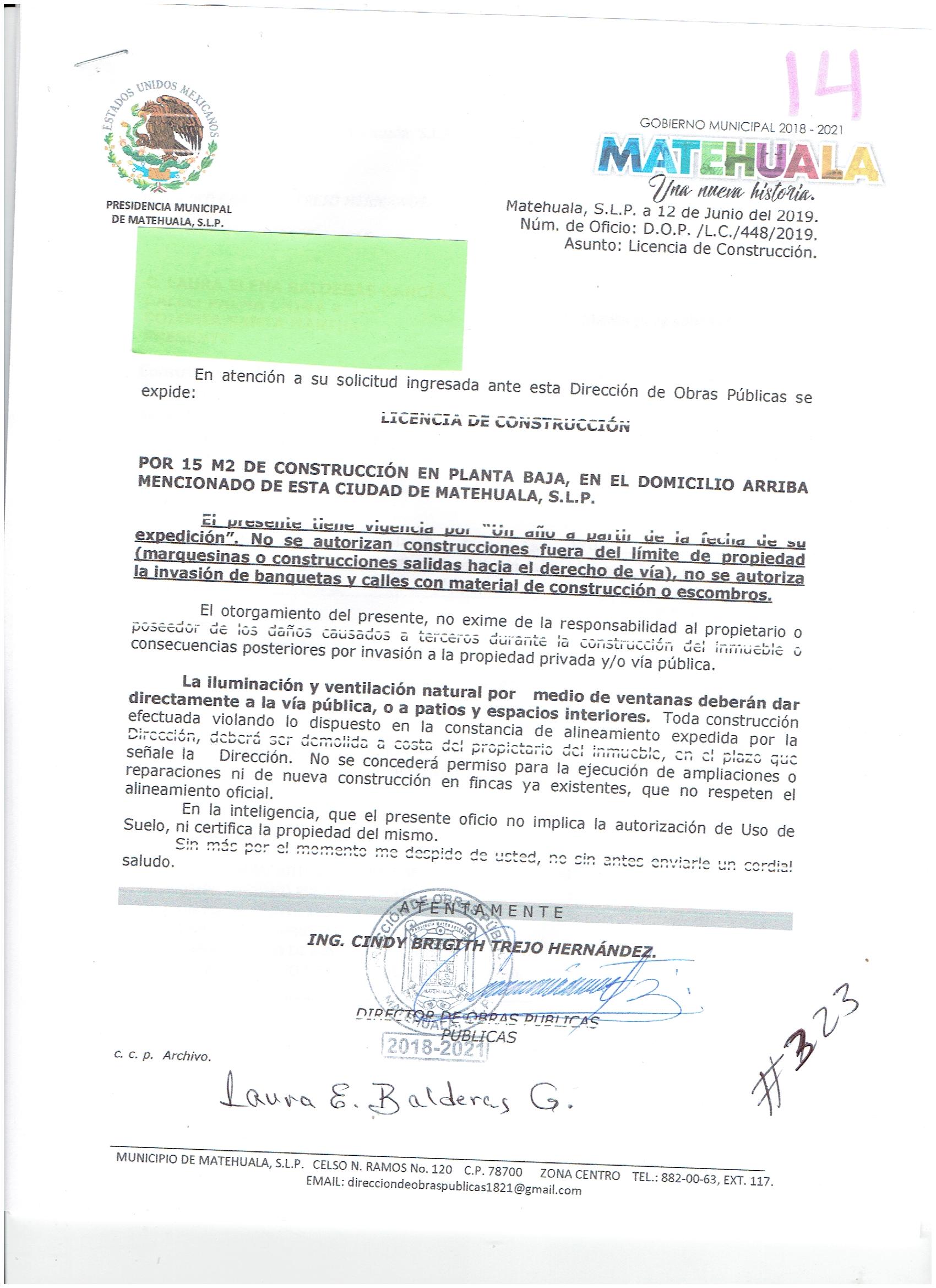 2019 01/06/2019 30/06/2019 D.O.P./L.C./448/2019 OBTENER PERMISO DE CONSTRUCCIÓN LAURA ELENA BALDERAS GARCIA N/A CALLE PALMA CHINA 213 0 COLONIA SANTA MARTHA 20 MATEHUALA 20 MATEHUALA 24 San Luis Potosí 78815 "http://www.cegaipslp.org.mx/HV2019Dos.nsf/nombre_de_la_vista/1E248185ACB7388F8625842B0065E0F4/$File/14+LAURA+ELENA+BALDERAS+GARCIA.jpg " 12/06/2019 12/06/2020 HABITACIONAL "http://www.cegaipslp.org.mx/HV2019Dos.nsf/nombre_de_la_vista/E5F1C4C9AC5174F08625842C005C5E38/$File/14+LAURA+ELENA+BALDERAS+GARCIA.jpg " DIRECCIÓN DE OBRAS PÚBLICAS 04/08/2019 04/07/2019 N/A