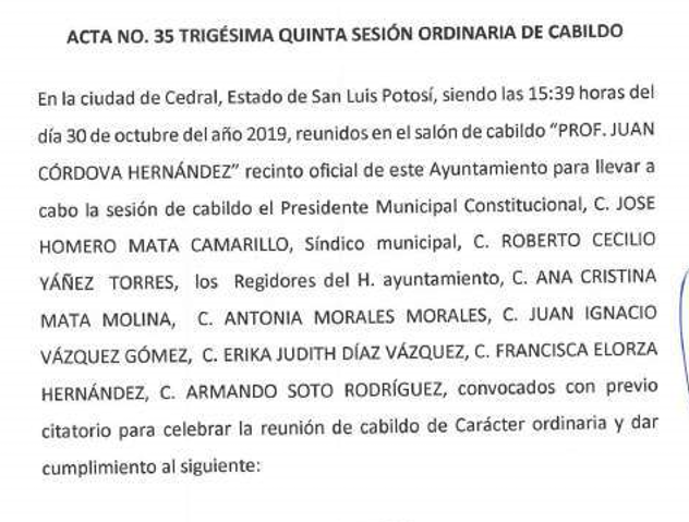 Sesiones celebradas de Cabildo LTAIPSLP85IIC2 Respecto de las sesiones que hayan sido llevadas a cabo, se incluirá lo correspondiente a cada sesión, así como las actas que de ellas deriven
