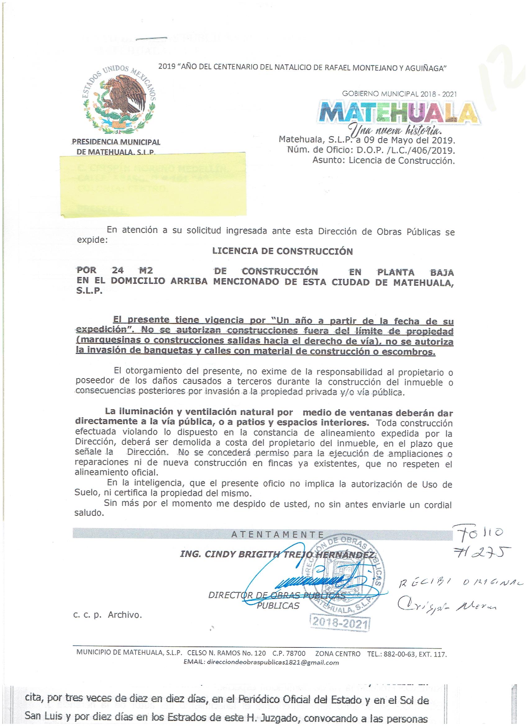 2019 01/05/2019 31/05/2019 D.O.P./L.C./411/2019 OBTENER PERMISO DE CONSTRUCCIÓN MARIA INOCENCIA MARTINEZ GUZMAN N/A CALLE HIDALGO 208 NTE COLONIA CENTRO 20 MATEHUALA 20 MATEHUALA 24 San Luis Potosí 78700 "http://www.cegaipslp.org.mx/HV2019Dos.nsf/nombre_de_la_vista/9C116D74B2DEB6E4862584100053F382/$File/15+MARIA+INOCENCIA+MARTINEZ+GUZMAN.jpg " 15/05/2019 15/05/2020 HABITACIONAL http://www.cegaipslp.org.mx/HV2019Dos.nsf/nombre_de_la_vista/F89AD461AC58B09F8625840F005E340A/$File/15+MARIA+INOCENCIA+MARTINEZ+GUZMAN.jpg DIRECCIÓN DE OBRAS PÚBLICAS 05/07/2019 05/06/2019 N/A