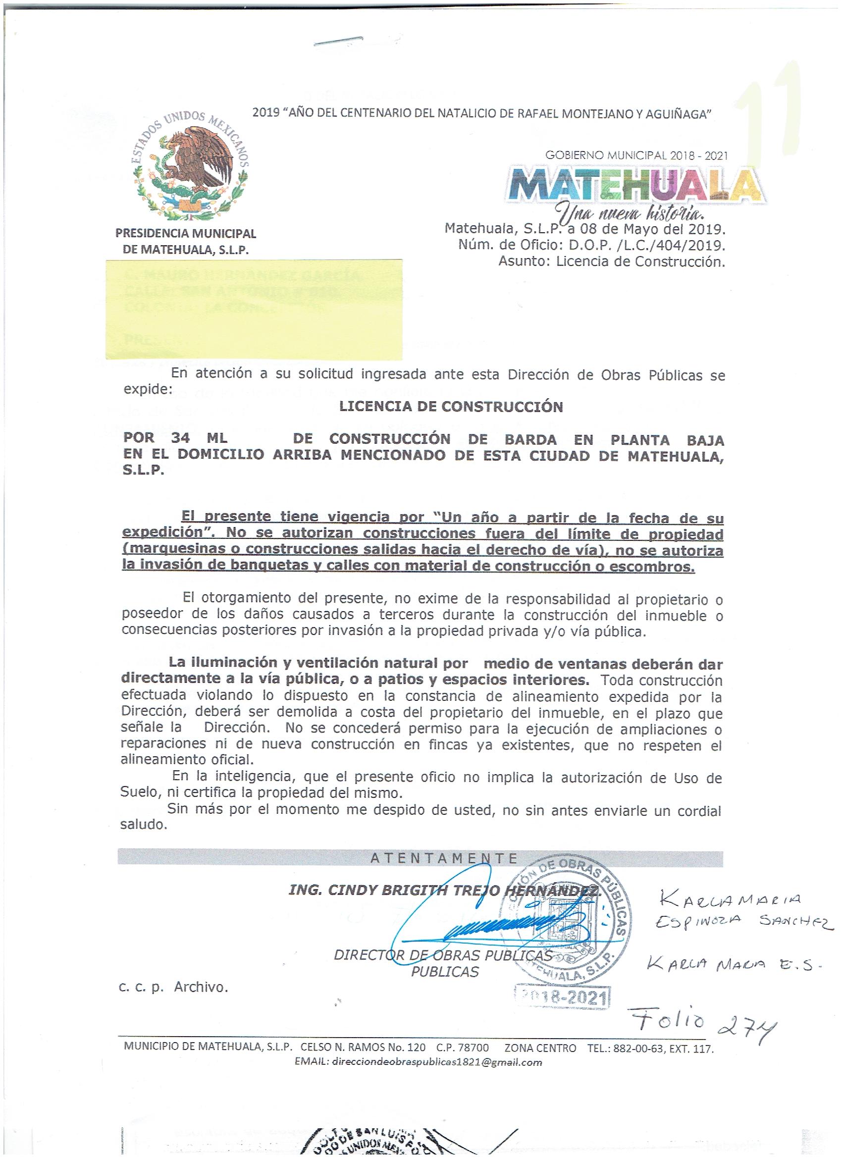 2019 01/05/2019 31/05/2019 D.O.P./L.C./416/2019 OBTENER PERMISO DE CONSTRUCCIÓN BERENICE MARTINEZ SUSTAITA N/A CALLE INDEPENDENCIA 605 NTE COLONIA LA FORESTAL 20 MATEHUALA 20 MATEHUALA 24 San Luis Potosí 78730 "http://www.cegaipslp.org.mx/HV2019Dos.nsf/nombre_de_la_vista/C21FF551575ECDE78625841000561558/$File/21+BERENICE+MARTINEZ+SUSTAITA.jpg " 16/05/2019 16/05/2020 HABITACIONAL http://www.cegaipslp.org.mx/HV2019Dos.nsf/nombre_de_la_vista/56642DF5238B52B68625840F005EF751/$File/21+BERENICE+MARTINEZ+SUSTAITA.jpg DIRECCIÓN DE OBRAS PÚBLICAS 05/07/2019 05/06/2019 N/A