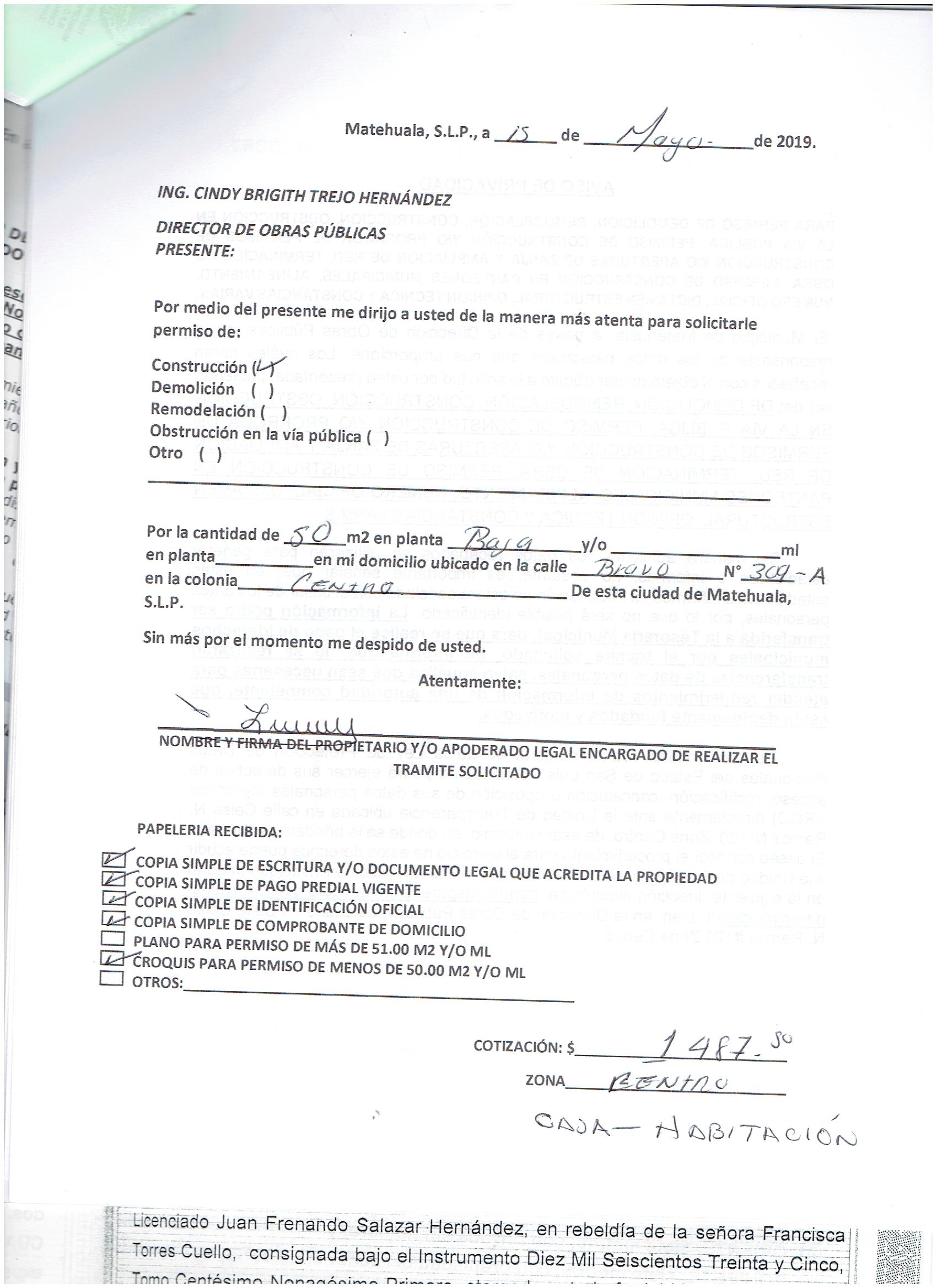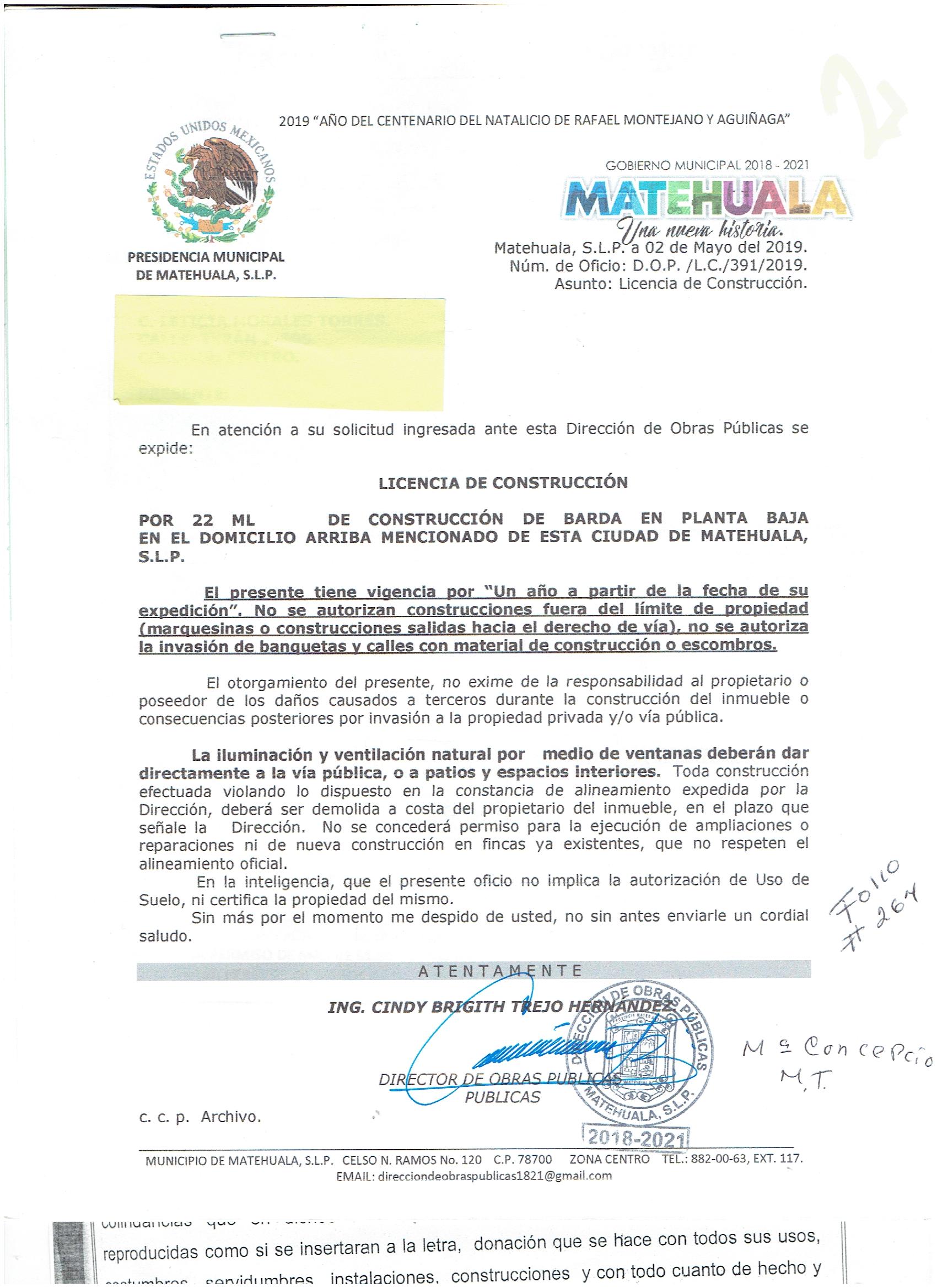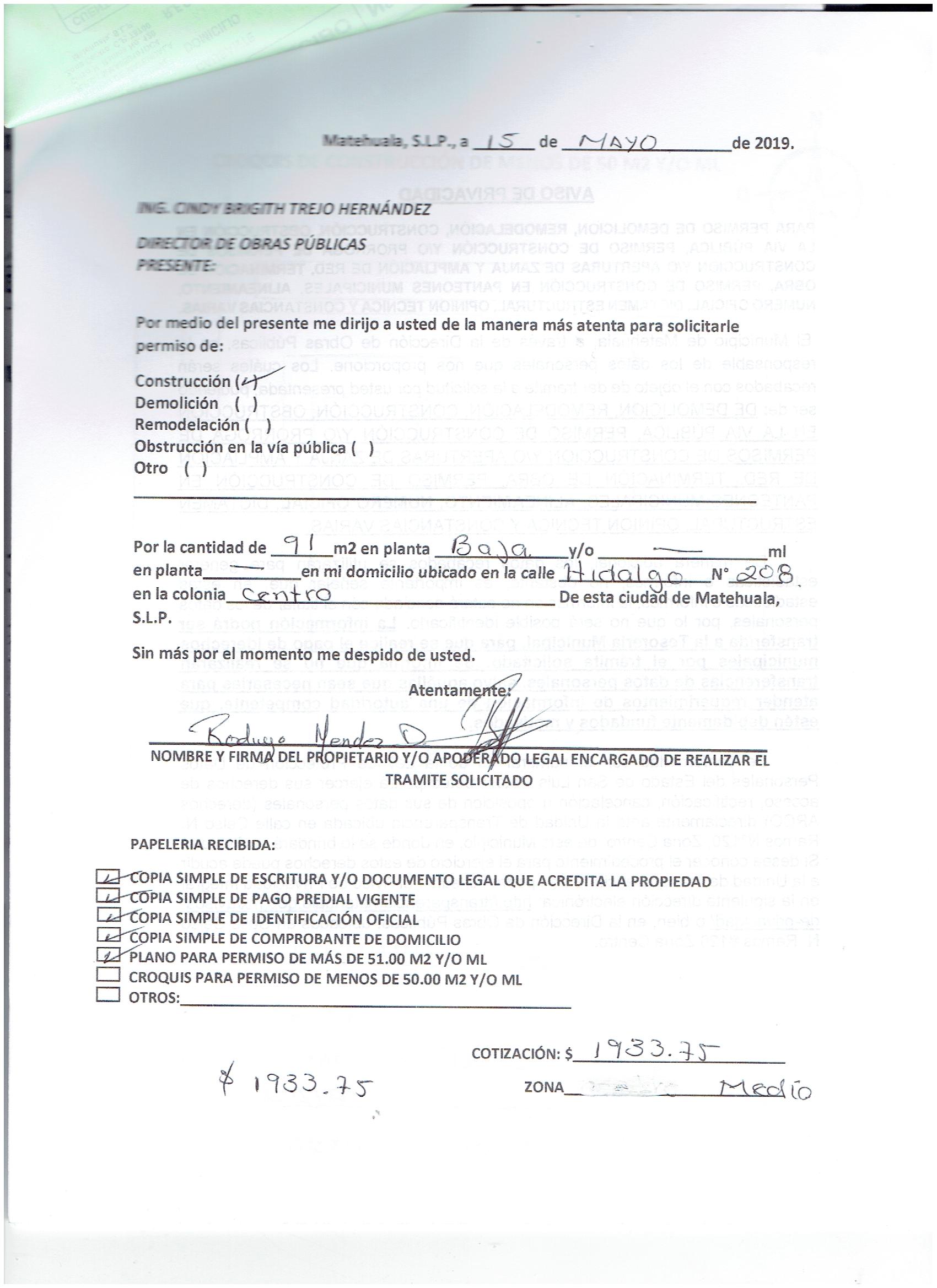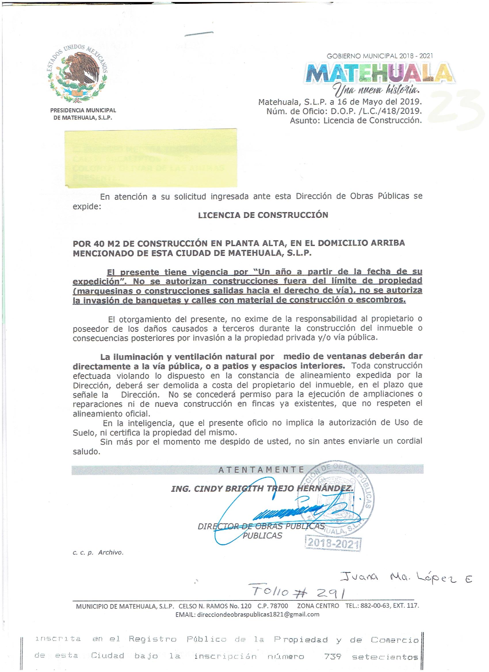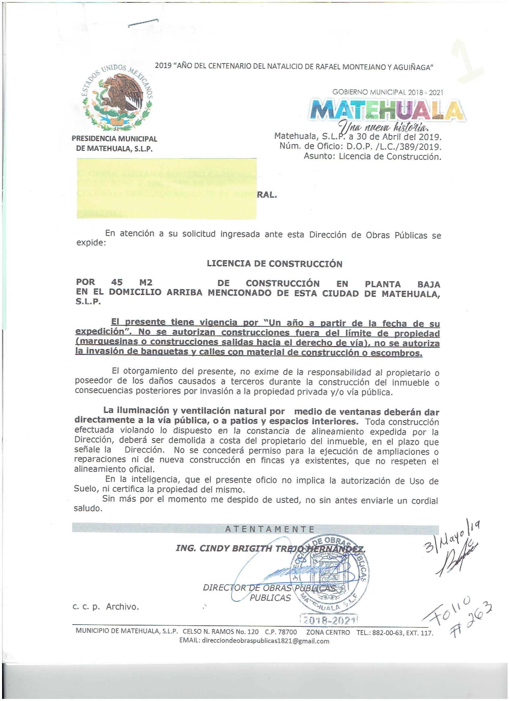 2019 01/05/2019 31/05/2019 D.O.P./L.C./398/2019 OBTENER PERMISO DE CONSTRUCCIÓN ALEJANDRA RODRIGUEZ GOVEA N/A CALLE SAN RAMON 326 0 COLONIA GUADALUPE 20 MATEHUALA 20 MATEHUALA 24 San Luis Potosí 78786 "http://www.cegaipslp.org.mx/HV2019Dos.nsf/nombre_de_la_vista/208197634180D2868625841000523015/$File/10+ALEJANDRA+RODRIGUEZ+GOVEA.jpg " 06/05/2019 06/05/2020 HABITACIONAL "http://www.cegaipslp.org.mx/HV2019Dos.nsf/nombre_de_la_vista/278563704712ED22862584100059770E/$File/10+ALEJANDRA+RODRIGUEZ+GOVEA.jpg " DIRECCIÓN DE OBRAS PÚBLICAS 05/07/2019 05/06/2019 N/A