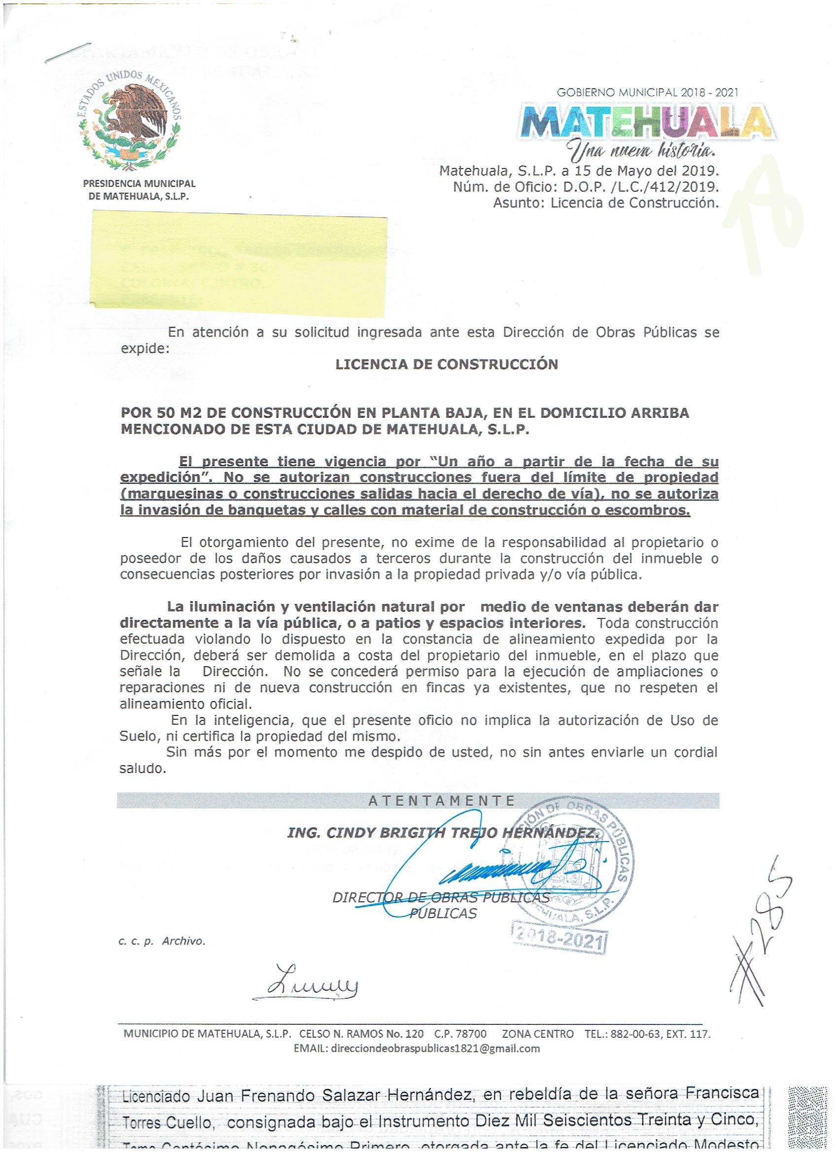 2019 01/05/2019 31/05/2019 D.O.P./L.C./404/2019 OBTENER PERMISO DE CONSTRUCCIÓN MAURO HERNANDEZ GARCIA N/A CALLE SAN ANTONIO 610 0 COLONIA LA CONCEPCION 20 MATEHUALA 20 MATEHUALA 24 San Luis Potosí 78798 http://www.cegaipslp.org.mx/HV2019Dos.nsf/nombre_de_la_vista/62BBA5F5486F38E2862584100053734C/$File/11+MAURO+HERNANDEZ+GARCIA.jpg 08/05/2019 08/05/2020 HABITACIONAL "http://www.cegaipslp.org.mx/HV2019Dos.nsf/nombre_de_la_vista/1C914F12CC04C7F9862584100059C5A1/$File/11+MAURO+HERNANDEZ+GARCIA.jpg " DIRECCIÓN DE OBRAS PÚBLICAS 05/07/2019 05/06/2019 N/A