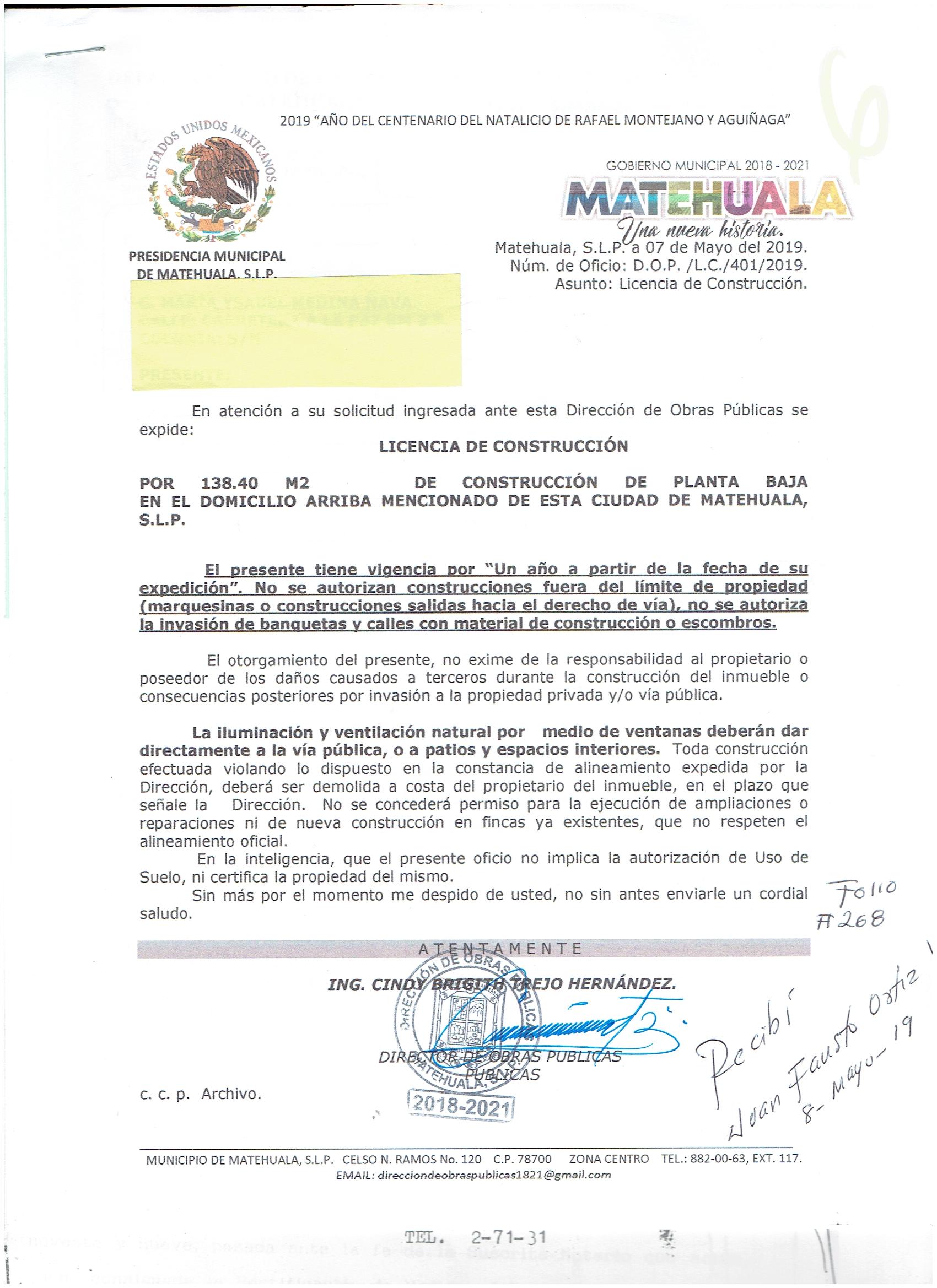 2019 01/05/2019 31/05/2019 D.O.P./L.C./407/2019 OBTENER PERMISO DE CONSTRUCCIÓN RODOLFO GONZALEZ MEDINA N/A CALLE MONTERREY 316 0 COLONIA EL PINEÑO 20 MATEHUALA 20 MATEHUALA 24 San Luis Potosí 78730 "http://www.cegaipslp.org.mx/HV2019Dos.nsf/nombre_de_la_vista/E7E2313759049B0786258410005405A5/$File/16+RODOLFO+GONZALEZ+MEDINA.jpg " 13/05/2019 13/05/2020 HABITACIONAL ttp://www.cegaipslp.org.mx/HV2019Dos.nsf/nombre_de_la_vista/63237B1926569A468625840F005E4289/$File/16+RODOLFO+GONZALEZ+MEDINA.jpg DIRECCIÓN DE OBRAS PÚBLICAS 05/07/2019 05/06/2019 N/A