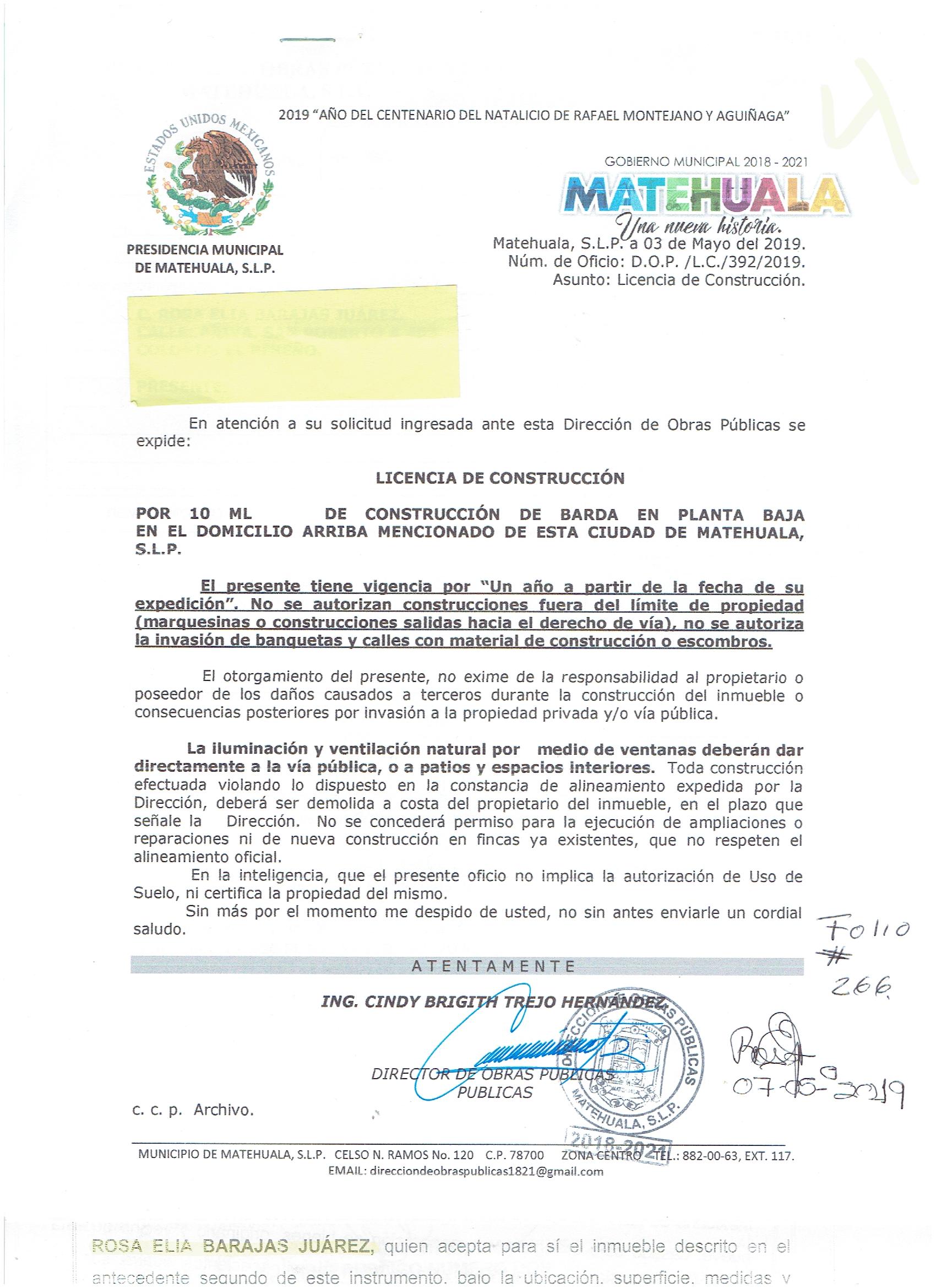 2019 01/05/2019 31/05/2019 D.O.P./L.C./392/2019 OBTENER PERMISO DE CONSTRUCCIÓN ROSA ELIA BARAJAS JUAREZ N/A CALLE SAN ROBERTO 403 0 COLONIA EL PINEÑO 20 MATEHUALA 20 MATEHUALA 24 San Luis Potosí 78730 "http://www.cegaipslp.org.mx/HV2019Dos.nsf/nombre_de_la_vista/741E414282FE49D48625840F006B50AD/$File/04+ROSA+ELIA+BARAJAS+JUAREZ.jpg " 03/05/2019 03/05/2020 HABITACIONAL http://www.cegaipslp.org.mx/HV2019Dos.nsf/nombre_de_la_vista/BB7B92AFCA17B9B28625840F005A8CDD/$File/04+ROSA+ELIA+BARAJAS+JUAREZ.jpg DIRECCIÓN DE OBRAS PÚBLICAS 05/07/2019 05/06/2019 N/A