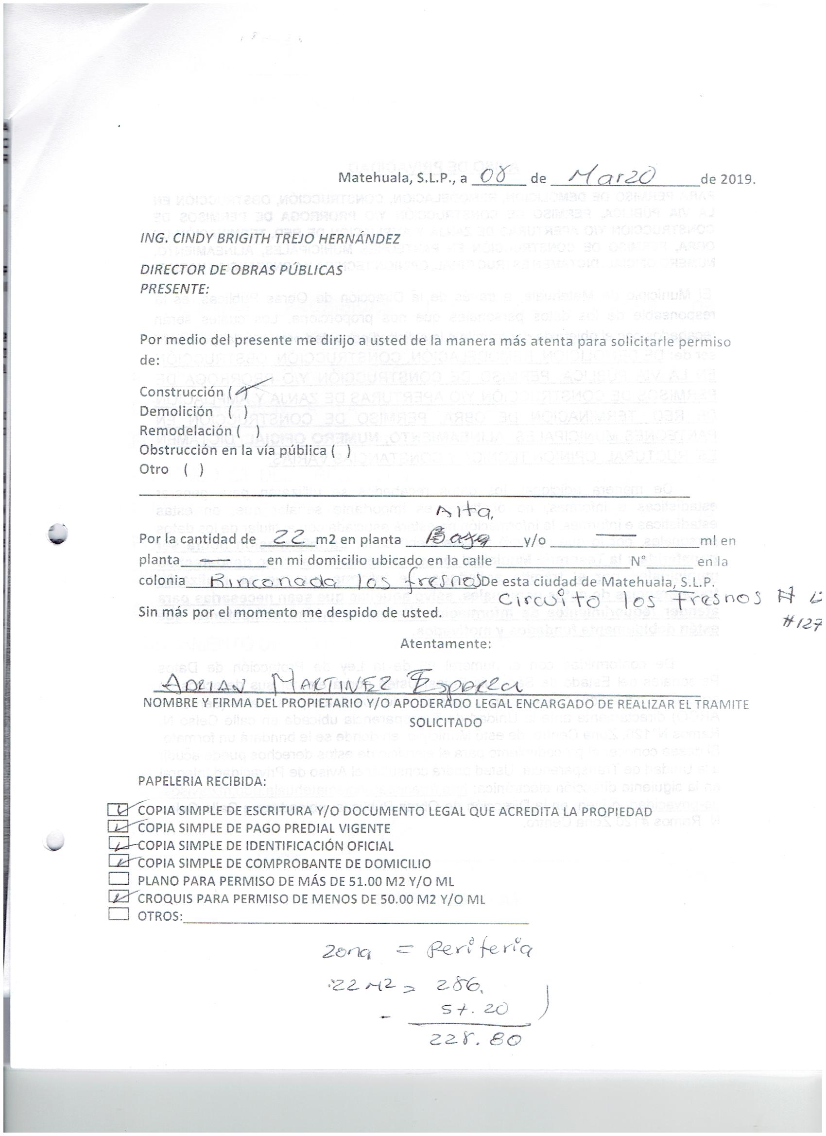 2019 01/03/2019 31/03/2019 D.O.P./L.C./292/2019 OBTENER PERMISO DE CONSTRUCCIÓN ADRIAN MARTINEZ ESPARZA N/A CALLE CIRCUITO LOS FRESNOS 127 0 COLONIA RINCONADA LOS FRESNOS 20 MATEHUALA 20 MATEHUALA 24 San Luis Potosí 78783 http://www.cegaipslp.org.mx/HV2019.nsf/nombre_de_la_vista/41E8ABE543C76227862583D0006955F5/$File/16+ADRIAN+MARTINEZ+ESPARZA.jpg 08/03/2019 08/03/2020 HABITACIONAL http://www.cegaipslp.org.mx/HV2019.nsf/nombre_de_la_vista/A84D9C85406721E5862583D1005167FE/$File/16+ADRIAN+MARTINEZ+ESPARZA.jpg DIRECCIÓN DE OBRAS PÚBLICAS 03/05/2019 03/04/2019 NO SE GENERO INFORMACION ESTE MES