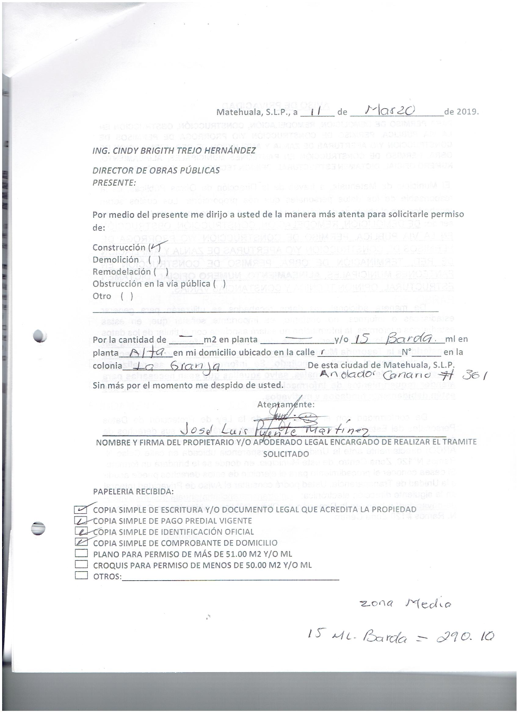2019 01/03/2019 31/03/2019 D.O.P./L.C./297/2019 OBTENER PERMISO DE CONSTRUCCIÓN JOSE LUIS PUENTE MARTINEZ N/A CALLE ANDADOR CANARIO 361 0 COLONIA LA GRANJA 20 MATEHUALA 20 MATEHUALA 24 San Luis Potosí 78716 http://www.cegaipslp.org.mx/HV2019.nsf/nombre_de_la_vista/604AD952FAB4B26D862583D000694791/$File/15+JOSE+LUIS+PUENTE+MARTINEZ.jpg 11/03/2019 11/03/2020 HABITACIONAL http://www.cegaipslp.org.mx/HV2019.nsf/nombre_de_la_vista/77F827F557932AB0862583D10051521D/$File/15+JOSE+LUIS+PUENTE+MARTINEZ.jpg DIRECCIÓN DE OBRAS PÚBLICAS 03/05/2019 03/04/2019 NO SE GENERO INFORMACION ESTE MES