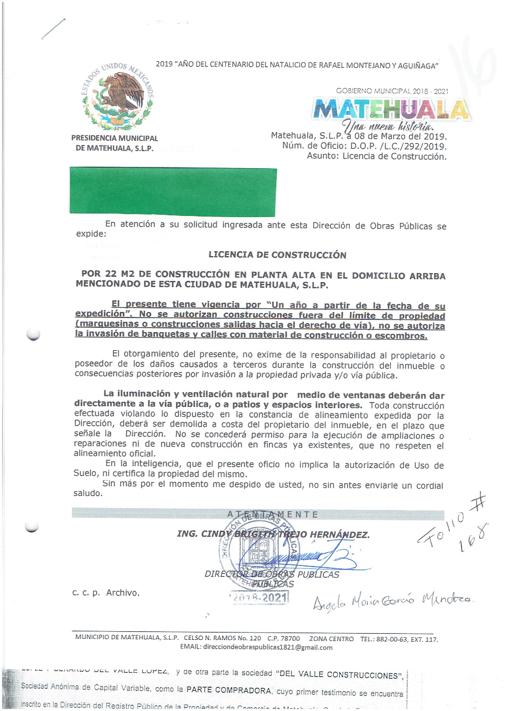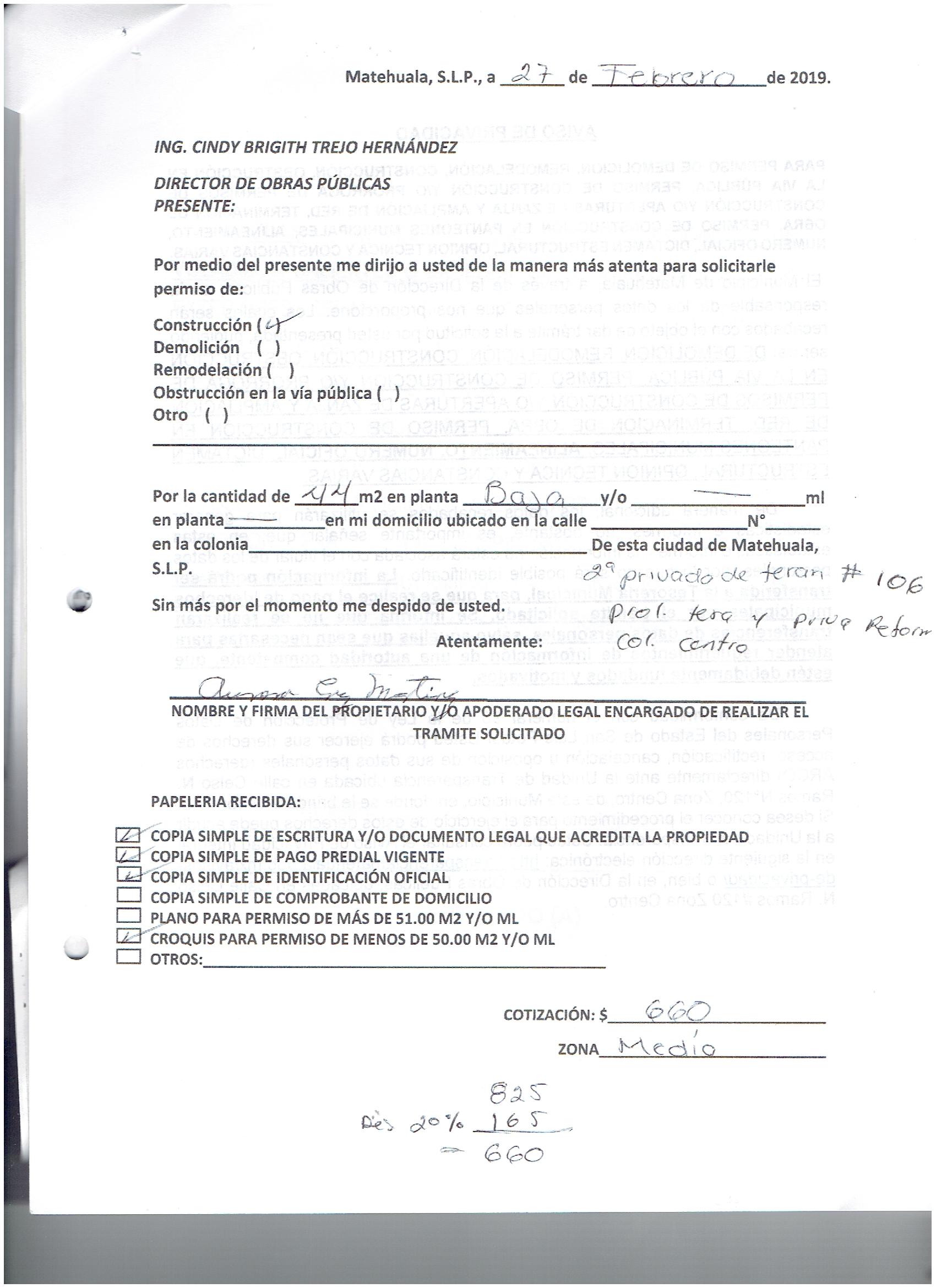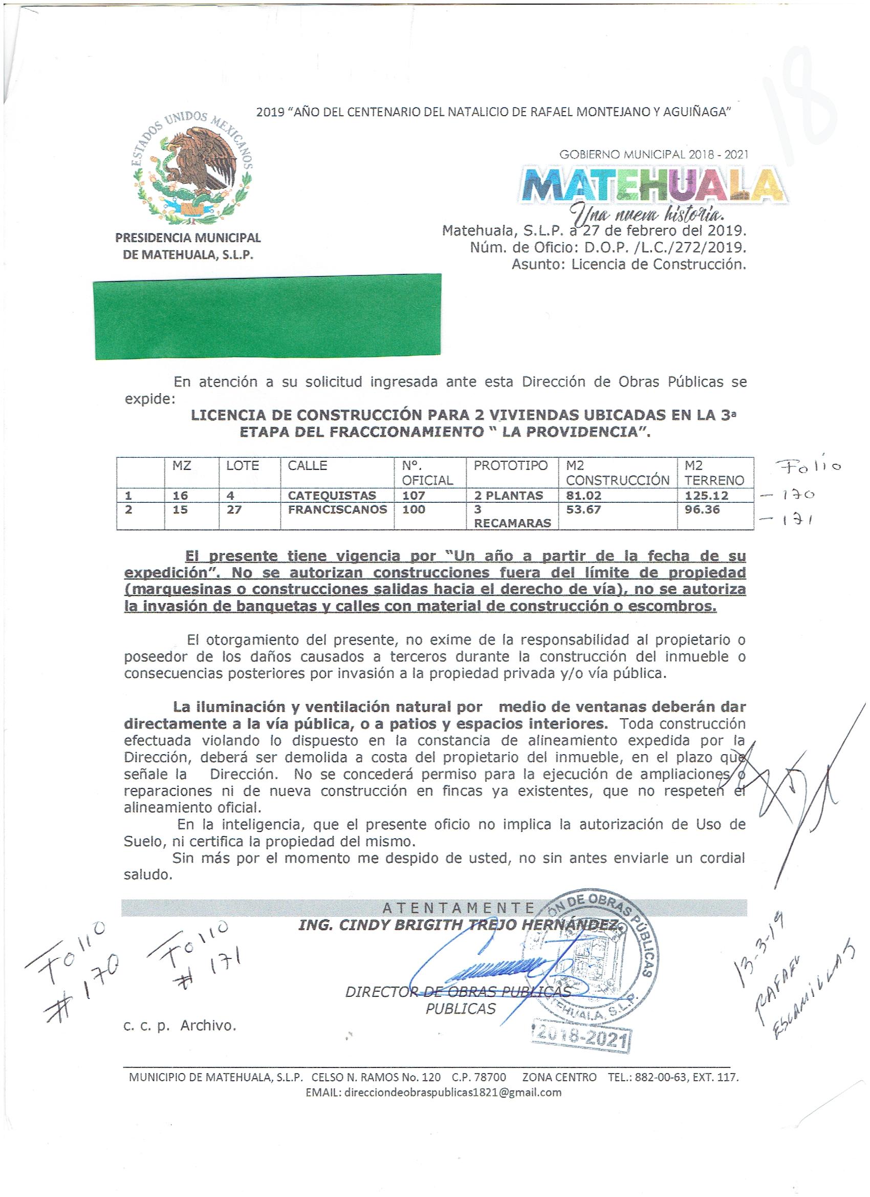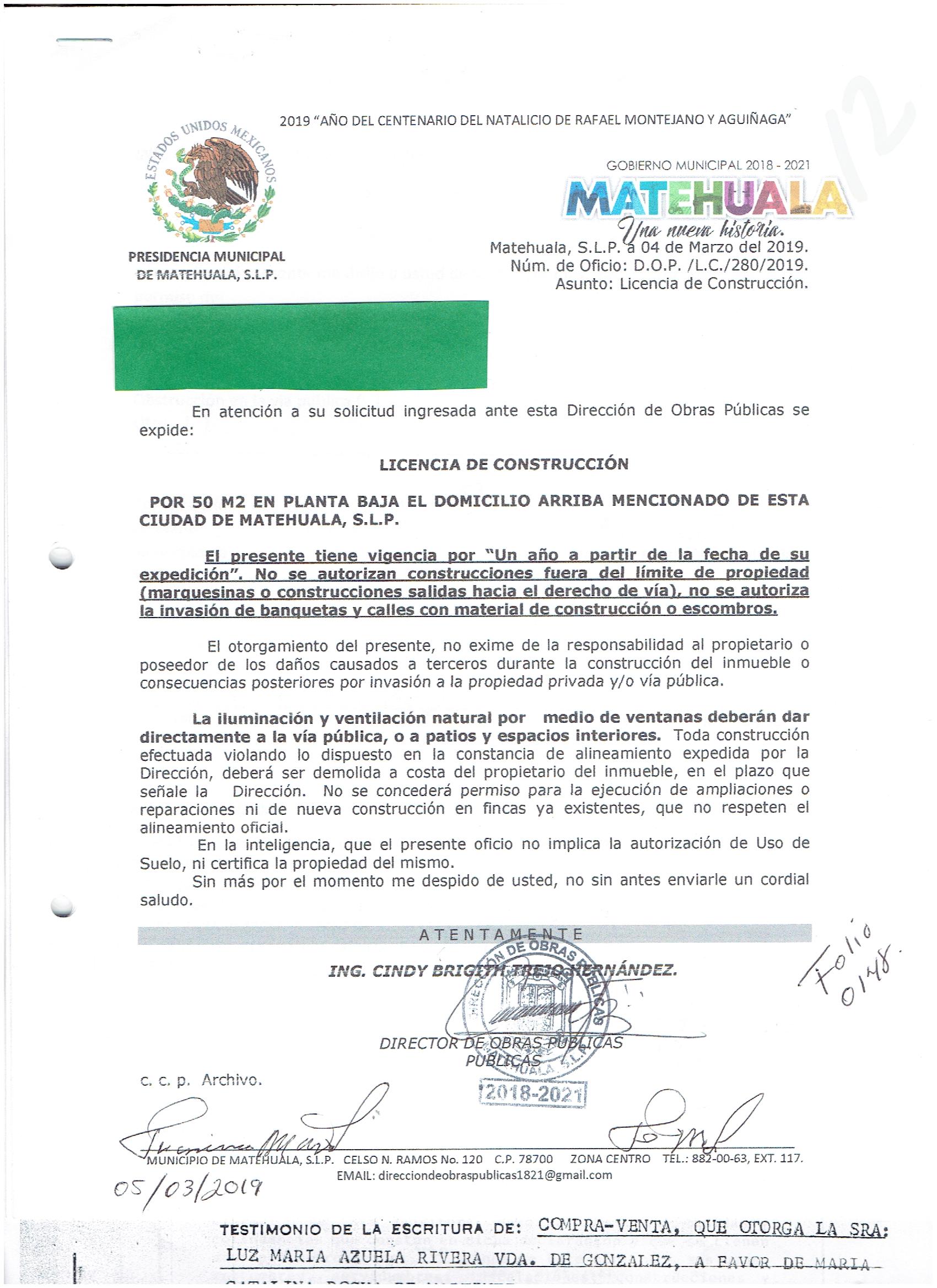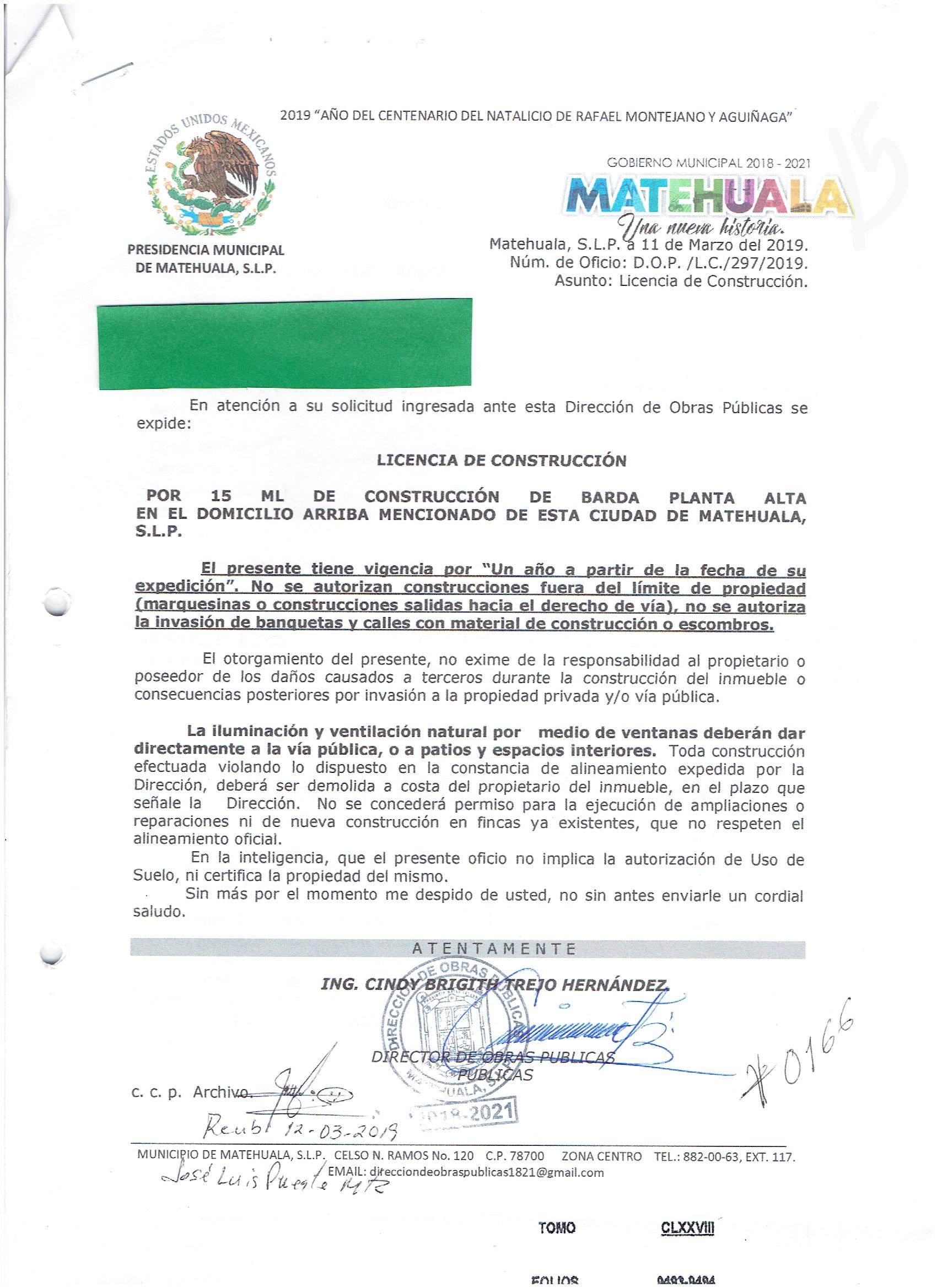 2019 01/03/2019 31/03/2019 D.O.P./L.C./298/2019 OBTENER PERMISO DE CONSTRUCCIÓN ESTHER MARTINEZ GARCIA N/A CALLE CALDERON 603 0 COLONIA CENTRO 20 MATEHUALA 20 MATEHUALA 24 San Luis Potosí 78700 http://www.cegaipslp.org.mx/HV2019.nsf/nombre_de_la_vista/6439BDCB8D3C32CC862583D000699748/$File/20+ESTHER+MARTINEZ+GARCIA.jpg 12/03/2019 12/03/2020 HABITACIONAL http://www.cegaipslp.org.mx/HV2019.nsf/nombre_de_la_vista/7E5388B5AEBE0832862583D10051CD43/$File/20+ESTHER+MARTINEZ+GARCIA.jpg DIRECCIÓN DE OBRAS PÚBLICAS 03/05/2019 03/04/2019 NO SE GENERO INFORMACION ESTE MES