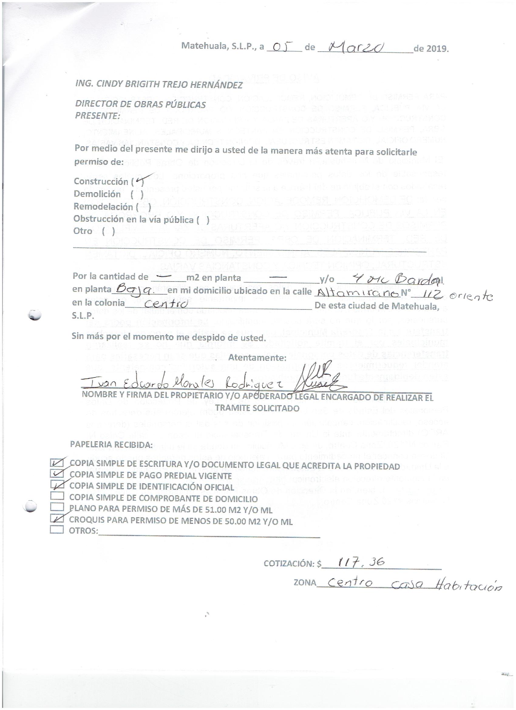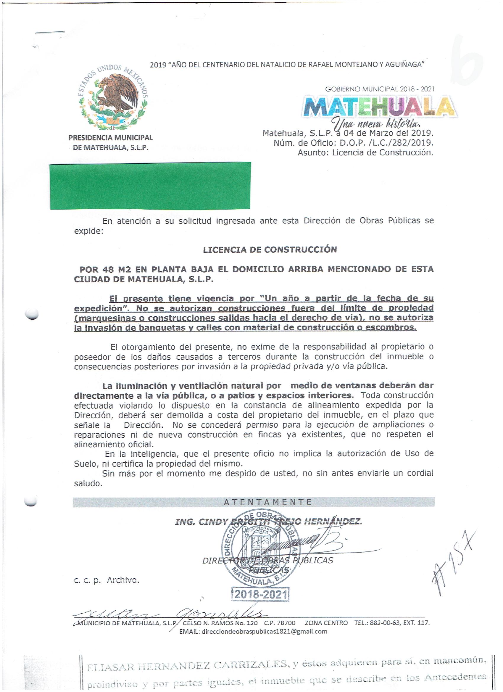 2019 01/03/2019 31/03/2019 D.O.P./L.C./283/2019 OBTENER PERMISO DE CONSTRUCCIÓN JUAN MARTINEZ SALINAS N/A CALLE HIDALGO 409 0 COLONIA REPUBLICA 20 MATEHUALA 20 MATEHUALA 24 San Luis Potosí 78740 http://www.cegaipslp.org.mx/HV2019.nsf/nombre_de_la_vista/EC8729D3A0CED733862583D0006926F2/$File/13+JUAN+MARTINEZ+SALINAS.jpg 04/03/2019 04/03/2020 HABITACIONAL http://www.cegaipslp.org.mx/HV2019.nsf/nombre_de_la_vista/3AB6C9753E27A3E5862583D100512CFB/$File/13+JUAN+MARTINEZ+SALINAS.jpg DIRECCIÓN DE OBRAS PÚBLICAS 03/05/2019 03/04/2019 NO SE GENERO INFORMACION ESTE MES