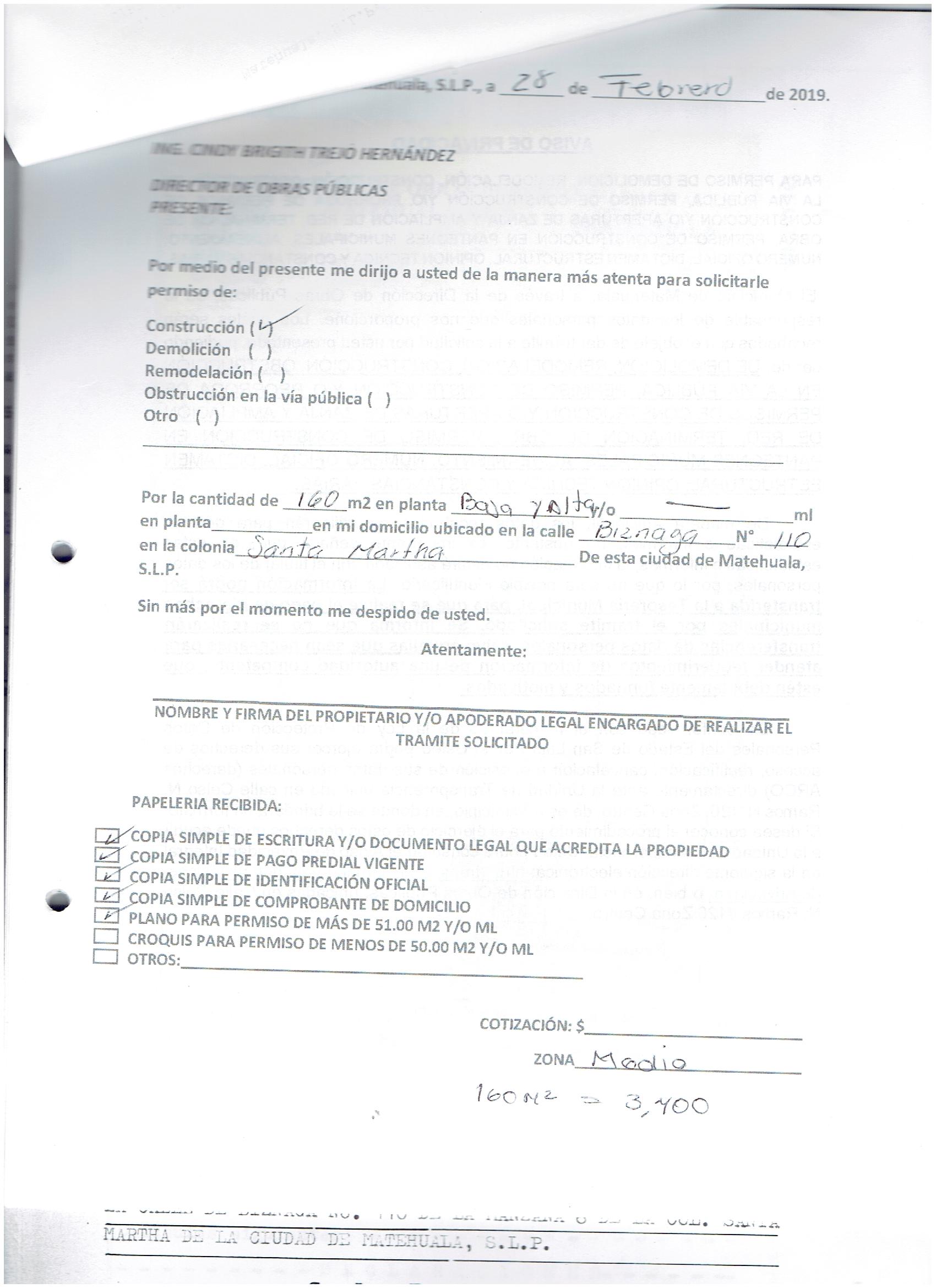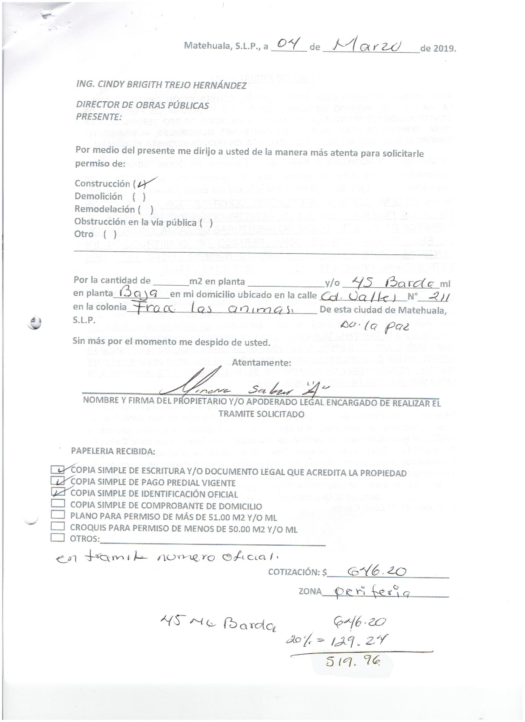 2019 01/03/2019 31/03/2019 D.O.P./L.C./301/2019 OBTENER PERMISO DE CONSTRUCCIÓN FRANCISCA LILIANA LOERA FLORES N/A CALLE REVOLUCION MEXICANA 401 0 LOCALIDAD SANTA ANA 20 MATEHUALA 20 MATEHUALA 24 San Luis Potosí 78812 http://www.cegaipslp.org.mx/HV2019.nsf/nombre_de_la_vista/161FCC03BD2A6786862583D0006A0E0B/$File/23+FRANCISCA+LILIANA+LOERA+FLORES.jpg 13/03/2019 13/03/2020 HABITACIONAL http://www.cegaipslp.org.mx/HV2019.nsf/nombre_de_la_vista/4B9DB3D0DD9EC969862583D100536089/$File/23+FRANCISCA+LILIANA+LOERA+FLORES.jpg DIRECCIÓN DE OBRAS PÚBLICAS 03/05/2019 03/04/2019 NO SE GENERO INFORMACION ESTE MES