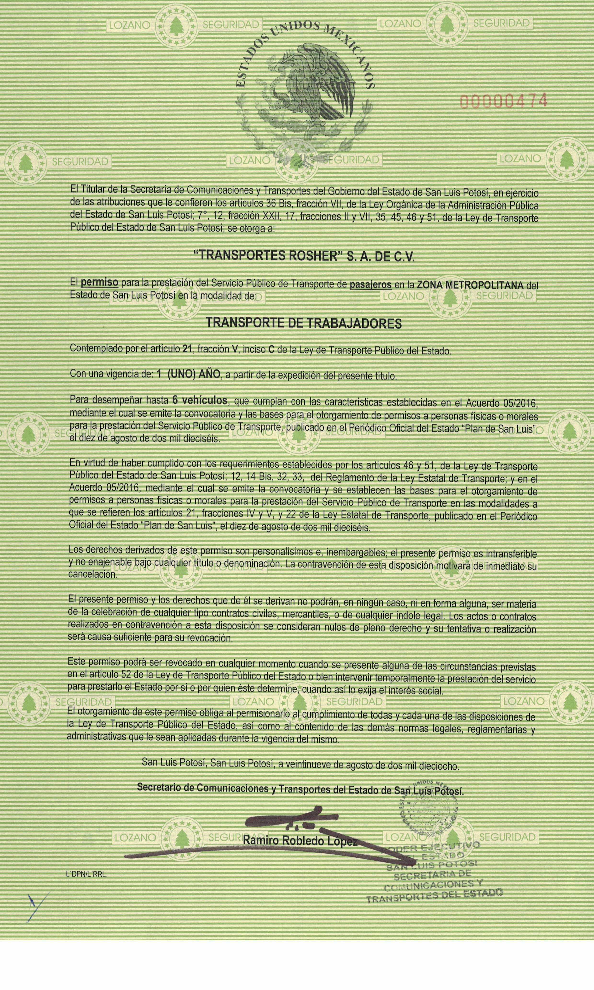 2019 01/02/2019 28/02/2019 Permiso 00000474 Atender a una necesidad de regularizacion del transporte publico en el estado, por medio del otorgamiento de permisos temporales para la prestación del servicio de transporte público en el Estado de San Luis Potosí Artículo 21 fracciones IV y V, 22 y 51 fracción II de la Ley de Transporte Público; 6 fracción X del Reglamento Interno de la Secretaría de Comunicaciones y Transportes del Estado de San Luis Potosí Dirección General de Comunicaciones y Transportes Público No se genera No se genera No se genera Transportes Rosher S.A. de C.V. No se genera No se genera No se genera http://www.cegaipslp.org.mx/HV2019.nsf/nombre_de_la_vista/4524E4A5CF575807862583B4007B1F94/$File/0474+TRANSPORTES+ROSHIER+S.A.+DE+C.V.+.jpg Facultad de la Secretaría de Finanzas de Gobierno del estado Facultad de la Secretaría de Finanzas de Gobierno del estado http://www.cegaipslp.org.mx/webcegaip2018N2.nsf/nombre_de_la_vista/D7426D75BE4A2AF1862583150073B5E4/$File/NO+SE+GENERA,+GASTOS+PERMISO+TEMPORAL.odt http://www.cegaipslp.org.mx/webcegaip2018N2.nsf/nombre_de_la_vista/D7426D75BE4A2AF1862583150073B5E4/$File/NO+SE+GENERA,+GASTOS+PERMISO+TEMPORAL.odt No se genera No No se genera Dirección General de Comunicaciones y Transportes 28/02/2019 28/02/2019 No se genera
