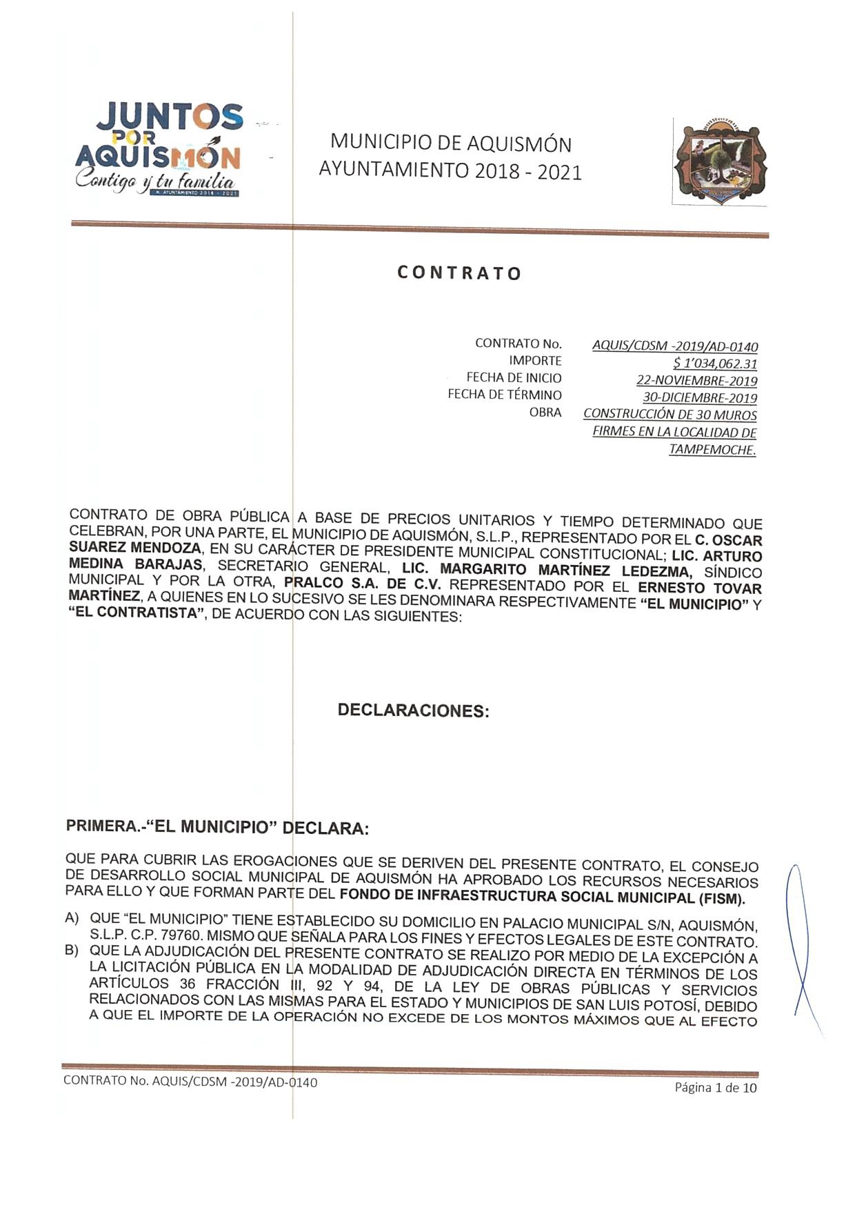 2019 01/11/2019 30/11/2019 Contrato AQUIS/CDSM-2019/AD-140 ADJUDICACION DIRECTA ARTICULOS 36 FRACCION III, 92 Y 94 DE LA LEY DE OBRAS PUBLICAS Y SERVICIOS RELACIONADOS CON LAS MISMAS DEL ESTADO Y MUNICIPIOS DE SAN LUIS POTOSI NO SE GENERA INFORMACION COORDINACION DE DESARROLLO SOCIAL Privado ERNESTO TOVAR MARTINEZ PRA1006073G5 22/11/2019 30/12/2019 ADJUDICACION DIRECTA ARTICULOS 36 FRACCION III, 92 Y 94 DE LA LEY DE OBRAS PUBLICAS Y SERVICIOS RELACIONADOS CON LAS MISMAS DEL ESTADO Y MUNICIPIOS DE SAN LUIS POTOSI http://www.cegaipslp.org.mx/HV2019Tres.nsf/nombre_de_la_vista/E3E814CC1BFA93C5862584C7005C0D70/$File/140.jpg 1034062.31 1034062.31 http://www.aquismon-slp.gob.mx/2018-2021/images/NO_SE_GENERA.docx http://www.aquismon-slp.gob.mx/2018-2021/images/NO_SE_GENERA.docx http://www.aquismon-slp.gob.mx/2018-2021/images/NO_SE_GENERA.docx No http://www.aquismon-slp.gob.mx/2018-2021/images/NO_SE_GENERA.docx COORDINACION DE DESARROLLO SOCIAL 05/12/2019 05/12/2019 INFORMACION DESGLOSADA EN EL CONTRATO DE LA OBRA