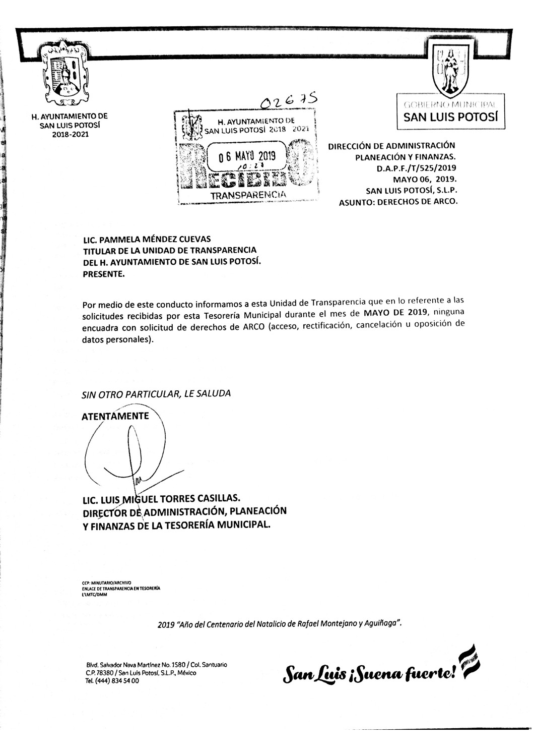 2019 01/04/2019 30/04/2019 DERECHO DE ARCO TESORERIA MUNICIPAL LEY FEDERAL DE PROTECCIÓN DE DATOS PERSONALES EN POSESIÓN DE LOS DATOS PERSONALES MENSUAL 06/05/2019 http://www.cegaipslp.org.mx/HV2019Dos.nsf/nombre_de_la_vista/9DE1B238EA6FBAC3862583F200605E79/$File/DERECHOS+DE+ARCO+.jpg TESORERIA MUNICIPAL 10/06/2019 10/05/2019 NO HAY NOTA