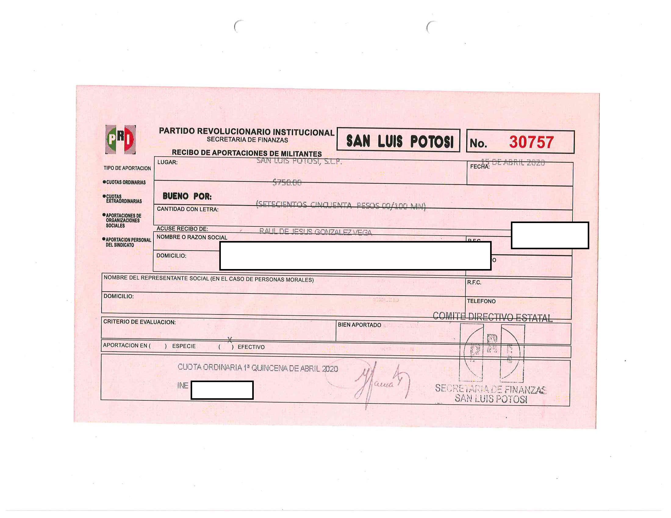 2020 01/04/2020 30/04/2020 ordinaria RAUL DE JESUS GONZALEZ VEGA 15/04/2020 750 5250 http://www.cegaipslp.org.mx/HV2020Dos.nsf/nombre_de_la_vista/A8A6667F181D2F5F86258596007EE1BD/$File/30757+RAUL+DE+JESUS+GONZALEZ+VEGA.jpg SECRETARIA DE FINANZAS Y ADMINISTRACION 30/04/2020 30/04/2020 NO SE GENERA
