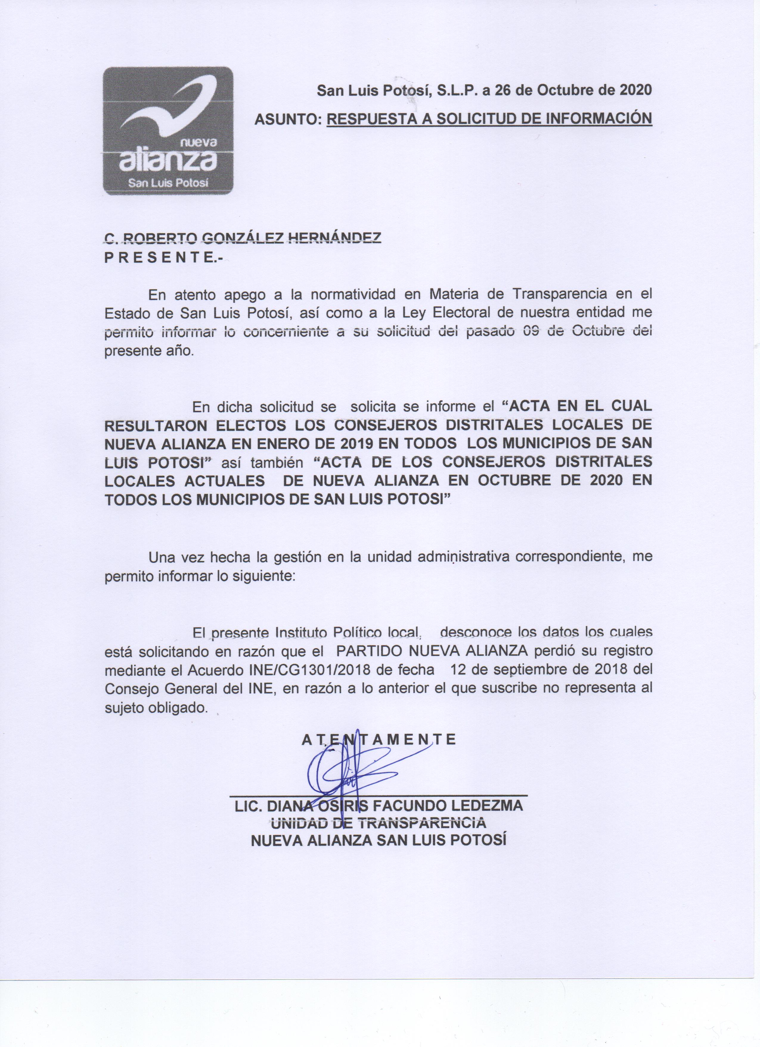 2020 01/10/2020 31/10/2020 “ACTA EN EL CUAL RESULTARON ELECTOS LOS CONSEJEROS DISTRITALES LOCALES DE NUEVA ALIANZA EN ENERO DE 2019 EN TODOS LOS MUNICIPIOS DE SAN LUIS POTOSI” así también “ACTA DE LOS CONSEJEROS DISTRITALES LOCALES ACTUALES DE NUEVA ALIANZA EN OCTUBRE DE 2020 EN TODOS LOS MUNICIPIOS DE SAN LUIS POTOSI” 26/10/2020 http://www.cegaipslp.org.mx/HV2020Dos.nsf/nombre_de_la_vista/F8FE959ED85BE8488625861C0054971A/$File/S.I.OCT2020+001.jpg UNIDAD DE TRANSPARENCIA 10/11/2020 10/11/2020 NO SE GENERA |
