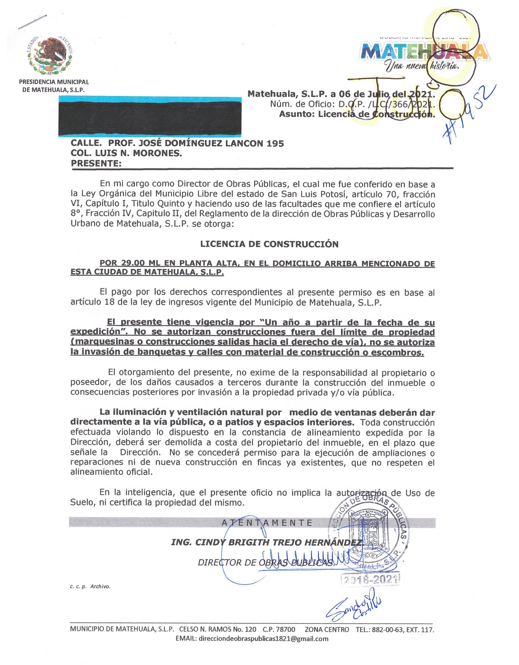 2021 01/07/2021 31/07/2021 D.O.P./L.C./376/2021 CONSTRUCCIÓN RICARDO LOPEZ ESTRADA N/A CALLE CIRCUITO OLIVO 107 0 FRACCIONAMIENTO LERDO DE TEJADA 20 MATEHUALA 20 MATEHUALA 24 San Luis Potosí 78700 "http://www.cegaipslp.org.mx/HV2021.nsf/nombre_de_la_vista/5027E0F886382BCA86258726005F2219/$File/16+RICARDO+LOPEZ+ALONSO.jpeg " 12/07/2021 12/07/2022 HABITACIONAL "http://www.cegaipslp.org.mx/HV2021.nsf/nombre_de_la_vista/B01118E31C91B2EB8625872700577647/$File/16+RICARDO+LOPEZ+ALONSO.jpeg " dirección de obras públicas 04/09/2021 04/08/2021 COBRO NORMAL