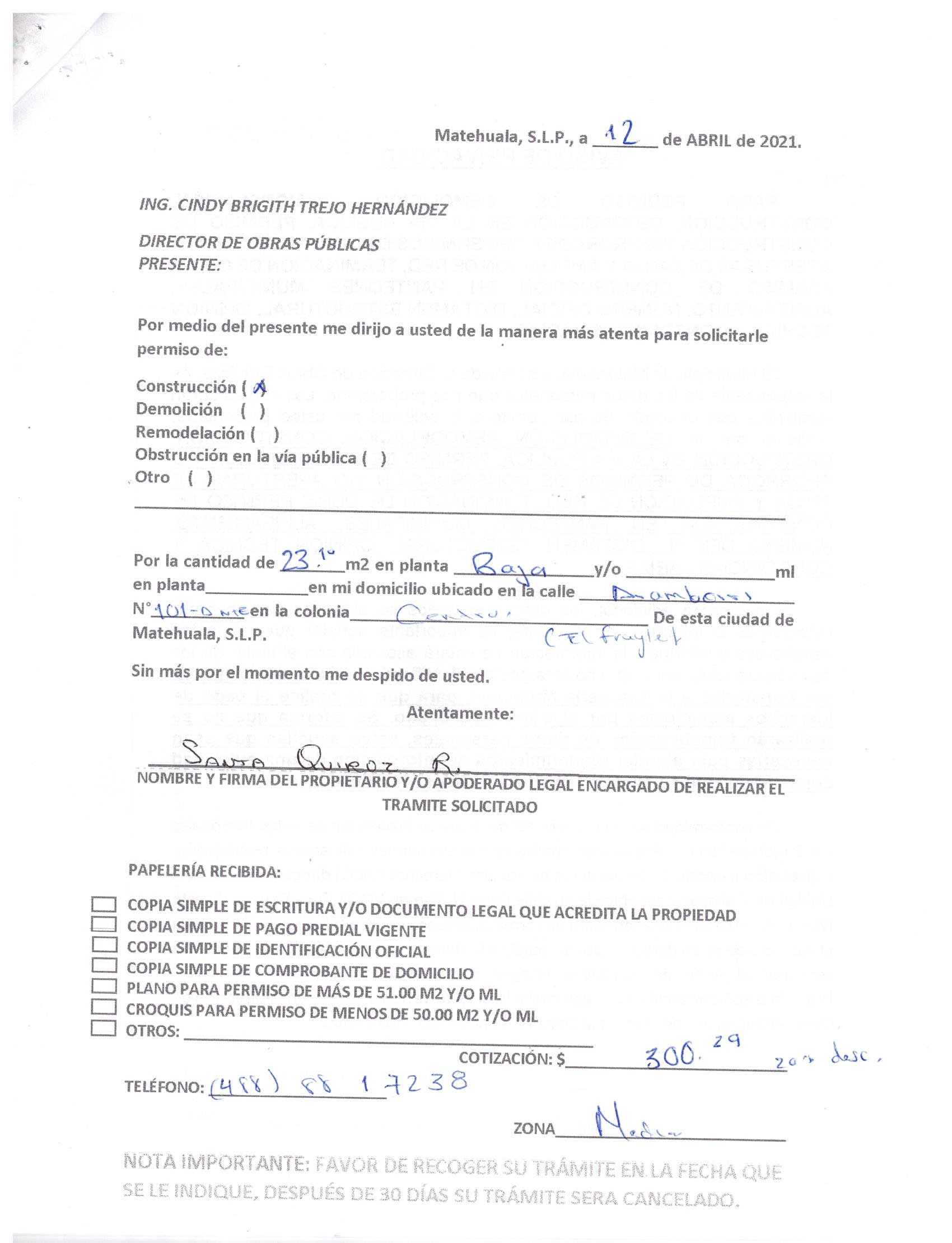 2021 01/04/2021 30/04/2021 D.O.P./L.C./203/2021 CONSTRUCCIÓN CRISTINA HERNANDEZ SEGURA NO SE GENERA CALLE GUERRERO 702 0 COLONIA REPÚBLICA 20 MATEHUALA 20 MATEHUALA 24 San Luis Potosí 78740 "http://www.cegaipslp.org.mx/HV2021.nsf/nombre_de_la_vista/64CB2015FD17DBD7862586CC00510FAA/$File/20+CRISTINA+HERNANDEZ+SEGURA.jpeg " 07/04/2021 07/04/2022 HABITACIONAL "http://www.cegaipslp.org.mx/HV2021.nsf/nombre_de_la_vista/F404E26F1F3F8673862586CC00615A29/$File/20+CRISTINA+HERNANDEZ+SEGURA.jpeg " DIRECCIÓN DE OBRAS PÚBLICAS 26/02/2022 26/01/2022 PAGO NORMAL