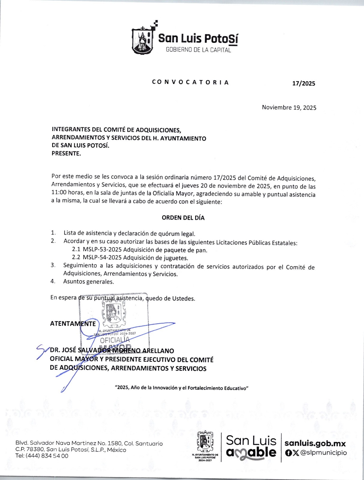 2025 01/11/2025 30/11/2025 Integración de la Cámara Nacinal de Comercio al Comité de Adquisiciones, Arrendamientos y Servicios del H. Ayuntamiento de San Luis Potosí Art.5 Bis de la Ley de Adquisiciones del Estado de San Luis Potosí y 32 fracción VIII del Reglamento de Adquisiciones del H. Ayuntamiento de San Luis Potosí, S.L.P. Transpareancia en procesos de adjudicación Transparentar los procedimientos de adquisición http://www.cegaipslp.org.mx/HV2025.nsf/nombre_de_la_vista/8142363D2443E69E06258D550054F95E/$File/Convocatoria+CAAS+17-2025.jpeg Procesos de adquisición Pertenecer a la Cámara Nacional de Comercio Con convocatoria y presentación de los asuntos a tratar físico y/o electónico 01/11/2025 30/11/2025 CAAS 17-2025 Dirección de Adquisiciones, Arrendamientos y Servicios 08/12/2025 No hay nota