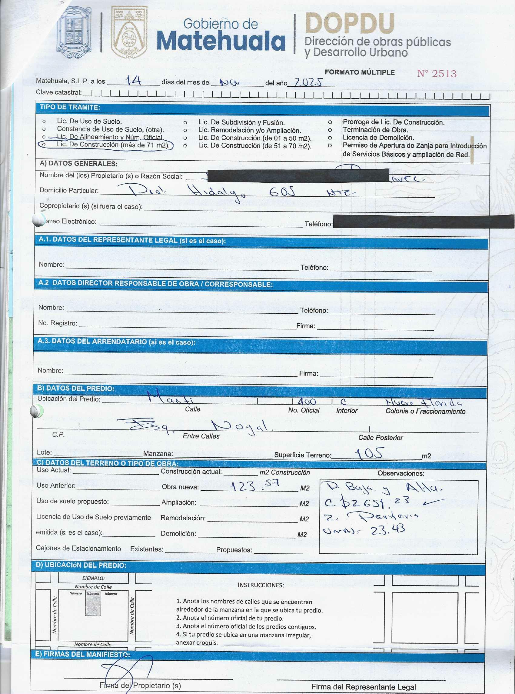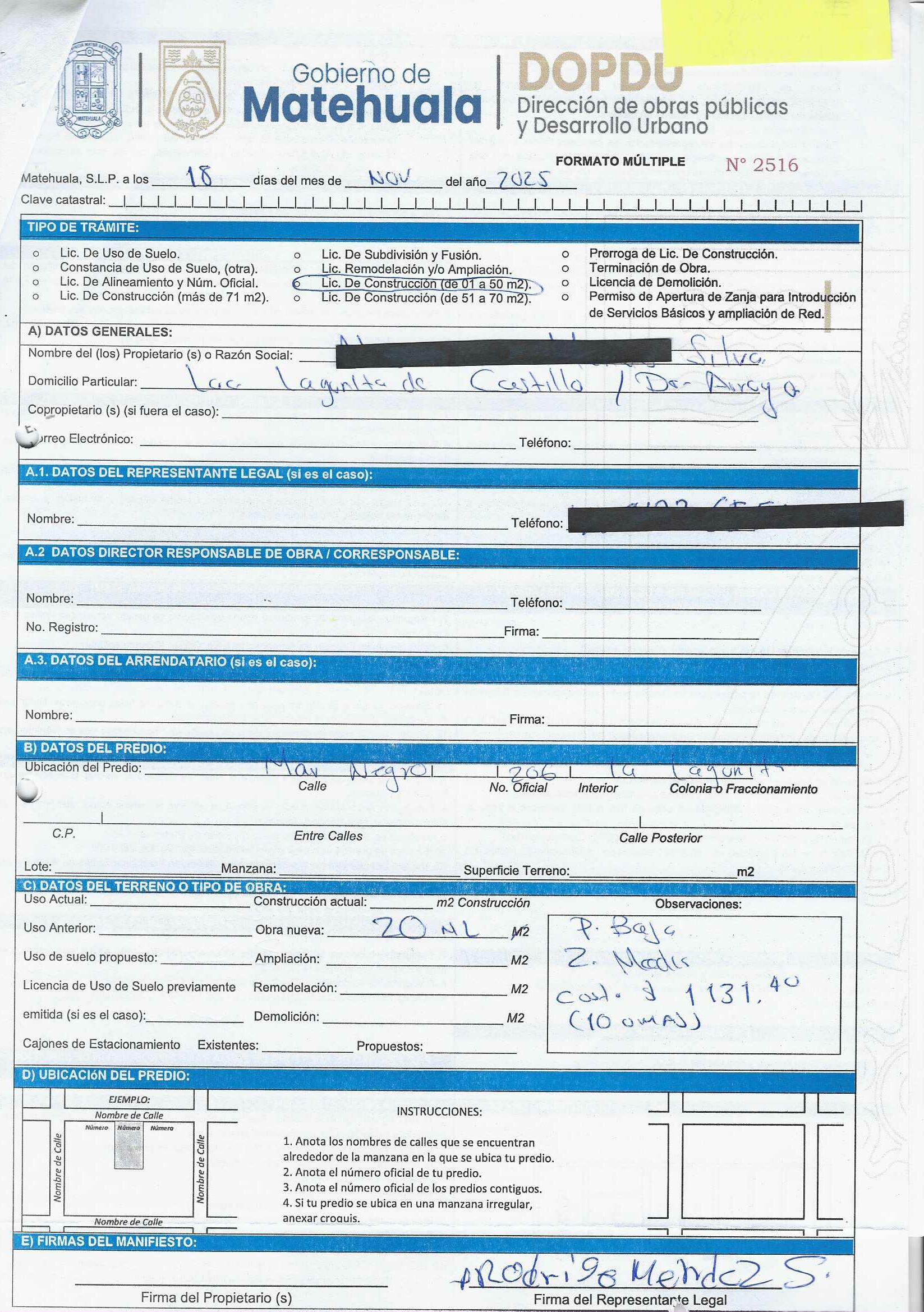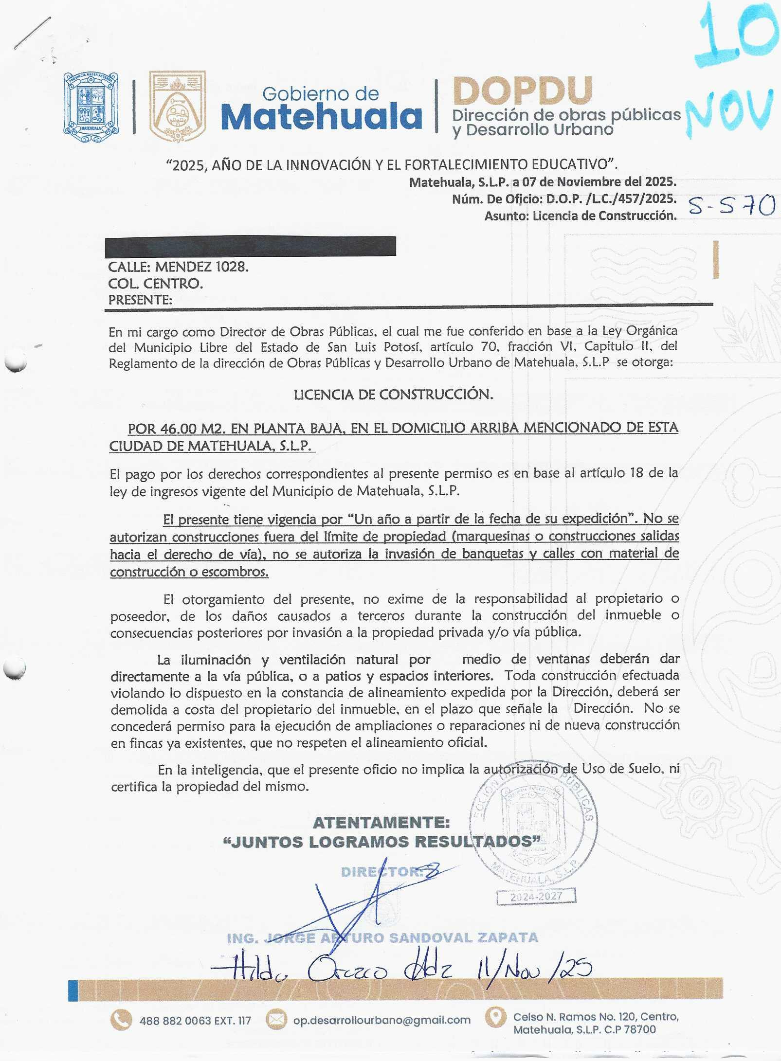 2025 01/11/2025 30/11/2025 DOP/LC/457/2025 CONSTRUCCION ANA MARIA ZAVALA PEREZ no se genero información Calle MENDEZ 1028 0 Colonia 20 MATEHUALA 20 MATEHUALA 24 San Luis Potosí 78700 http://www.cegaipslp.org.mx/HV2025.nsf/nombre_de_la_vista/873FF39A423C1C2306258D5A006C6EC6/$File/10+ANA+MARIA+ZAVALA+PEREZ.jpg 11/11/2025 11/11/2026 HABITACIONAL "http://www.cegaipslp.org.mx/HV2025.nsf/nombre_de_la_vista/05A4C2310D650AE306258D5B00544D8F/$File/10+ANA+MARIA+ZAVALA+PEREZ.jpg " DIRECCIÓN DE OBRAS PÚBLICAS Y DESARROLLO URBANO 09/12/2025 COBRO NORMAL