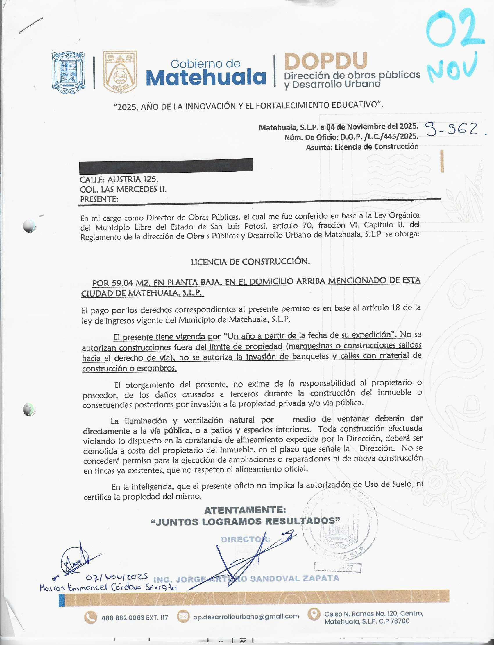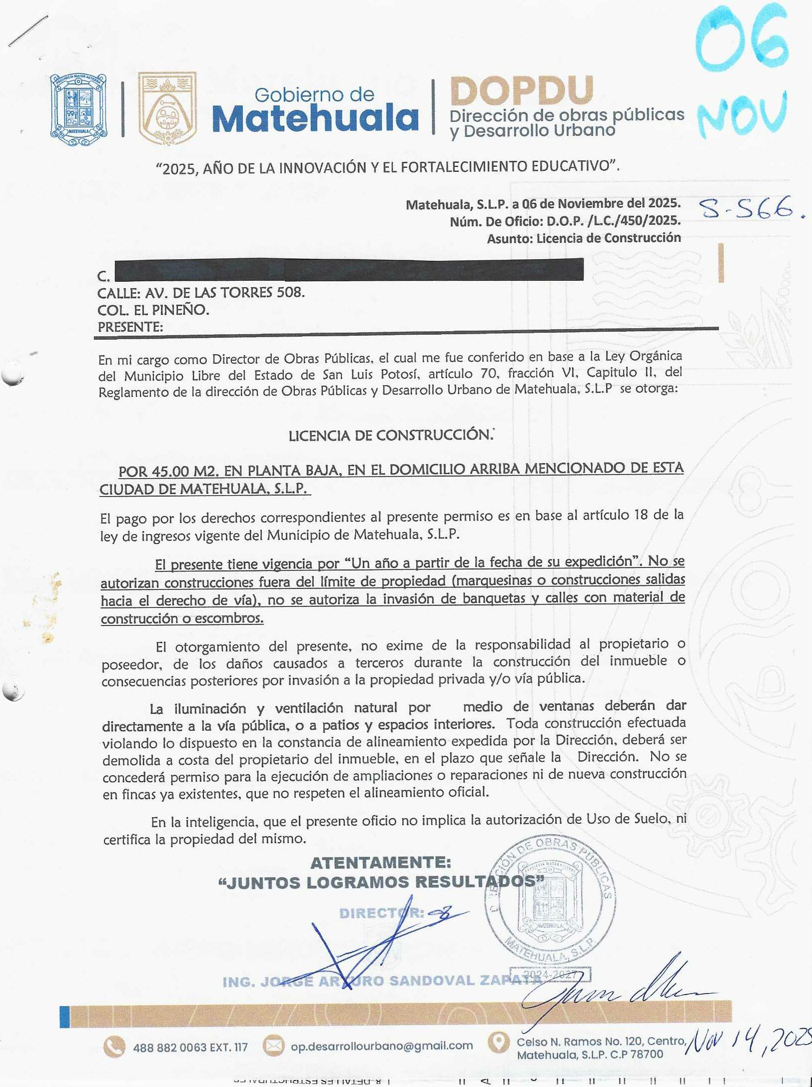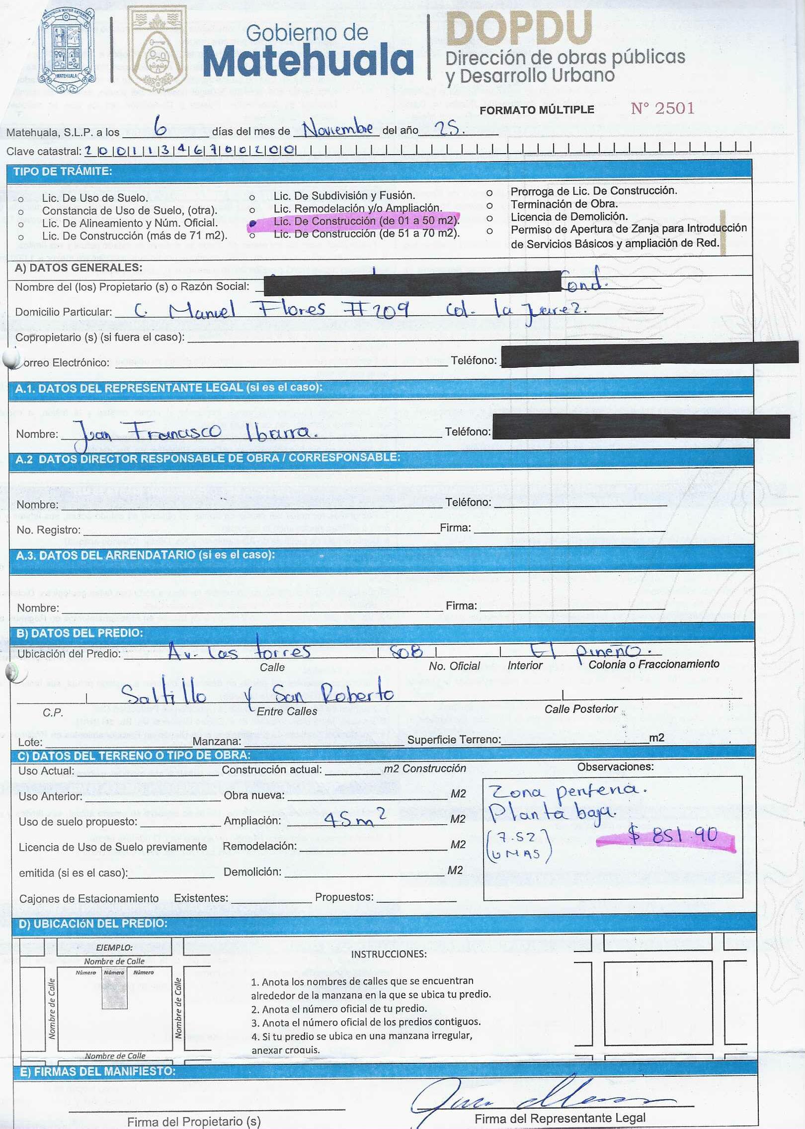 2025 01/11/2025 30/11/2025 DOP/LC/450/2025 CONSTRUCCION CRUZ MANUEL IBARRA no se genero información no se genero información Calle AV. LAS TORRES 508 0 Colonia 20 MATEHUALA 20 MATEHUALA 24 San Luis Potosí 78730 "http://www.cegaipslp.org.mx/HV2025.nsf/nombre_de_la_vista/9073681DF997D2B706258D5A006C4ABF/$File/06+CRUZ+MANUEL+IBARRA.jpg " 13/11/2025 13/11/2026 HABITACIONAL "http://www.cegaipslp.org.mx/HV2025.nsf/nombre_de_la_vista/5916375B1D007E4106258D5B0053E9EE/$File/06+CRUZ+MANUEL+IBARRA.jpg " DIRECCIÓN DE OBRAS PÚBLICAS Y DESARROLLO URBANO 09/12/2025 COBRO NORMAL