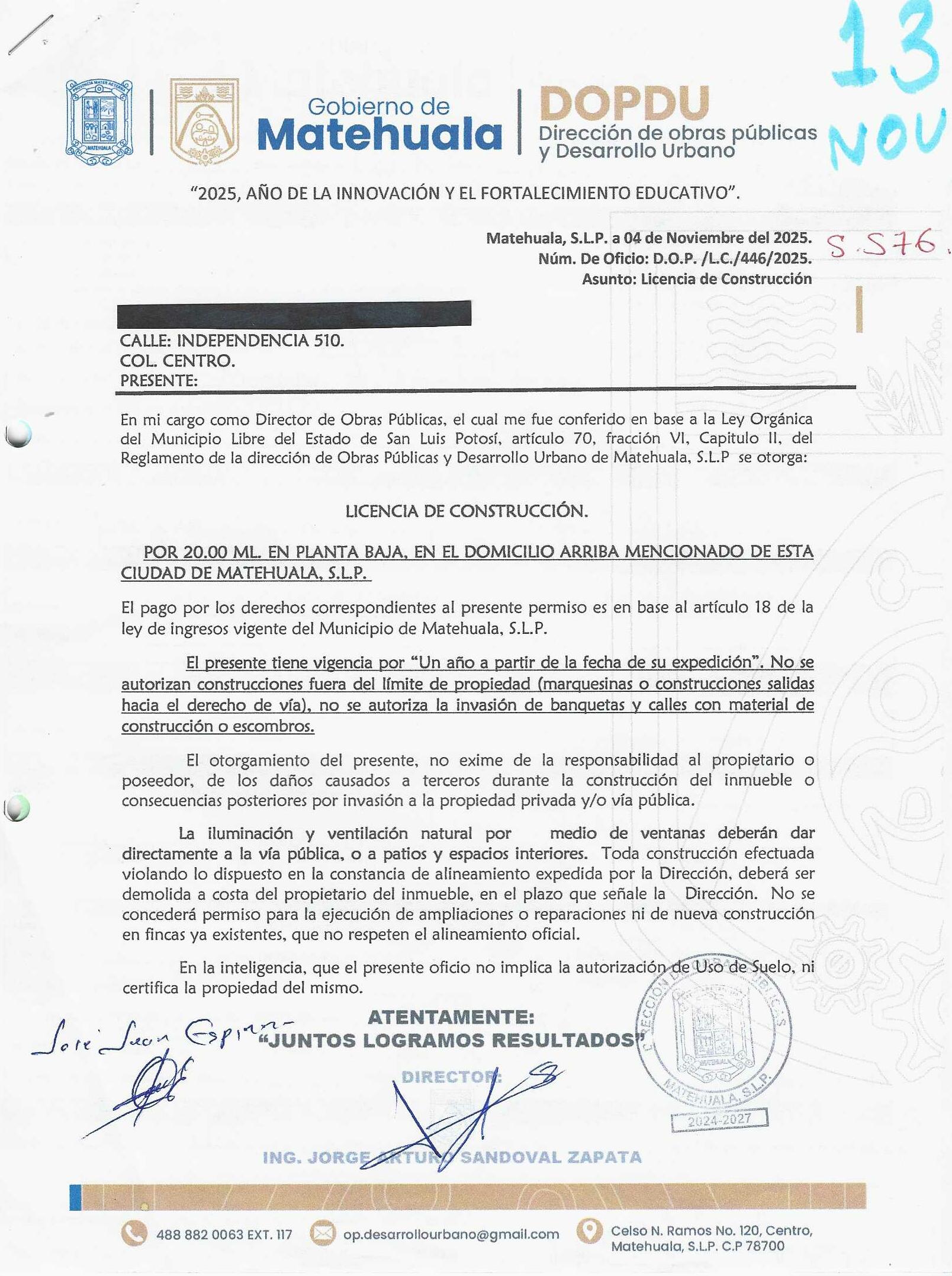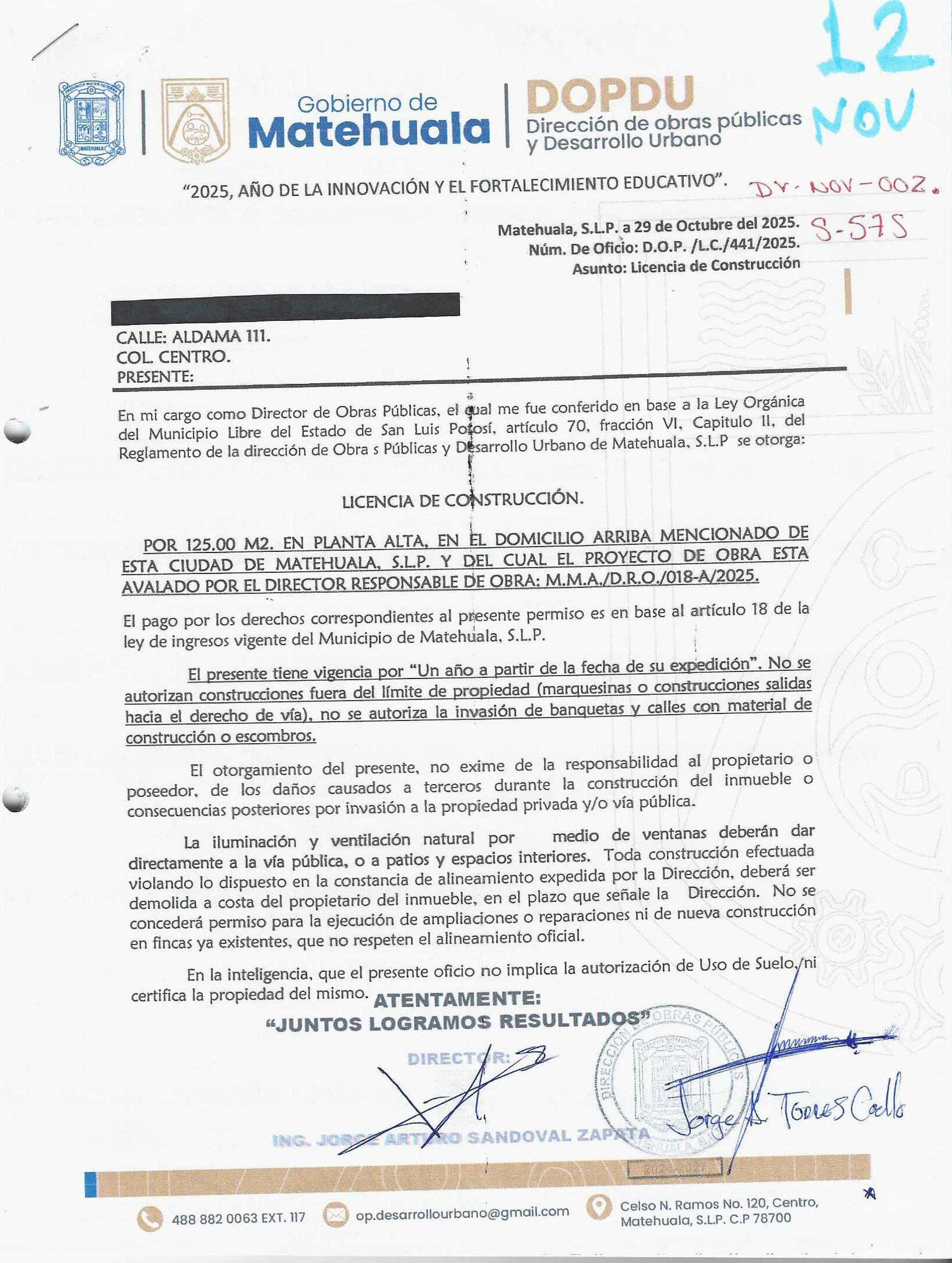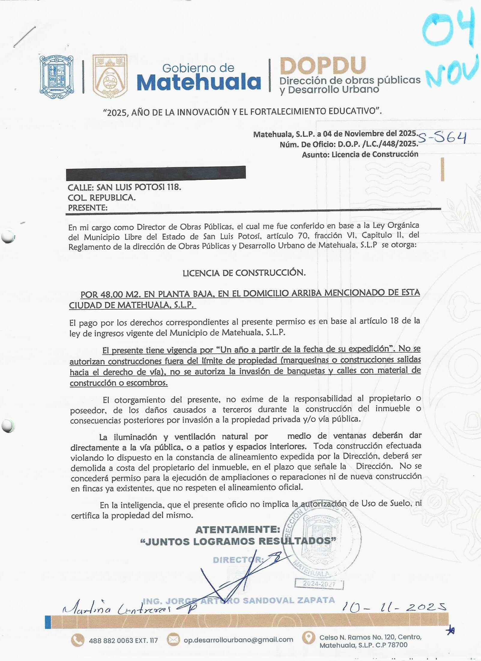 2025 01/11/2025 30/11/2025 DOP/LC/450/2025 CONSTRUCCION CRUZ MANUEL IBARRA no se genero información no se genero información Calle AV. LAS TORRES 508 0 Colonia 20 MATEHUALA 20 MATEHUALA 24 San Luis Potosí 78730 "http://www.cegaipslp.org.mx/HV2025.nsf/nombre_de_la_vista/9073681DF997D2B706258D5A006C4ABF/$File/06+CRUZ+MANUEL+IBARRA.jpg " 13/11/2025 13/11/2026 HABITACIONAL "http://www.cegaipslp.org.mx/HV2025.nsf/nombre_de_la_vista/5916375B1D007E4106258D5B0053E9EE/$File/06+CRUZ+MANUEL+IBARRA.jpg " DIRECCIÓN DE OBRAS PÚBLICAS Y DESARROLLO URBANO 09/12/2025 COBRO NORMAL
