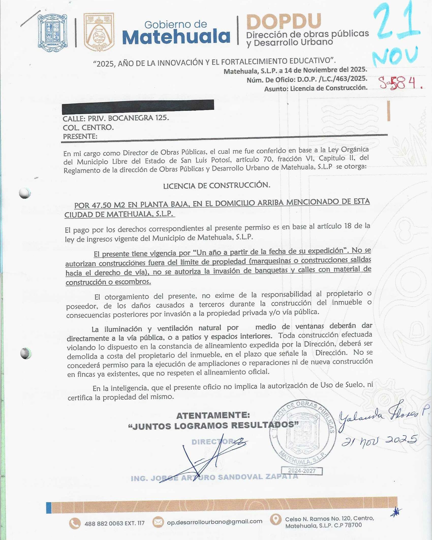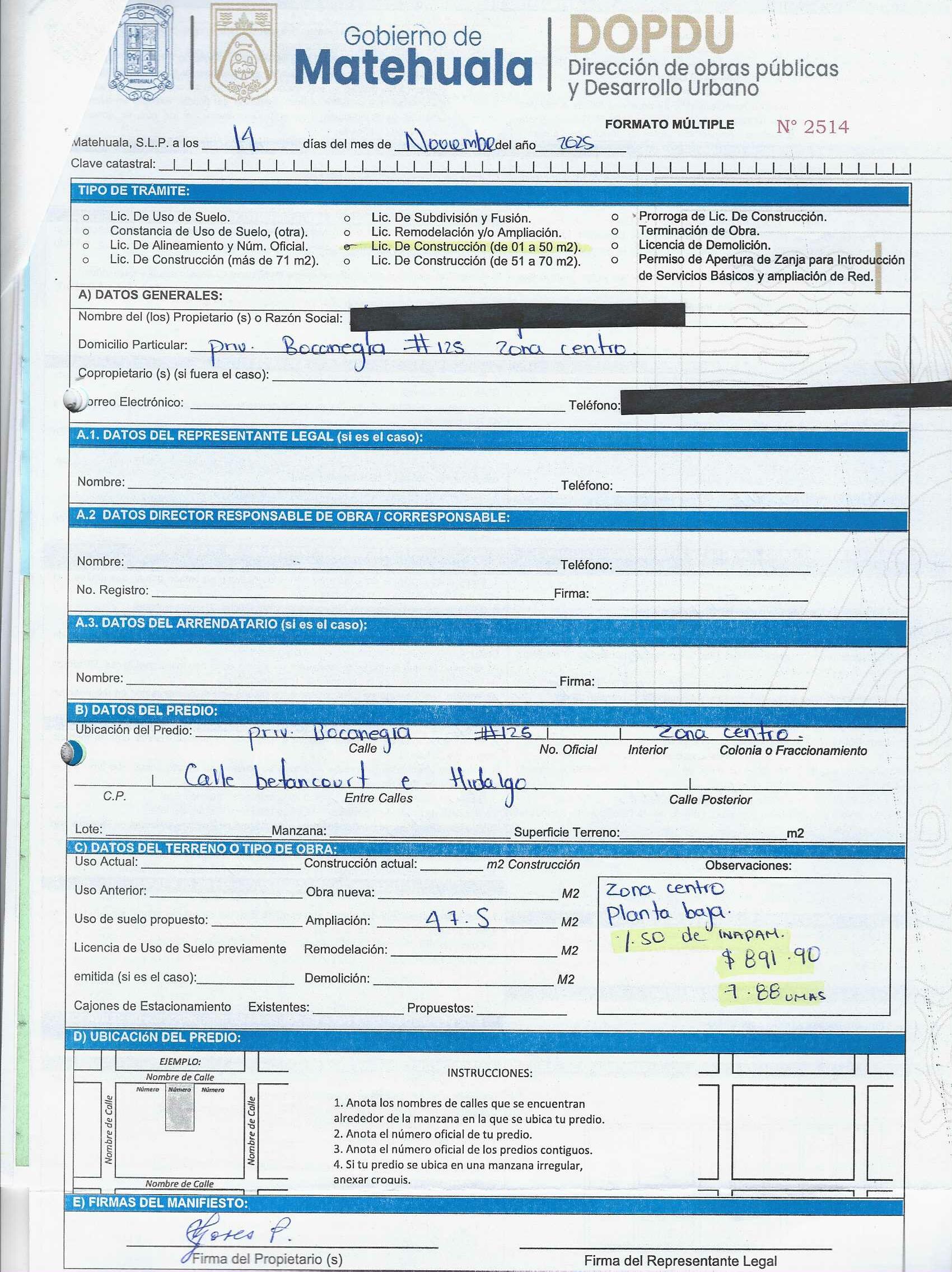 2025 01/11/2025 30/11/2025 DOP/LC/463/2025 CONSTRUCCION YOLANDA FLORES PECINA no se genero información Calle PRIV. BOCANEGRA 125 0 Colonia 20 MATEHUALA 20 MATEHUALA 24 San Luis Potosí 78700 "http://www.cegaipslp.org.mx/HV2025.nsf/nombre_de_la_vista/CFB93B5AA18D494B06258D5A006D7208/$File/21+YOLANDA+FLORES+PECINA.jpg " 21/11/2025 21/11/2026 HABITACIONAL "http://www.cegaipslp.org.mx/HV2025.nsf/nombre_de_la_vista/11CBD7F4CE7BAA3B06258D5B0055AF1A/$File/21+YOLANDA+FLORES+PECINA.jpg " DIRECCIÓN DE OBRAS PÚBLICAS Y DESARROLLO URBANO 09/12/2025 COBRO NORMAL
