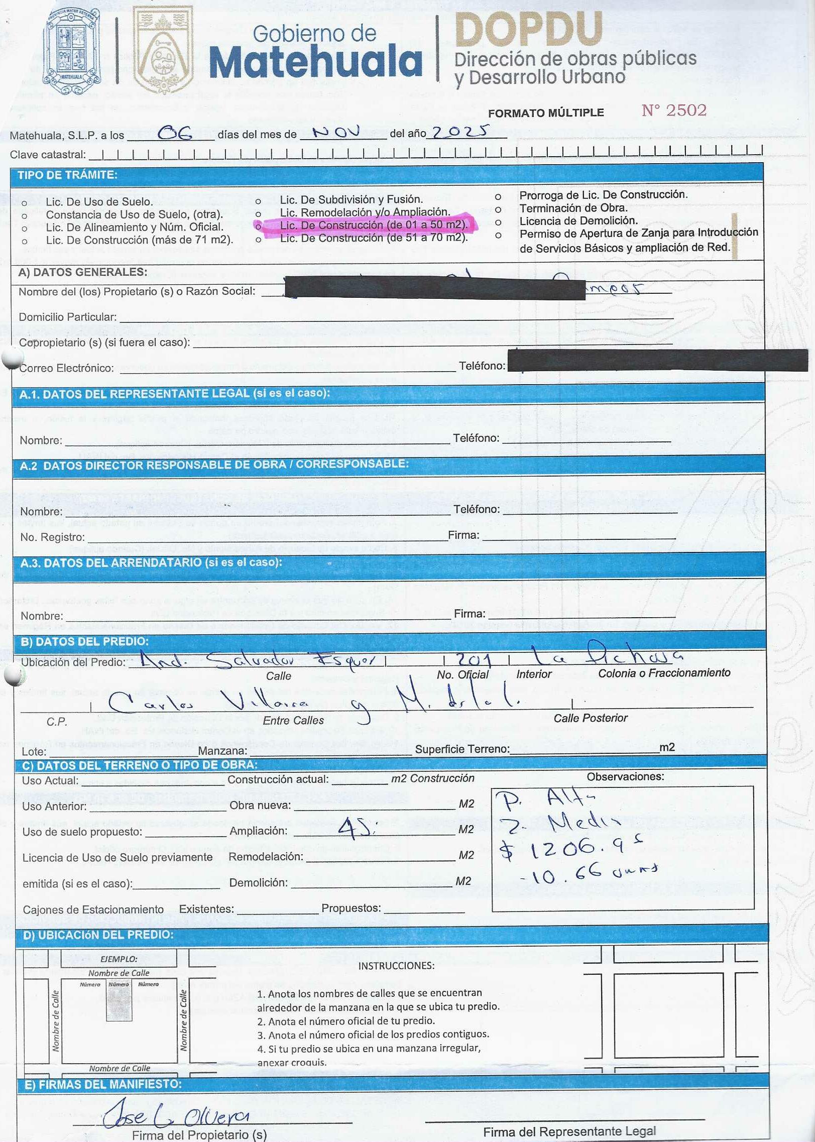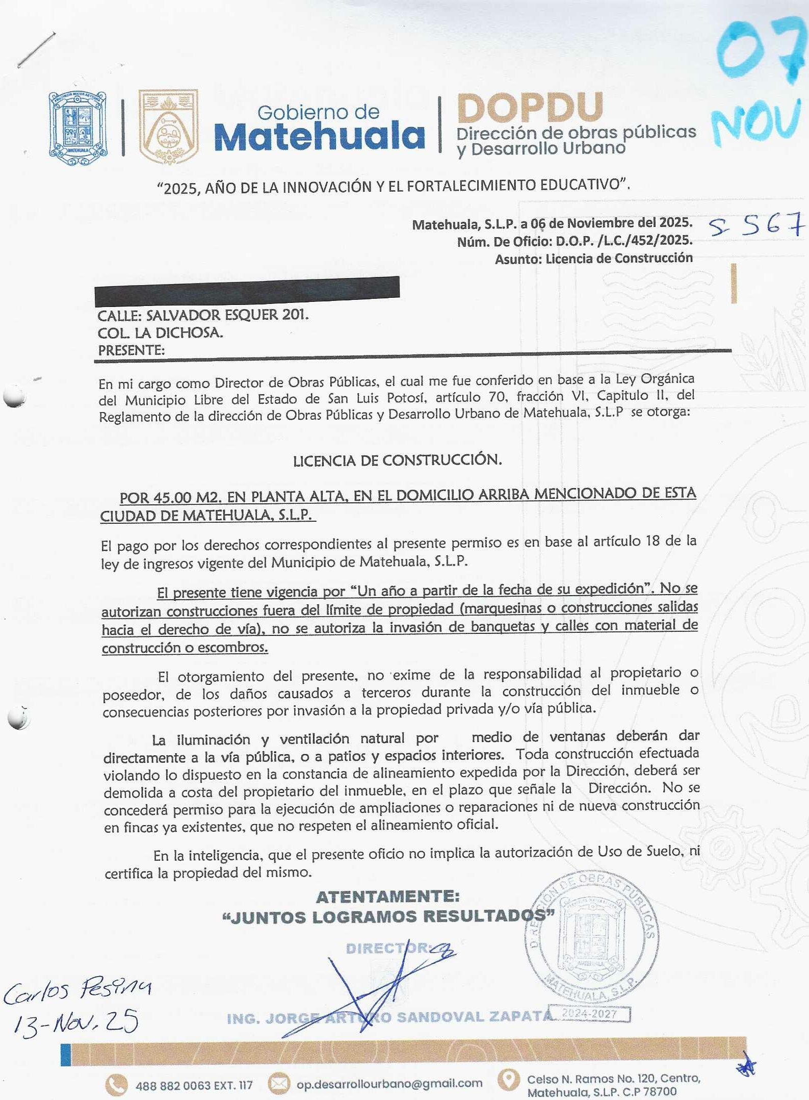 2025 01/11/2025 30/11/2025 DOP/LC/452/2025 CONSTRUCCION JOSE LUIS OLVERA CAMPOS no se genero información Calle SALVADOR ESQUER 201 0 Colonia 20 MATEHUALA 20 MATEHUALA 24 San Luis Potosí 78779 "http://www.cegaipslp.org.mx/HV2025.nsf/nombre_de_la_vista/CC96C80CC15B4B7A06258D5A006C5773/$File/07+JOSE+LUIS+OLVERA+CAMPOS.jpg " 6/11/2025 6/11/2026 HABITACIONAL "http://www.cegaipslp.org.mx/HV2025.nsf/nombre_de_la_vista/1FE88A9887CE3CB506258D5B0053F7B7/$File/07+JOSE+LUIS+OLVERA+CAMPOS.jpg " DIRECCIÓN DE OBRAS PÚBLICAS Y DESARROLLO URBANO 09/12/2025 COBRO NORMAL