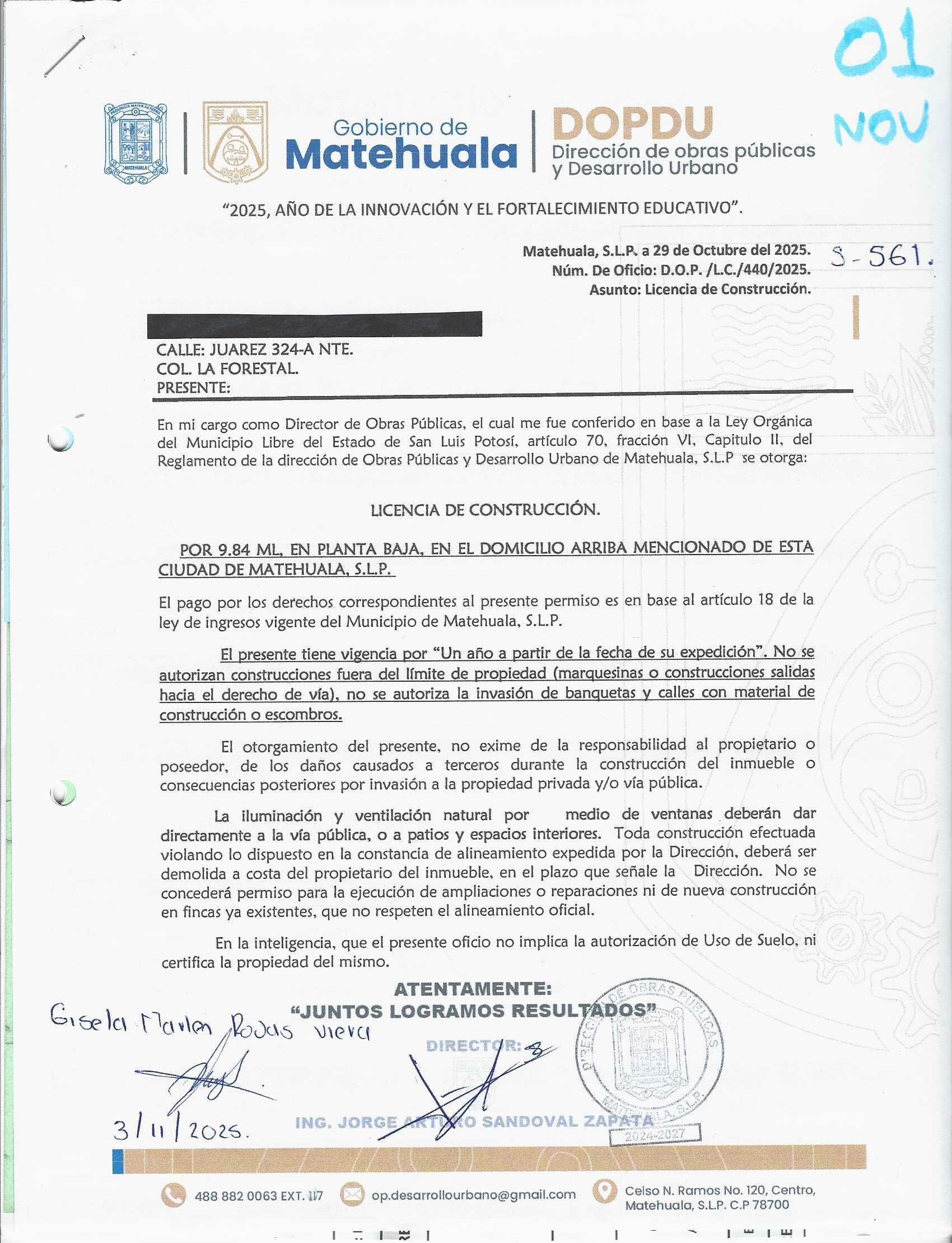 2025 01/11/2025 30/11/2025 DOP/LC/440/2025 CONSTRUCCION ESTHELA EGUIA BARRON no se genero información Calle JUAREZ 324 A- NORTE Colonia 20 MATEHUALA 20 MATEHUALA 24 San Luis Potosí 78730 "http://www.cegaipslp.org.mx/HV2025.nsf/nombre_de_la_vista/25147B74F4E6C12606258D5A006473DC/$File/01+ESTHELA+EGUIA+BARRON.jpg " 3/11/2025 3/11/2026 HABITACIONAL "http://www.cegaipslp.org.mx/HV2025.nsf/nombre_de_la_vista/20554C2211012DCC06258D5A006E58CD/$File/01+ESTHELA+EGUIA+BARRON.jpg " DIRECCIÓN DE OBRAS PÚBLICAS Y DESARROLLO URBANO 09/12/2025 COBRO NORMAL
