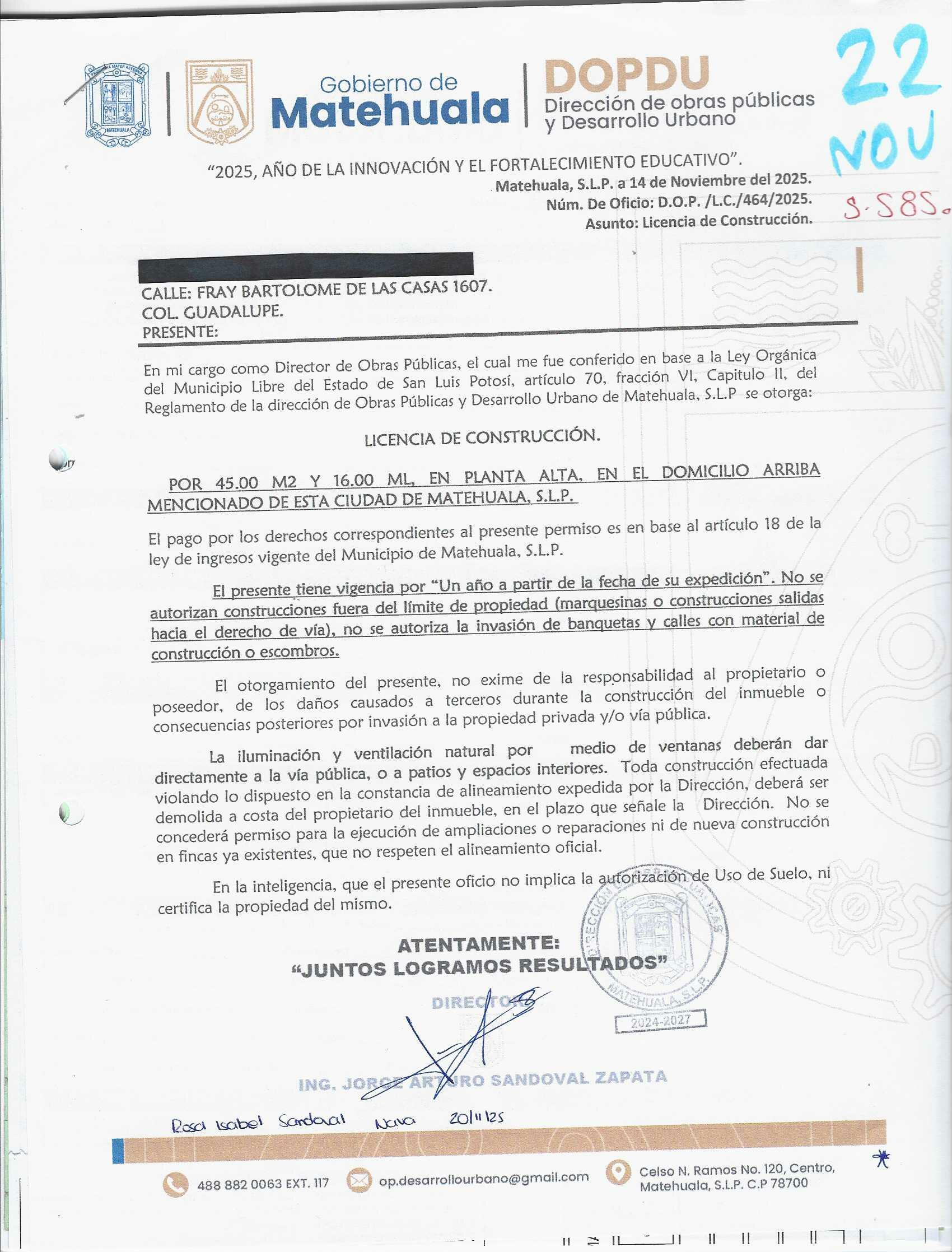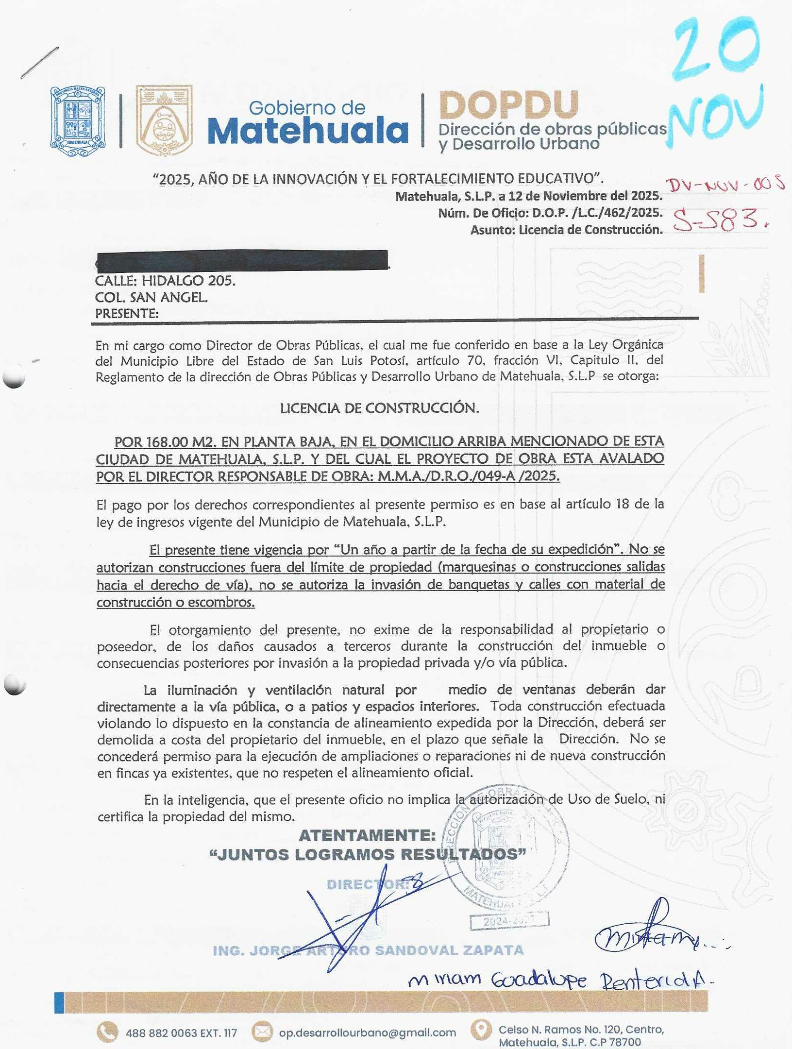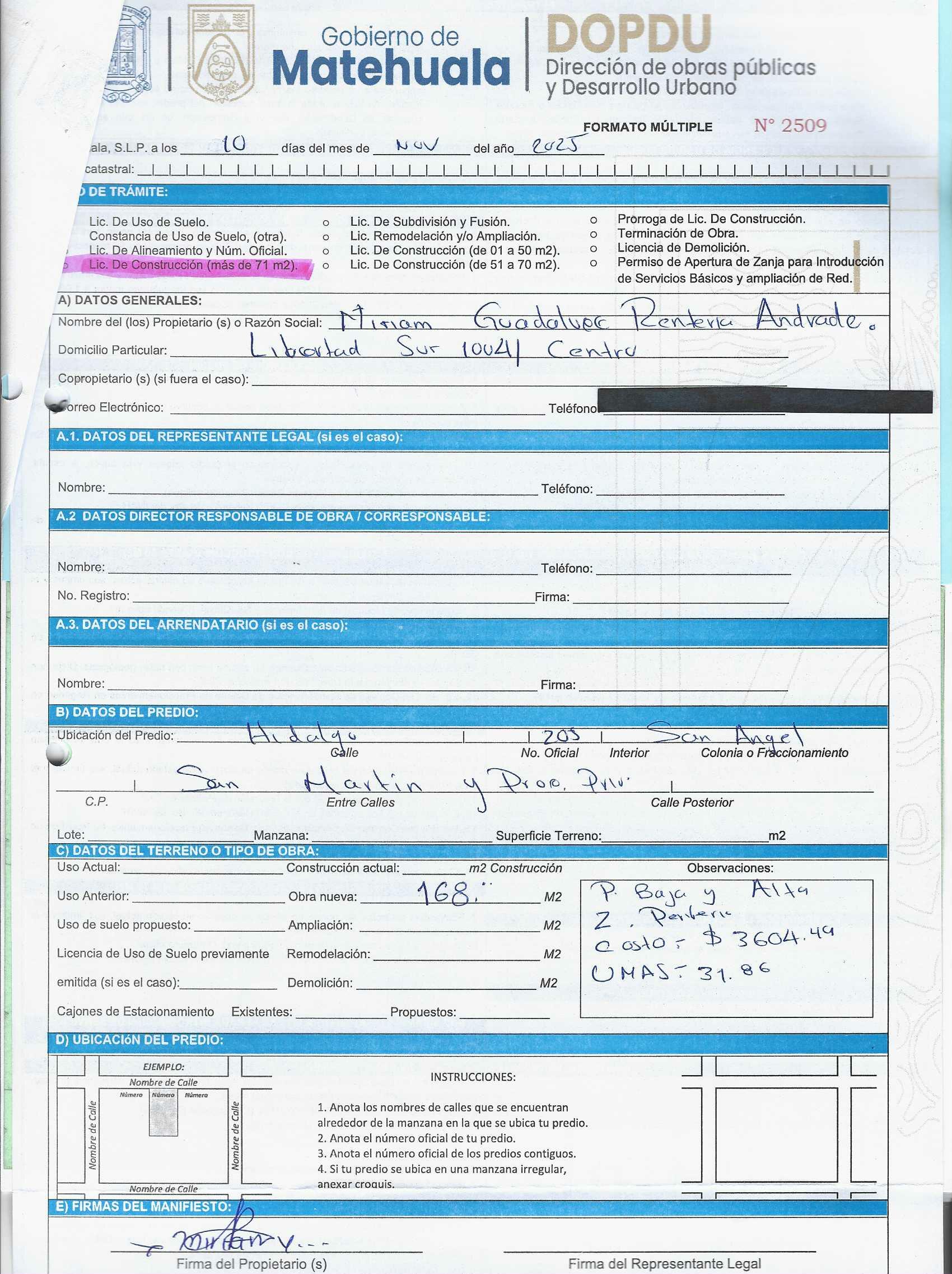 2025 01/11/2025 30/11/2025 DOP/LC/462/2025 CONSTRUCCION MIRIAM GUADALUPE RENTERIA ANDRADE no se genero información Calle HIDALGO 205 0 Colonia 20 MATEHUALA 20 MATEHUALA 24 San Luis Potosí 78784 "http://www.cegaipslp.org.mx/HV2025.nsf/nombre_de_la_vista/45E27D09BA4B2A4506258D5A006D569F/$File/20+MIRIAM+GUADALUPE+RENTERIA+ANDRADE.jpg " 18/11/2025 18/11/2026 HABITACIONAL "http://www.cegaipslp.org.mx/HV2025.nsf/nombre_de_la_vista/97E01B1D09723D1606258D5B00558E0A/$File/20+MIRIAM+GUADALUPE+RENTERIA+ANDRADE.jpg " DIRECCIÓN DE OBRAS PÚBLICAS Y DESARROLLO URBANO 09/12/2025 COBRO NORMAL