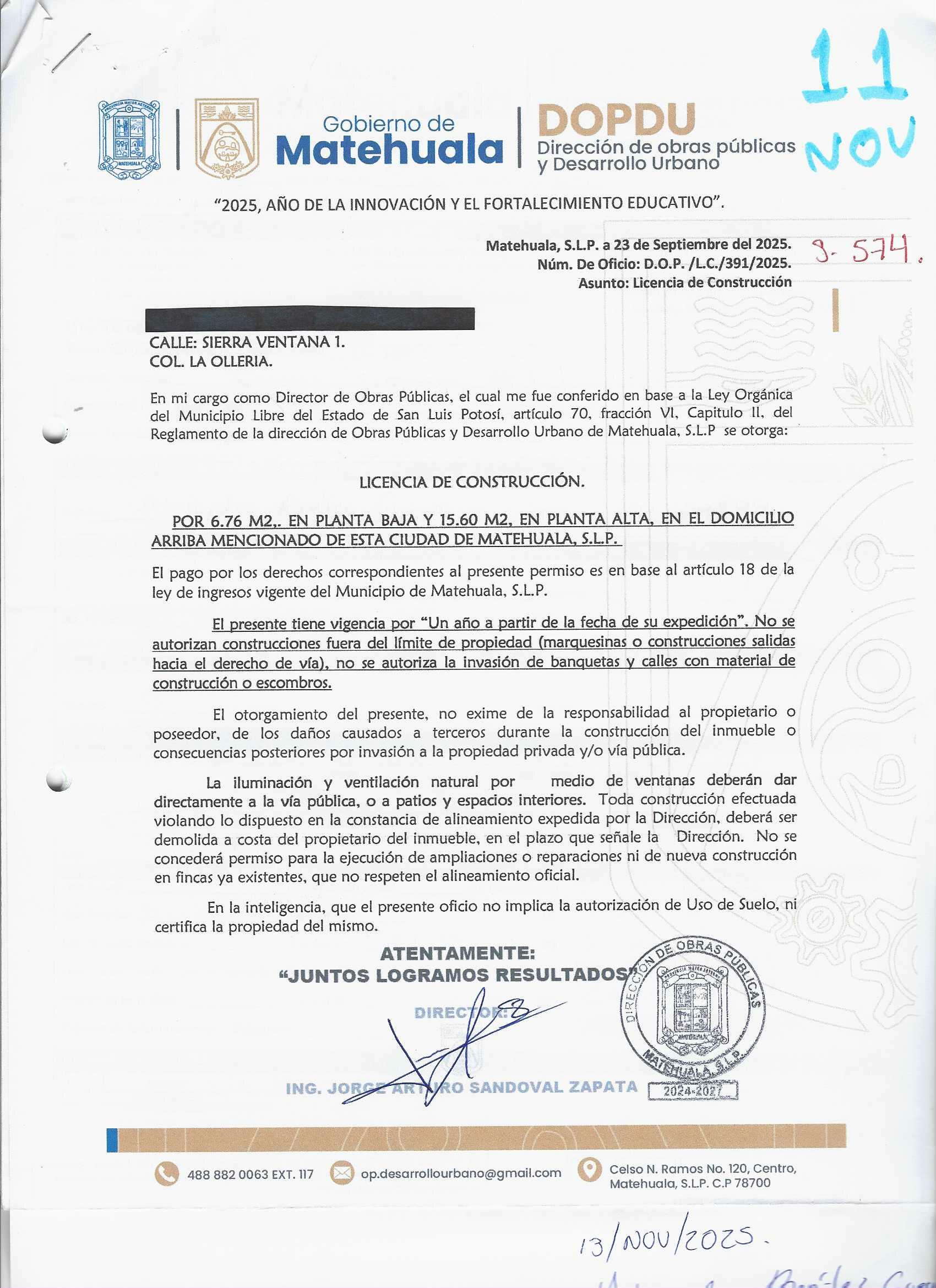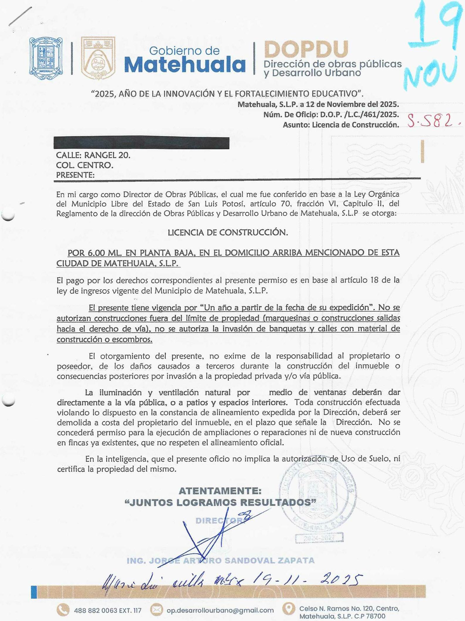 2025 01/11/2025 30/11/2025 DOP/LC/461/2025 CONSTRUCCION GENARO ZEPEDA JIMENEZ no se genero información Calle RANGEL 20 0 Colonia 20 MATEHUALA 20 MATEHUALA 24 San Luis Potosí 78700 "http://www.cegaipslp.org.mx/HV2025.nsf/nombre_de_la_vista/CC8801628707D38006258D5A006D41C8/$File/19+GENARO+ZEPEDA+JIMENEZ.jpg " 19/11/2025 19-11-2026 HABITACIONAL "http://www.cegaipslp.org.mx/HV2025.nsf/nombre_de_la_vista/E82E85AD7ACD6B1606258D5B00557ED9/$File/19+GENARO+ZEPEDA+JIMENEZ.jpg " DIRECCIÓN DE OBRAS PÚBLICAS Y DESARROLLO URBANO 09/12/2025 COBRO NORMAL