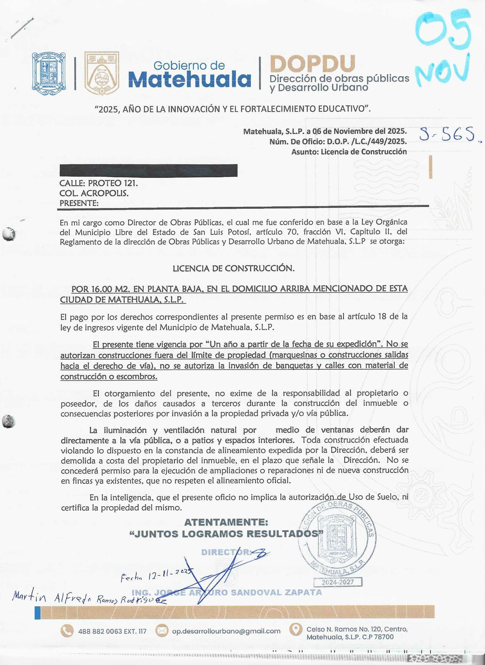 2025 01/11/2025 30/11/2025 DOP/LC/449/2025 CONSTRUCCION MARTIN ALFREDO RAMOS RODRIGUEZ no se genero información Calle PROTEO 121 0 Colonia 20 MATEHUALA 20 MATEHUALA 24 San Luis Potosí 78724 "http://www.cegaipslp.org.mx/HV2025.nsf/nombre_de_la_vista/0AAB9C10C7A1036306258D5A0064AA12/$File/05+MARTIN+ALFREDO+RAMOS+RODRIGUEZ.jpg " 5/11/2025 5/11/2026 HABITACIONAL "http://www.cegaipslp.org.mx/HV2025.nsf/nombre_de_la_vista/787D9EB95D12379206258D5B0053DB1F/$File/05+MARTIN+ALFREDO+RAMOS+RODRIGUEZ.jpg " DIRECCIÓN DE OBRAS PÚBLICAS Y DESARROLLO URBANO 09/12/2025 COBRO NORMAL