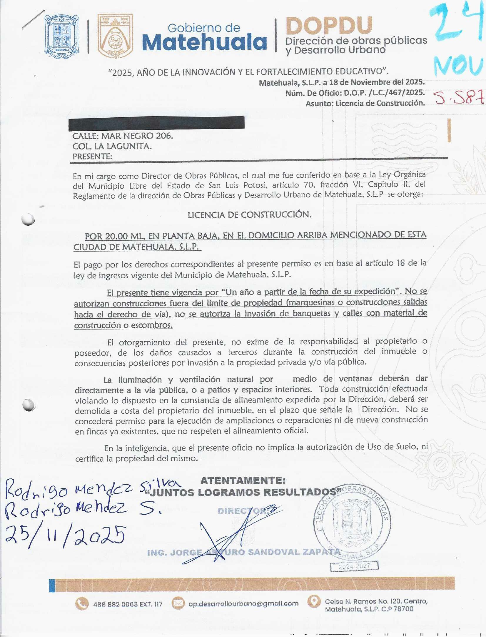 2025 01/11/2025 30/11/2025 DOP/LC/467/2025 CONSTRUCCION ALEJANDRO MENDEZ SILVA no se genero información Calle MAR NEGRO 206 0 Colonia 20 MATEHUALA 20 MATEHUALA 24 San Luis Potosí 78770 "http://www.cegaipslp.org.mx/HV2025.nsf/nombre_de_la_vista/5EE13F1971FE58BA06258D5A006E0833/$File/24+ALEJANDRO+MENDEZ+SILVA.jpg " 25/11/2025 25/11/2026 HABITACIONAL "http://www.cegaipslp.org.mx/HV2025.nsf/nombre_de_la_vista/A37AC49F3B0567F906258D5B0055D3EE/$File/24+ALEJANDRO+MENDEZ+SILVA.jpg " DIRECCIÓN DE OBRAS PÚBLICAS Y DESARROLLO URBANO 09/12/2025 COBRO NORMAL