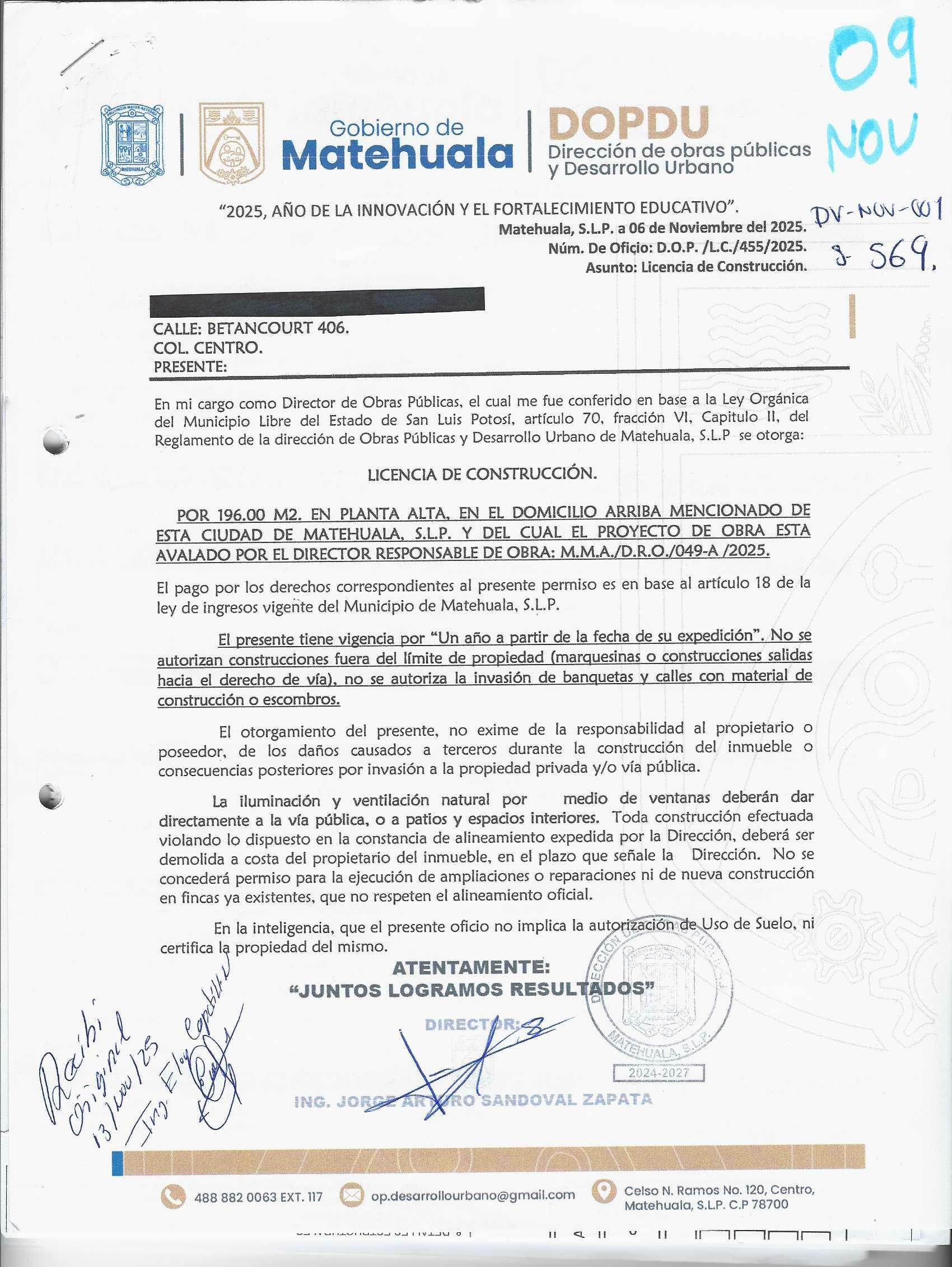 2025 01/11/2025 30/11/2025 DOP/LC/455/2025 CONSTRUCCION JUAN MANUEL ORTA GARCIA no se genero información Calle BETANCOURT 406 0 Colonia 20 MATEHUALA 20 MATEHUALA 24 San Luis Potosí 78700 "http://www.cegaipslp.org.mx/HV2025.nsf/nombre_de_la_vista/C3495E42D110A43D06258D5A006C99B1/$File/09+JUAN+MANUEL+ORTA+GARCIA.jpg " 13/11/2025 13/11/2026 HABITACIONAL "http://www.cegaipslp.org.mx/HV2025.nsf/nombre_de_la_vista/A750AE319940C96506258D5B00540A33/$File/09+JUAN+MANUEL+ORTA+GARCIA.jpg " DIRECCIÓN DE OBRAS PÚBLICAS Y DESARROLLO URBANO 09/12/2025 COBRO NORMAL