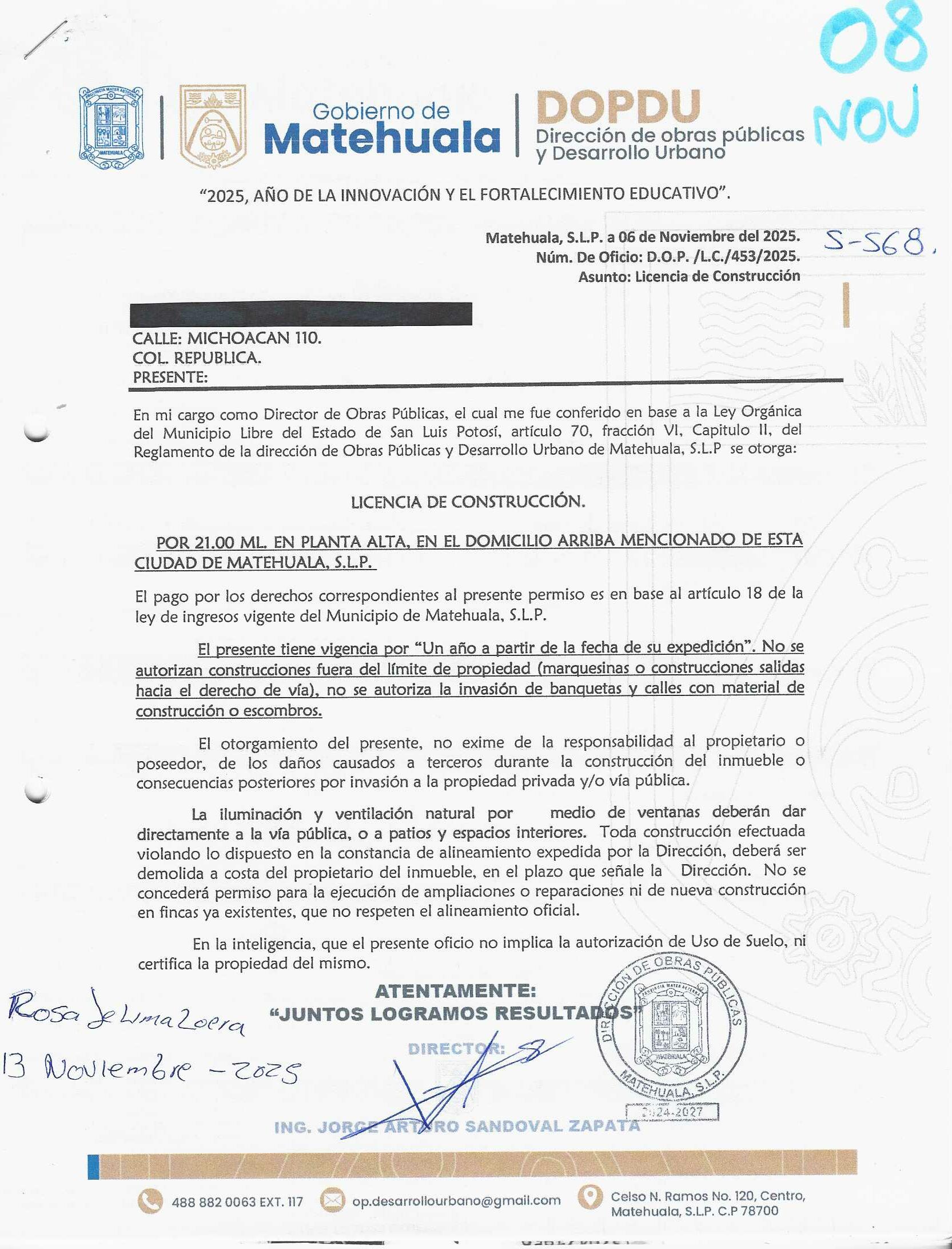 2025 01/11/2025 30/11/2025 DOP/LC/453/2025 CONSTRUCCION JOSEFINA HERRERA EGUIA no se genero información Calle MICHOACAN 110 0 Colonia 20 MATEHUALA 20 MATEHUALA 24 San Luis Potosí 78740 "http://www.cegaipslp.org.mx/HV2025.nsf/nombre_de_la_vista/A35E2A6365E776EA06258D5A006C654E/$File/08+JOSEFINA+HERRERA+EGUIA.jpg " 6/11/2025 6/11/2026 HABITACIONAL "http://www.cegaipslp.org.mx/HV2025.nsf/nombre_de_la_vista/C0D2939F065F0ED006258D5B00541693/$File/08+JOSEFINA+HERRERA+EGUIA.jpg " DIRECCIÓN DE OBRAS PÚBLICAS Y DESARROLLO URBANO 09/12/2025 COBRO NORMAL