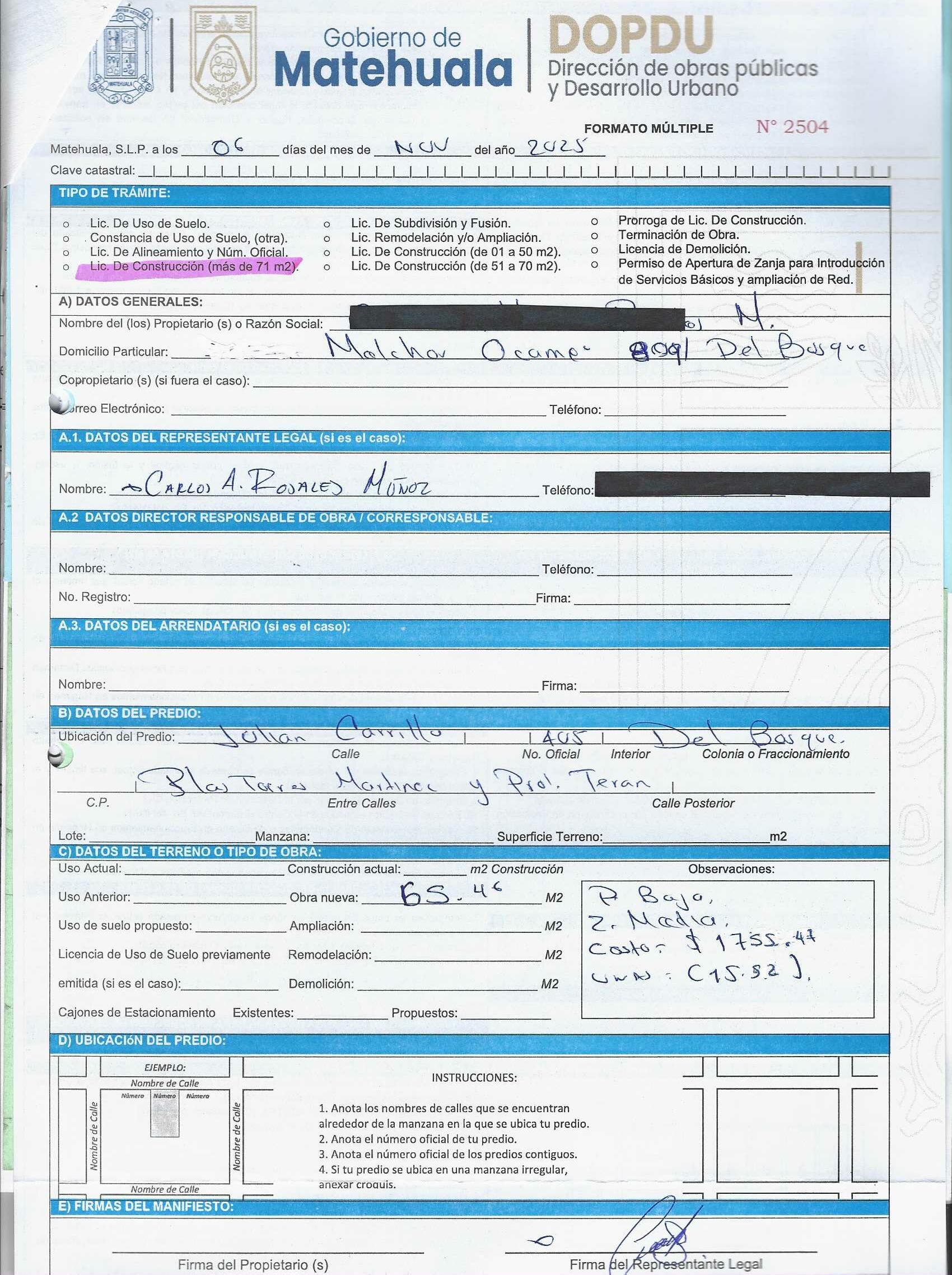 2025 01/11/2025 30/11/2025 DOP/LC/454/2025 CONSTRUCCION CARLOS ALBERTO ROSALES MENDOZA no se genero información Calle JULIAN CARRILLO 405 0 Colonia 20 MATEHUALA 20 MATEHUALA 24 San Luis Potosí 78785 "http://www.cegaipslp.org.mx/HV2025.nsf/nombre_de_la_vista/C85651F4E149129F06258D5A006D0D75/$File/15+CARLOS+ALBERTO+ROSALES+MENDOZA.jpg " 13/11/2025 13/11/2026 HABITACIONAL "http://www.cegaipslp.org.mx/HV2025.nsf/nombre_de_la_vista/ED1B30B20633DD2106258D5B0054D2F8/$File/15+CARLOS+ALBERTO+ROSALES+MENDOZA.jpg " DIRECCIÓN DE OBRAS PÚBLICAS Y DESARROLLO URBANO 09/12/2025 COBRO NORMAL