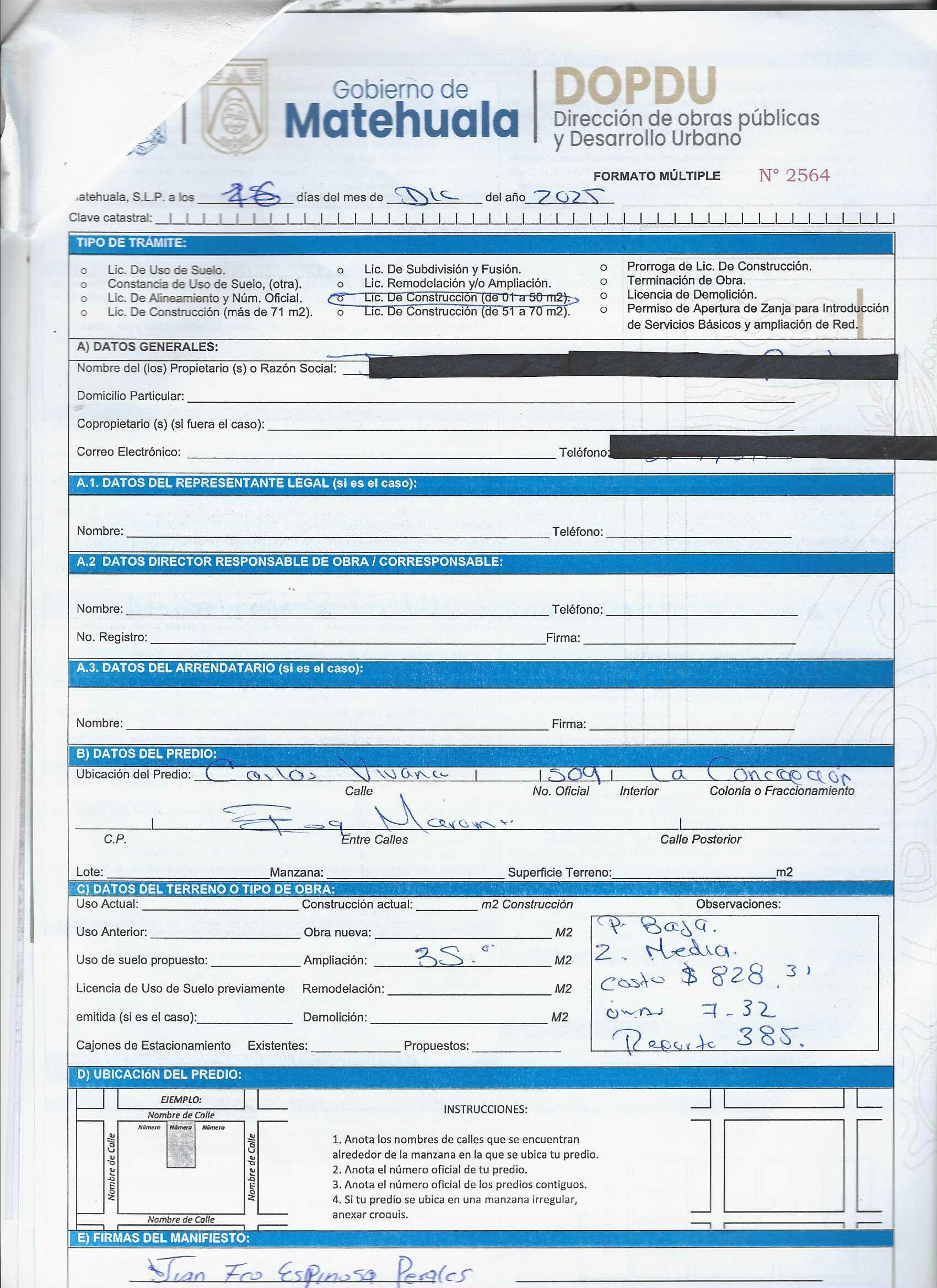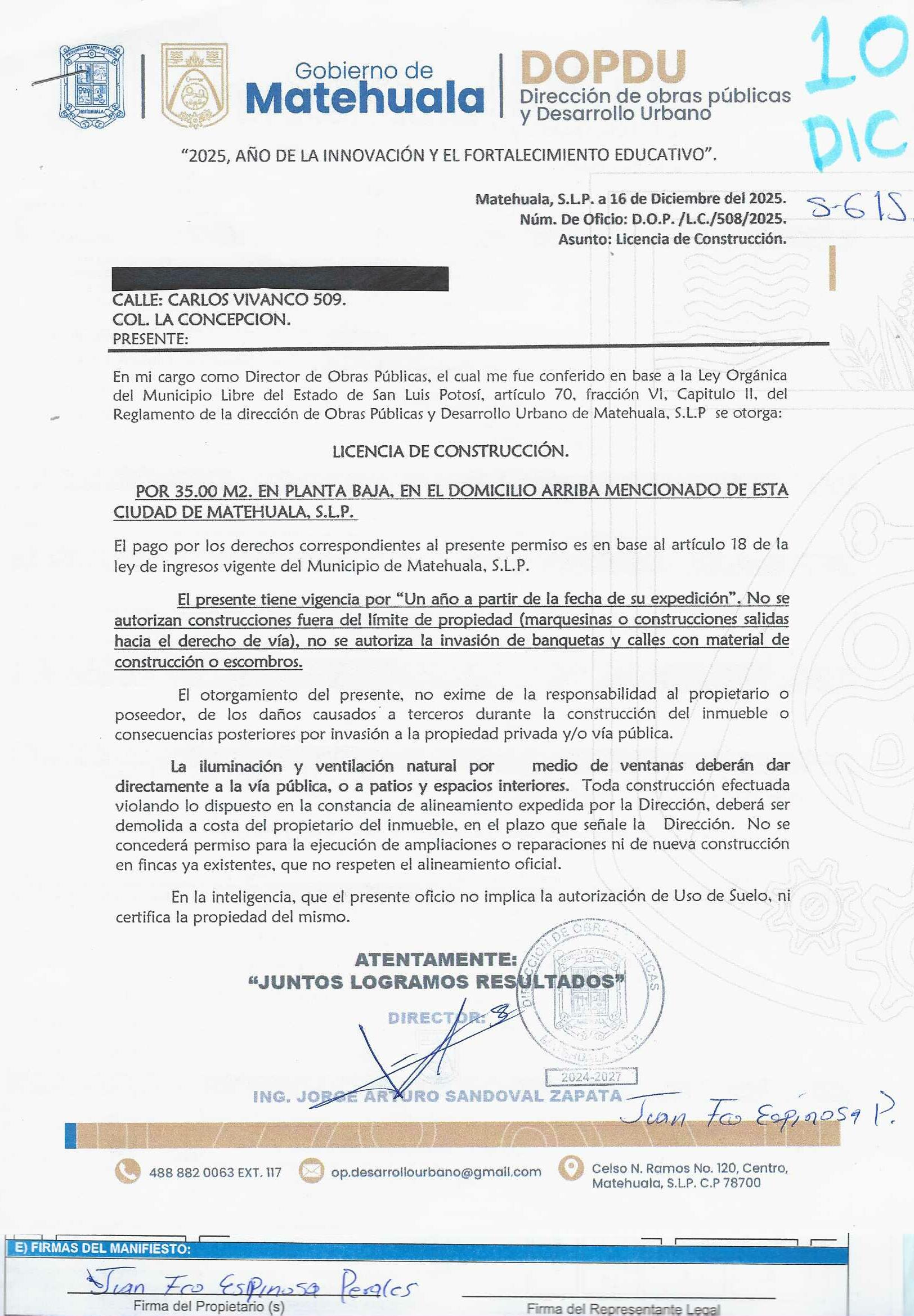 2025 01/12/2025 31/12/2025 DOP/LC/508/2025 CONSTRUCCION JUAN FRANCISCO ESPINOSA PERALES CARLOS VIVANCO Calle CARLOS VIVANCO 509 0 Colonia LA CONCEPCION 20 MATEHUALA 20 MATEHUALA 24 San Luis Potosí 78798 "http://www.cegaipslp.org.mx/HV2025.nsf/nombre_de_la_vista/05B92406E558408606258D76006FE9B7/$File/10+JUAN+FRANCISCO+ESPINOSA+PERALES.jpg " 16/12/2025 16/12/2026 HABITACIONAL "http://www.cegaipslp.org.mx/HV2025.nsf/nombre_de_la_vista/2941F477EDCDC18A06258D7600718E03/$File/10+JUAN+FRANCISCO+ESPINOSA+PERALES.jpg " DIRECCIÓN DE OBRAS PÚBLICAS Y DESARROLLO URBANO 05/01/2026 COBRO NORMAL