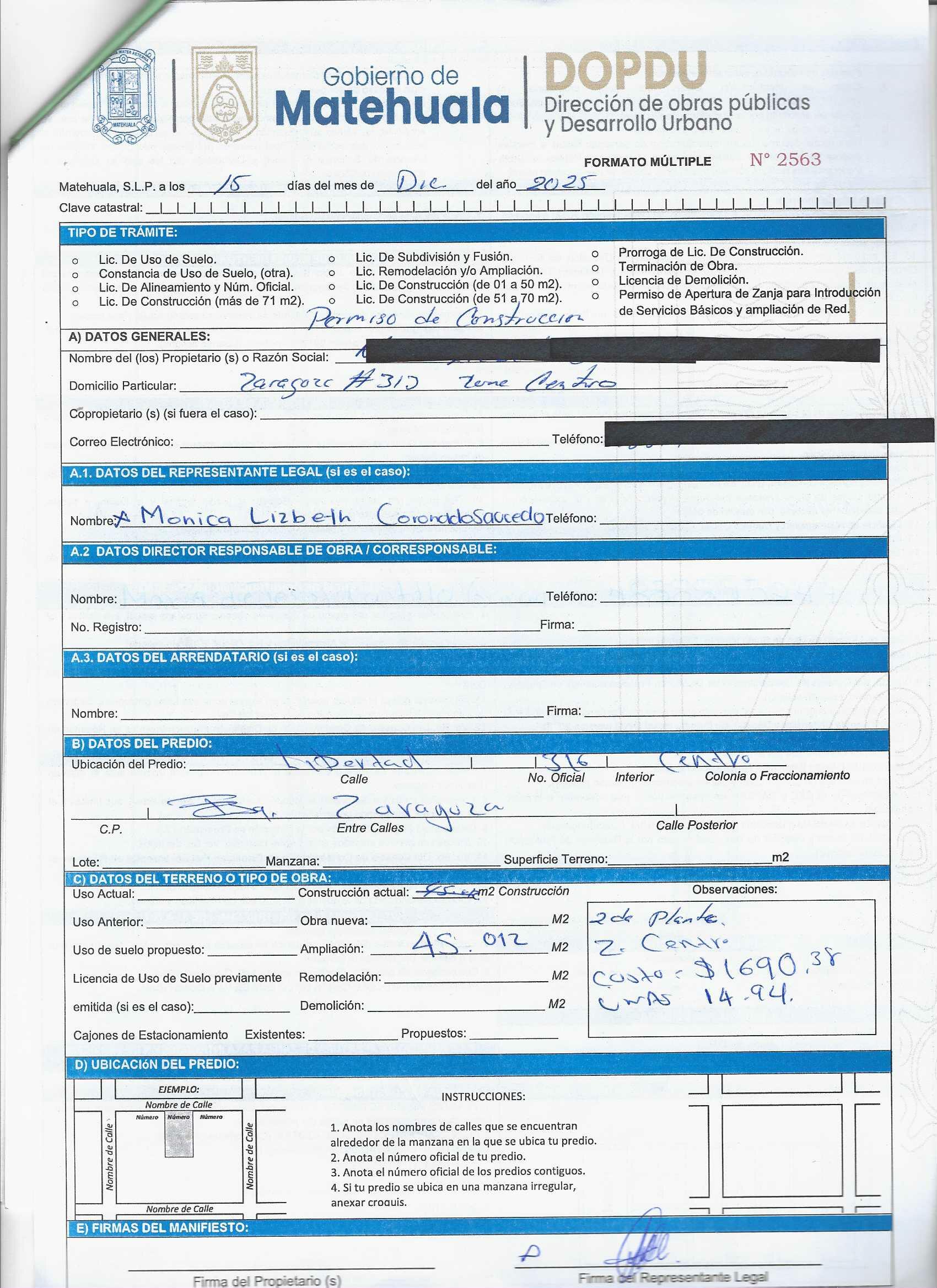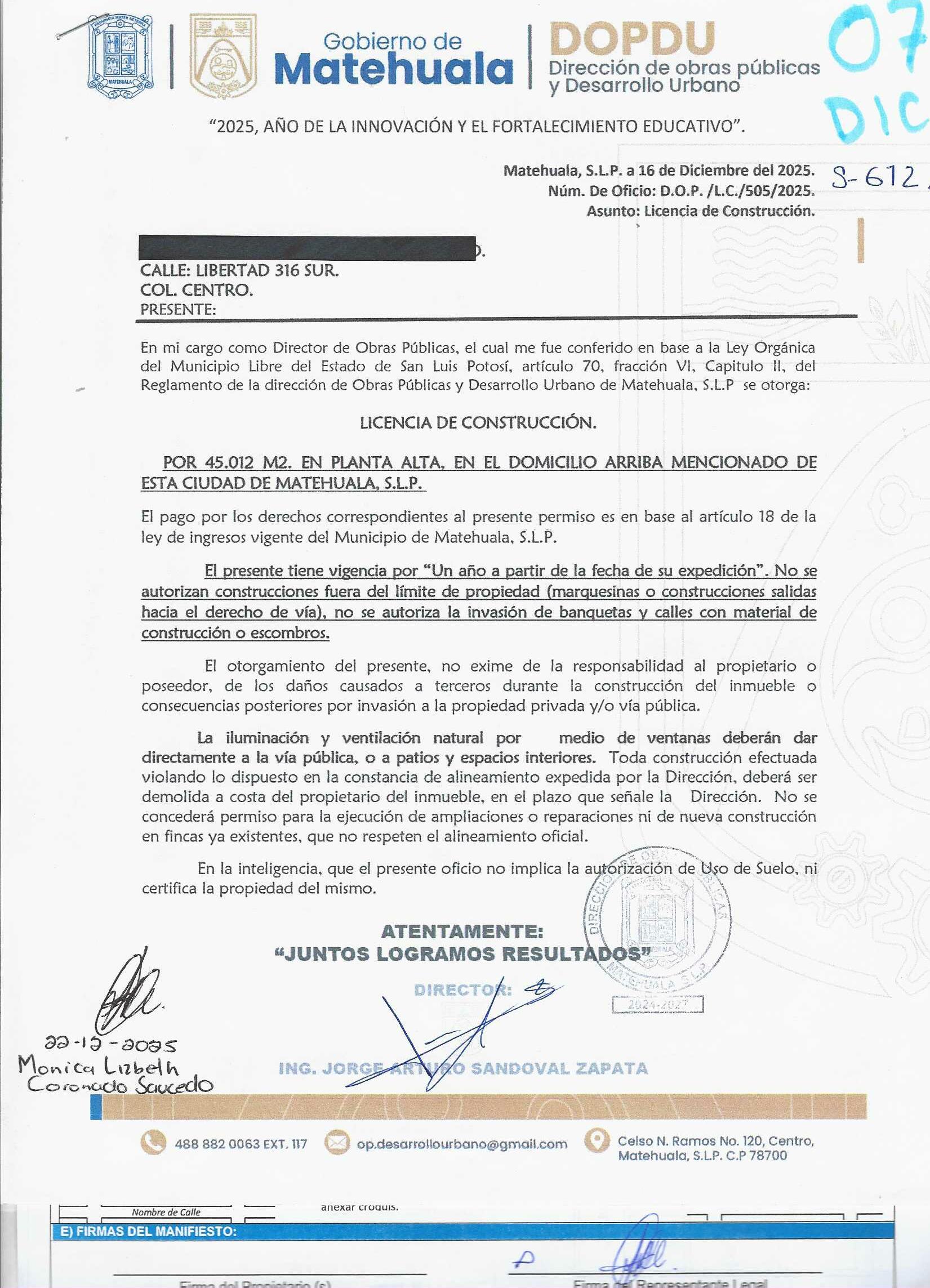 2025 01/12/2025 31/12/2025 DOP/LC/505/2025 CONSTRUCCION MONICA LIZBETH CORONADO SAUCEDO LIBERTAD Calle LIBERTAD 316 SUR Colonia CENTRO 20 MATEHUALA 20 MATEHUALA 24 San Luis Potosí 78700 "http://www.cegaipslp.org.mx/HV2025.nsf/nombre_de_la_vista/06C44A9392B9715106258D76006FBE58/$File/07+MONICA+LIZBETH+CORONADO+SAUCEDO.jpg " 22/12/2025 22/12/2026 HABITACIONAL "http://www.cegaipslp.org.mx/HV2025.nsf/nombre_de_la_vista/CE79C82F2ED16AF106258D760071674F/$File/07+MONICA+LIZBETH+CORONADO+SAUCEDO.jpg " DIRECCIÓN DE OBRAS PÚBLICAS Y DESARROLLO URBANO 05/01/2026 COBRO NORMAL