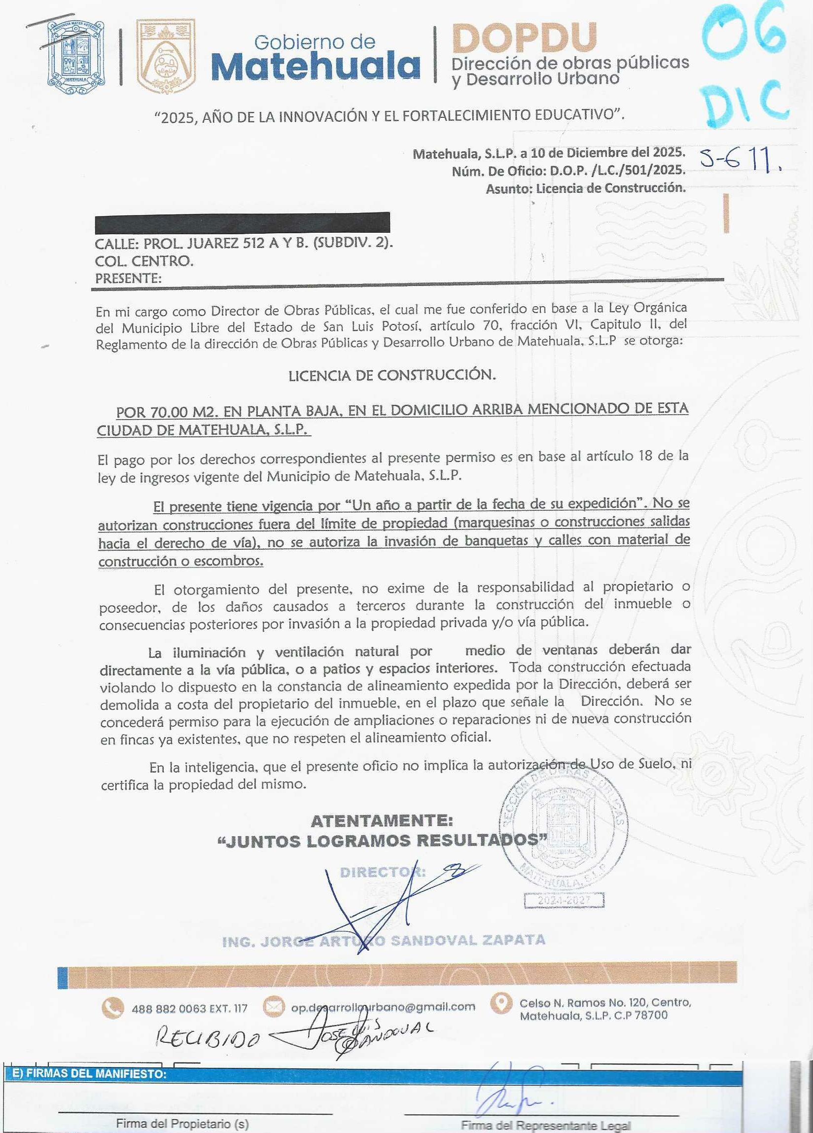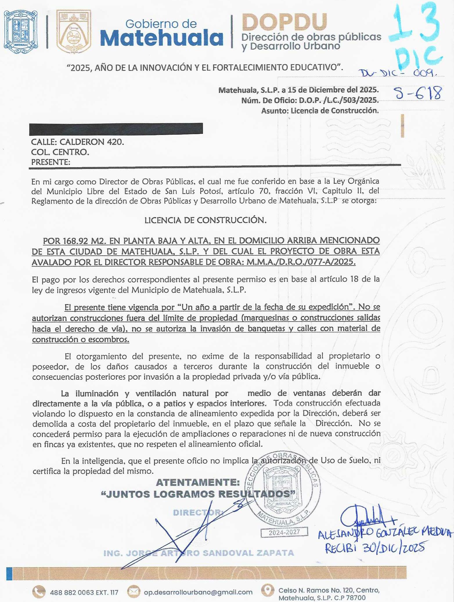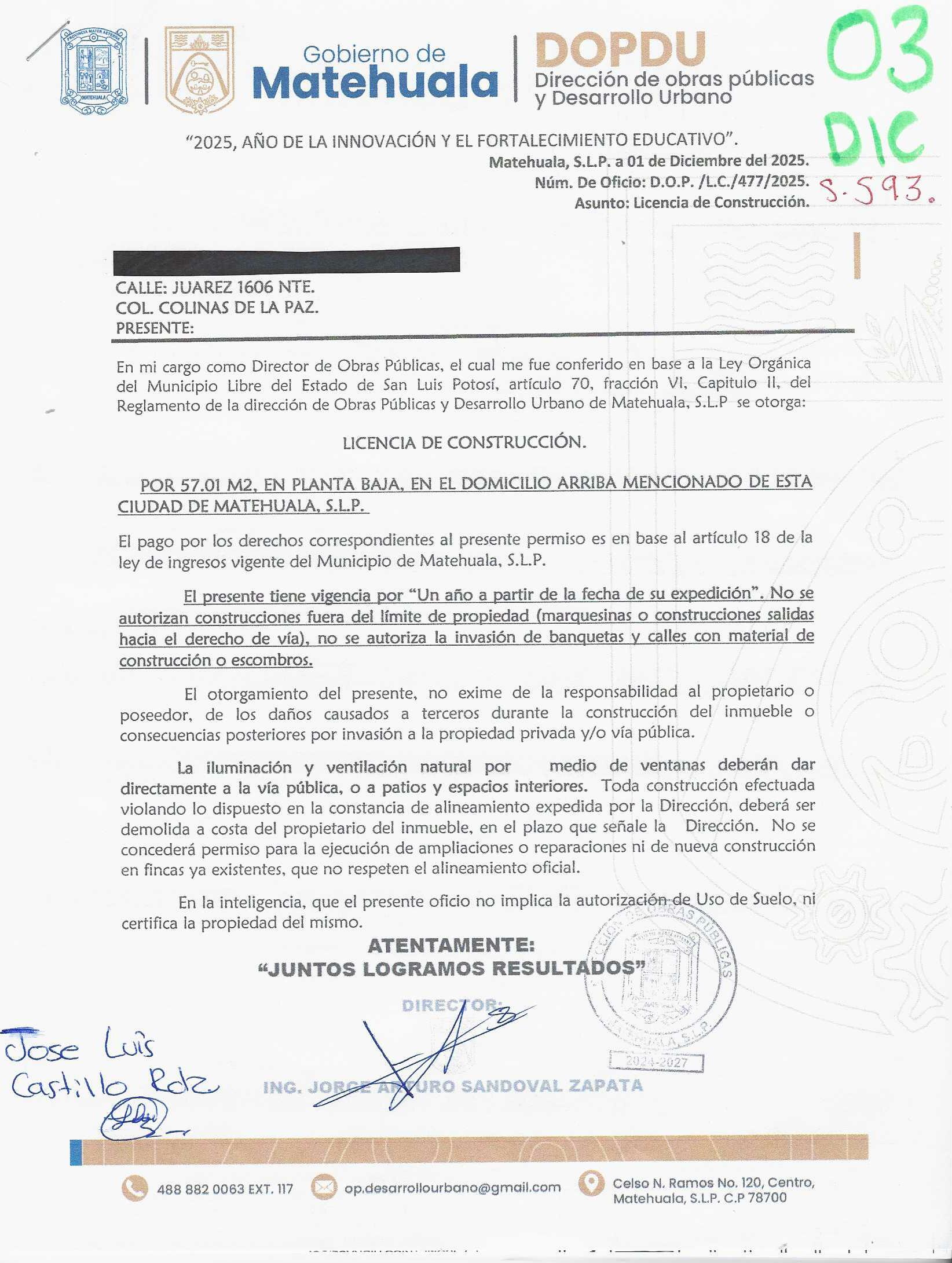 2025 01/12/2025 31/12/2025 DOP/LC/477/2025 CONSTRUCCION JAVIER MENDOZA TORRES JUAREZ Calle JUAREZ 1606 NTE Colonia COLINAS DE LA PAZ 20 MATEHUALA 20 MATEHUALA 24 San Luis Potosí 78722 "http://www.cegaipslp.org.mx/HV2025.nsf/nombre_de_la_vista/2647C5872A27066B06258D76006F95AA/$File/03+JAVIER+MENDOZA+TORRES.jpg " 1/12/2025 1/12/2026 HABITACIONAL "http://www.cegaipslp.org.mx/HV2025.nsf/nombre_de_la_vista/2FC9749FA138638306258D7600713E7D/$File/03+JAVIER+MENDOZA+TORRES.jpg " DIRECCIÓN DE OBRAS PÚBLICAS Y DESARROLLO URBANO 05/01/2026 COBRO NORMAL