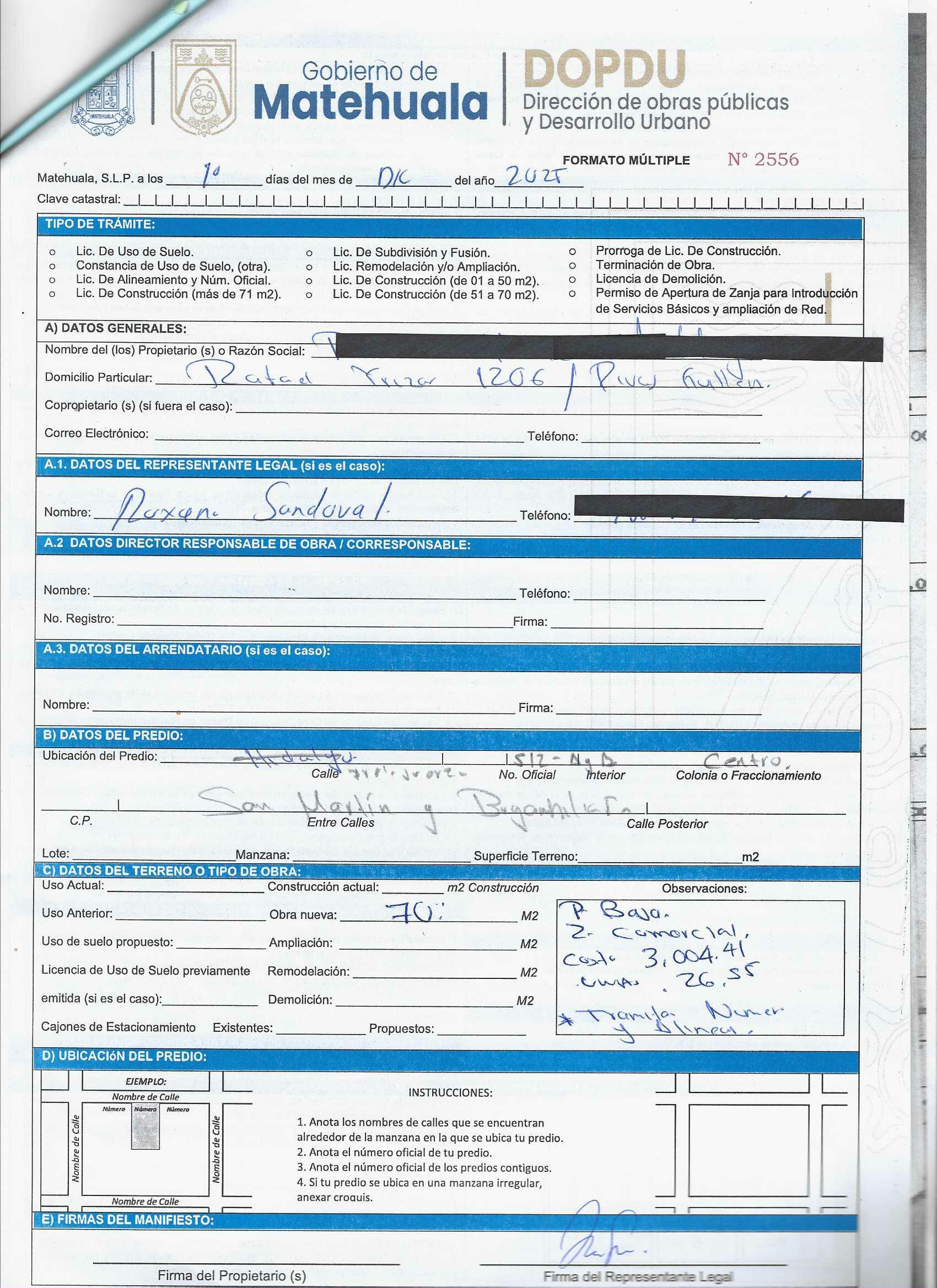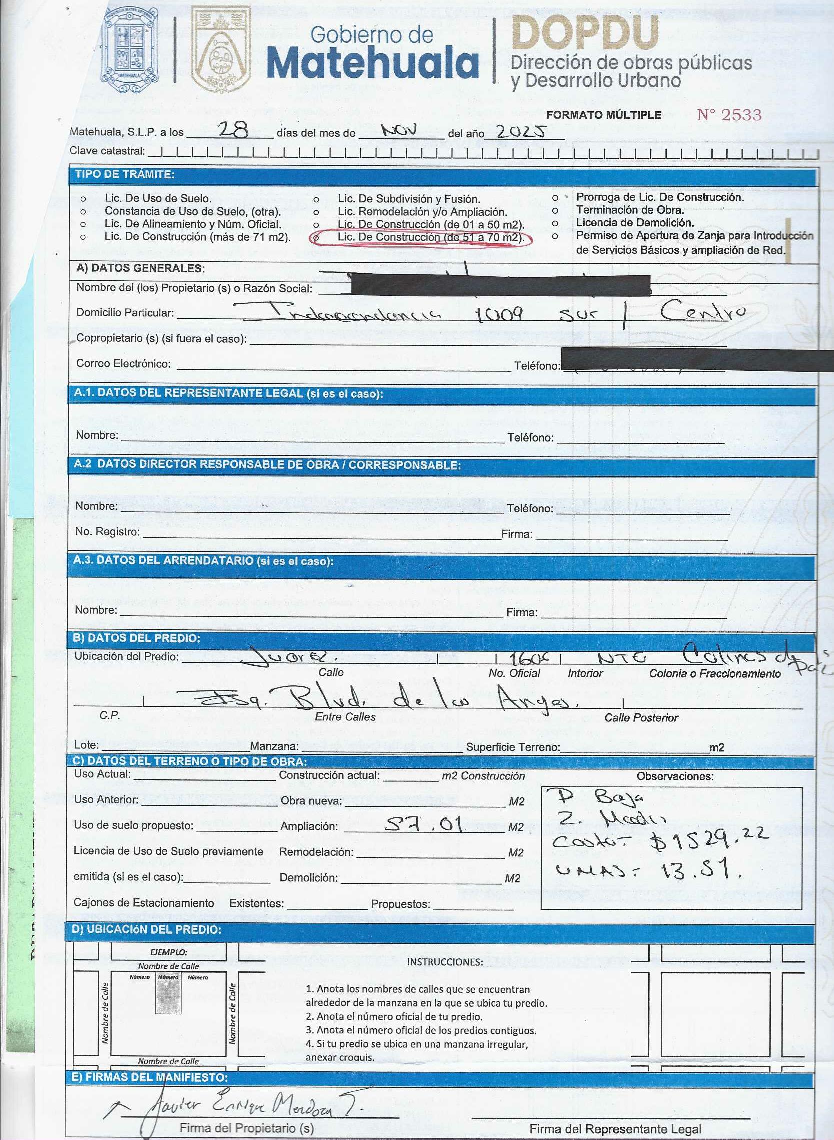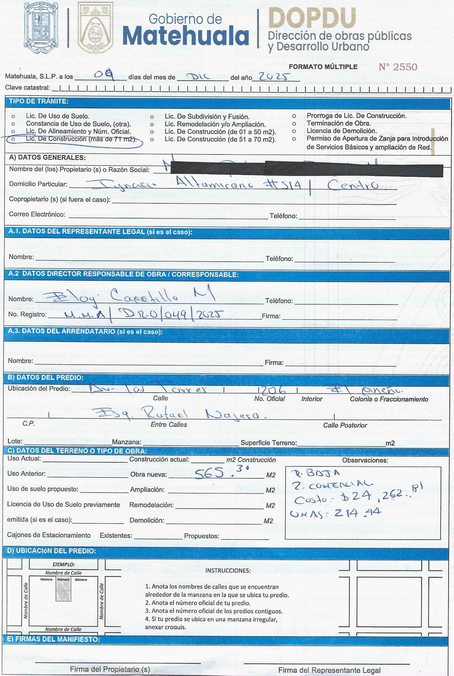 2025 01/12/2025 31/12/2025 DOP/LC/477/2025 CONSTRUCCION JAVIER MENDOZA TORRES JUAREZ Calle JUAREZ 1606 NTE Colonia COLINAS DE LA PAZ 20 MATEHUALA 20 MATEHUALA 24 San Luis Potosí 78722 "http://www.cegaipslp.org.mx/HV2025.nsf/nombre_de_la_vista/2647C5872A27066B06258D76006F95AA/$File/03+JAVIER+MENDOZA+TORRES.jpg " 1/12/2025 1/12/2026 HABITACIONAL "http://www.cegaipslp.org.mx/HV2025.nsf/nombre_de_la_vista/2FC9749FA138638306258D7600713E7D/$File/03+JAVIER+MENDOZA+TORRES.jpg " DIRECCIÓN DE OBRAS PÚBLICAS Y DESARROLLO URBANO 05/01/2026 COBRO NORMAL