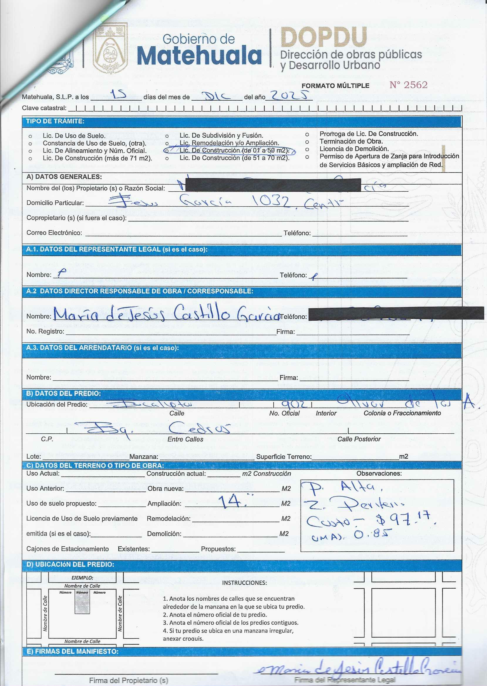 2025 01/12/2025 31/12/2025 DOP/LC/471/2025 CONSTRUCCION MA. DEL CARMEN MUÑIZ CASTILLO TRUENO Calle TRUENO 101 0 Colonia SAN ANTONIO 20 MATEHUALA 20 MATEHUALA 24 San Luis Potosí 78784 "http://www.cegaipslp.org.mx/HV2025.nsf/nombre_de_la_vista/0FE1E4C41289117306258D76006EFC73/$File/02+MA.+DEL+CARMEN+MUÑIZ+CASTILLO.jpg " 25/11/2025 25-11-2026 HABITACIONAL "http://www.cegaipslp.org.mx/HV2025.nsf/nombre_de_la_vista/279167F5517237C206258D7600711FB4/$File/01+MARIA+DOLORES+HERNANDEZ+ORTIZ.jpg " DIRECCIÓN DE OBRAS PÚBLICAS Y DESARROLLO URBANO 05/01/2026 COBRO NORMAL
