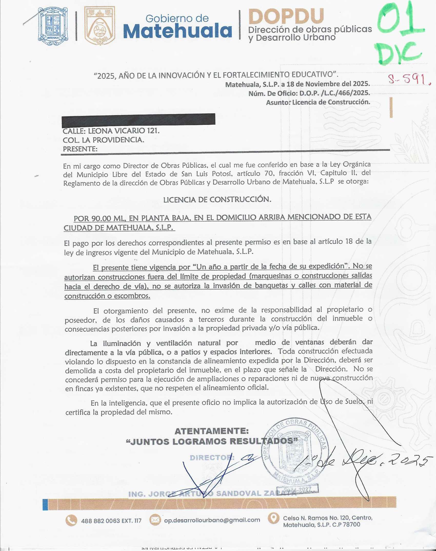 2025 01/12/2025 31/12/2025 DOP/LC/466/2025 CONSTRUCCION MARIA DOLORES HERNANDEZ ORTIZ LEONA VICARIO Calle LEONA VICARIO 121 0 Colonia LA PROVIDENCIA 20 MATEHUALA 20 MATEHUALA 24 San Luis Potosí 78796 "http://www.cegaipslp.org.mx/HV2025.nsf/nombre_de_la_vista/F648F066DE1C6DC106258D76006EEBFF/$File/01+MARIA+DOLORES+HERNANDEZ+ORTIZ.jpg " 19/11/2025 19/11/2026 HABITACIONAL "http://www.cegaipslp.org.mx/HV2025.nsf/nombre_de_la_vista/279167F5517237C206258D7600711FB4/$File/01+MARIA+DOLORES+HERNANDEZ+ORTIZ.jpg " DIRECCIÓN DE OBRAS PÚBLICAS Y DESARROLLO URBANO 05/01/2026 20 % DESCUENTO